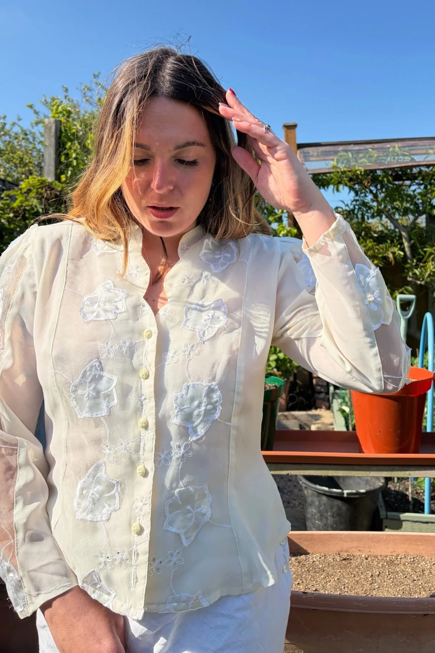 Wowzaz trouserz! This blouse is such an eye catching piece. I adore the full collar that falls so beautifully. It wraps around the ribs and has little poppers to fasten.