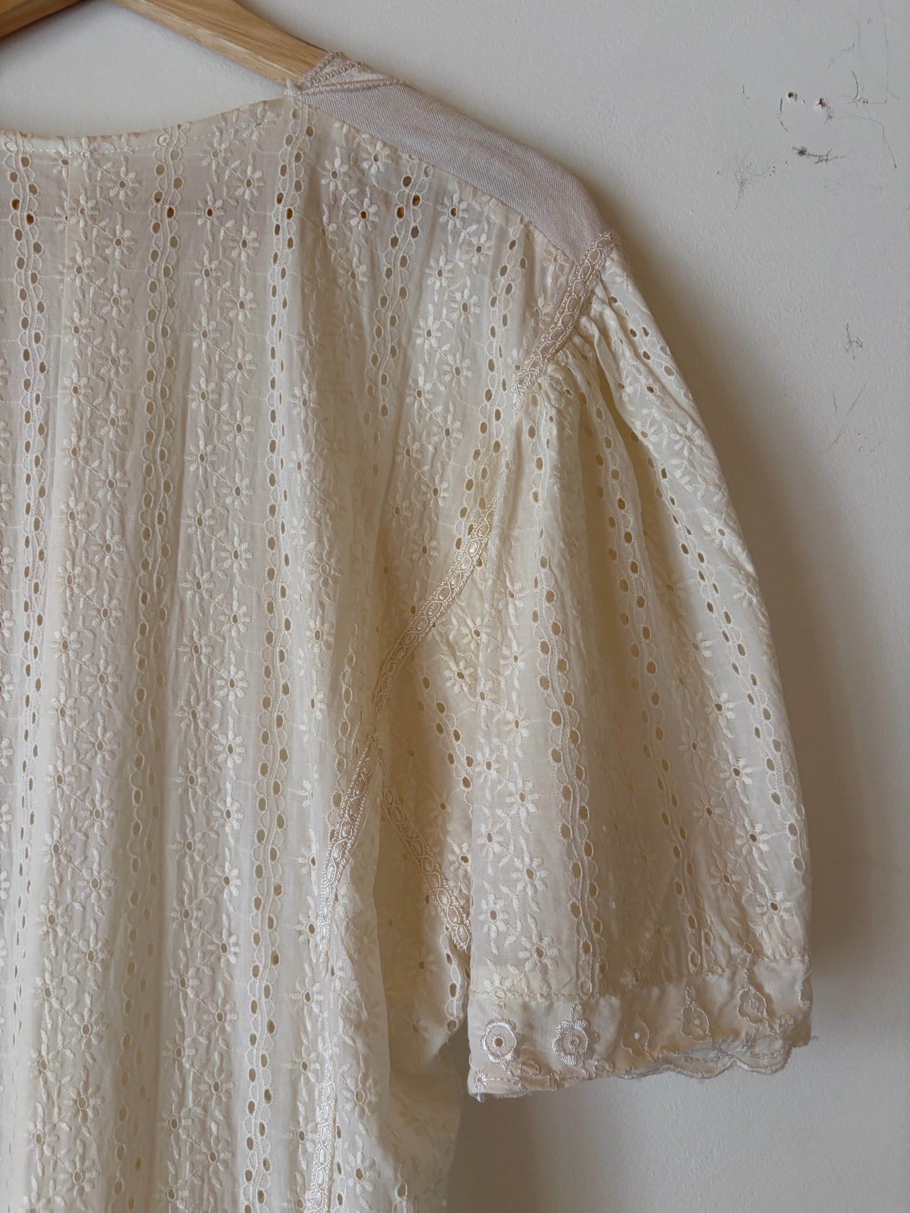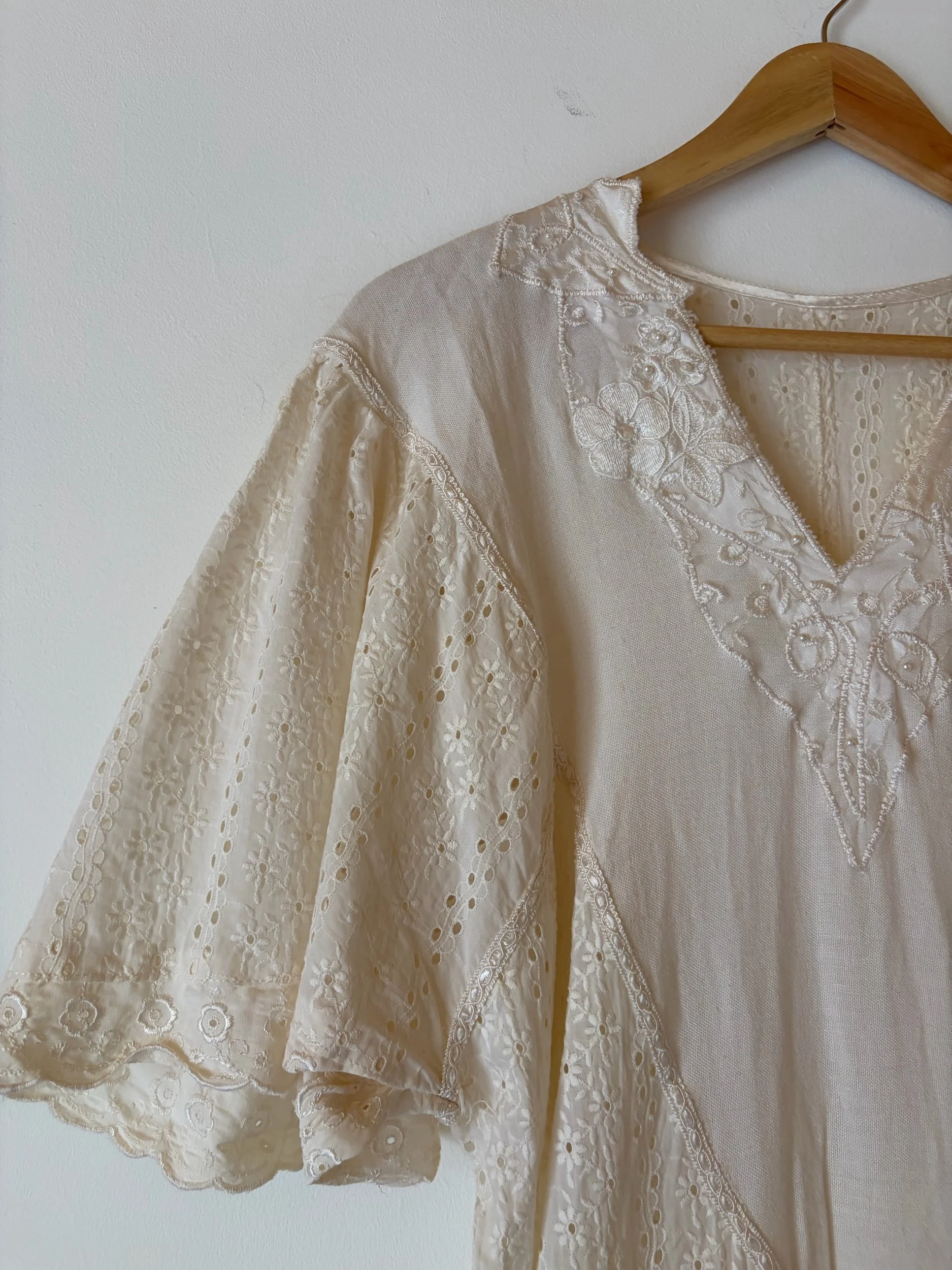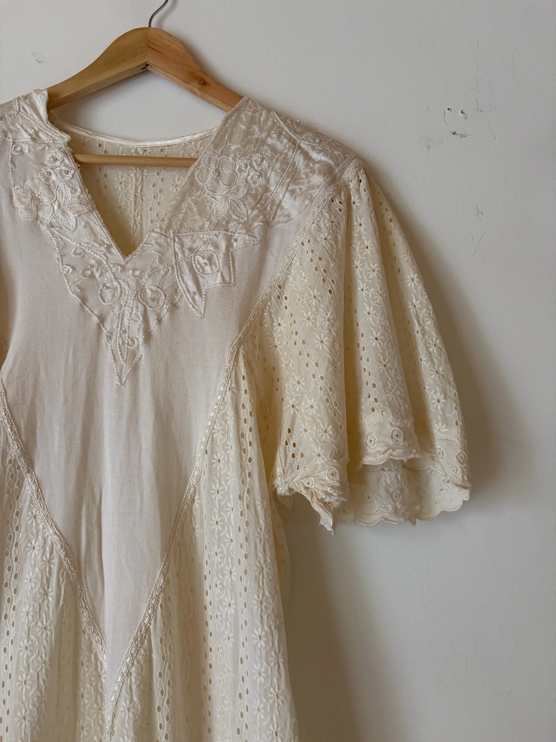 I love the shape and make of this dress! It’s handmade , most likely an 80s piece made into a 20s pattern. The broderie anglaise and satin piping gives it such a classy feel. Skirt has a fish tail shape.