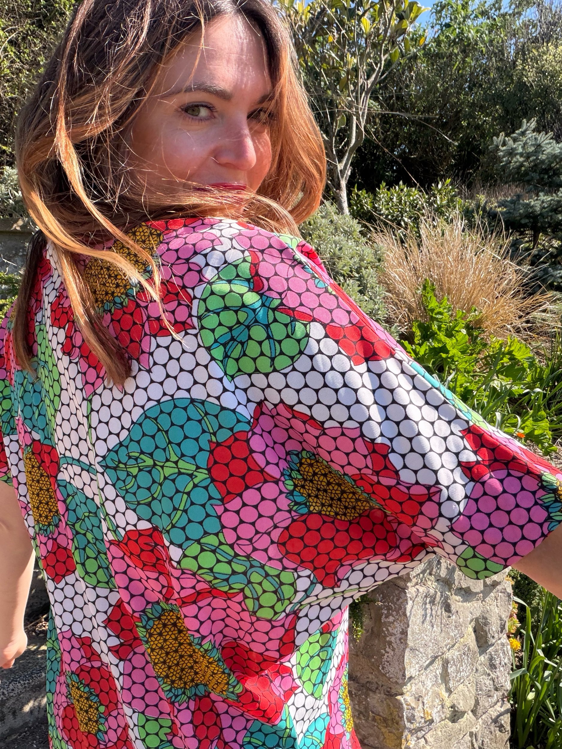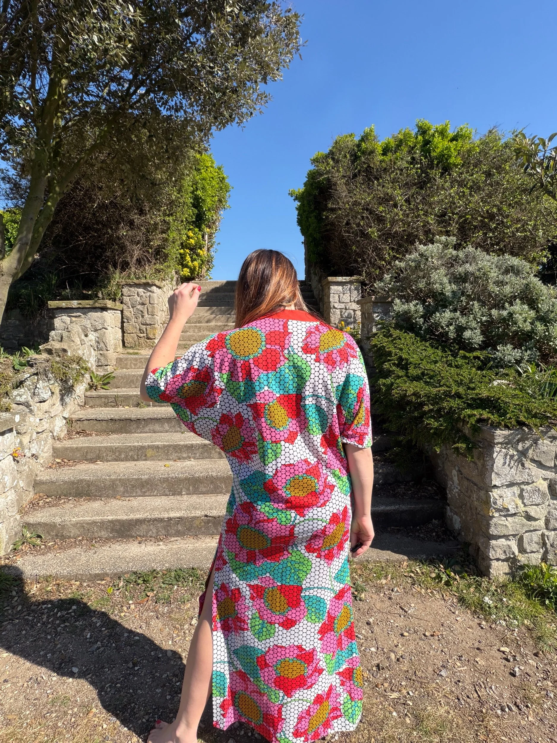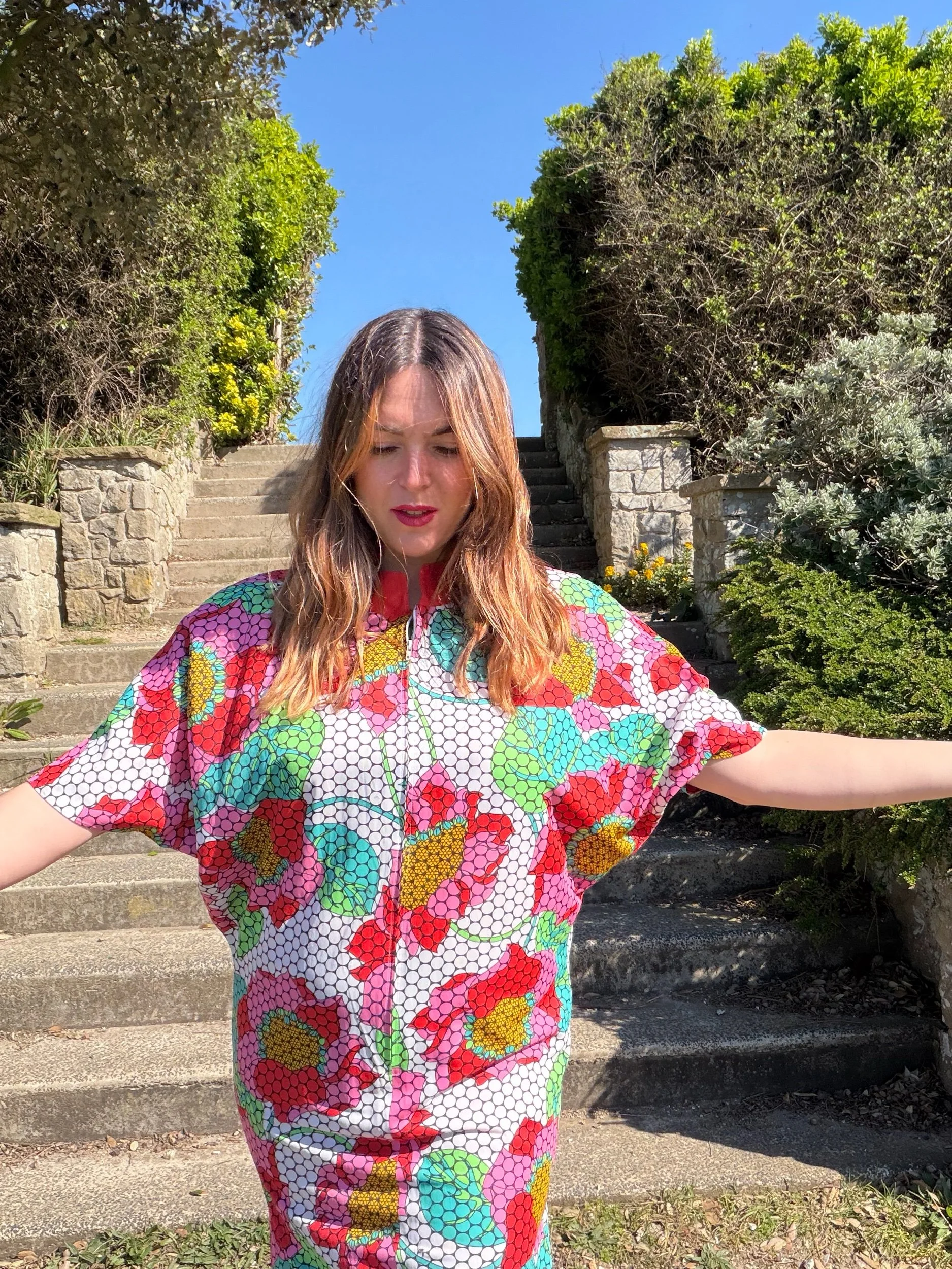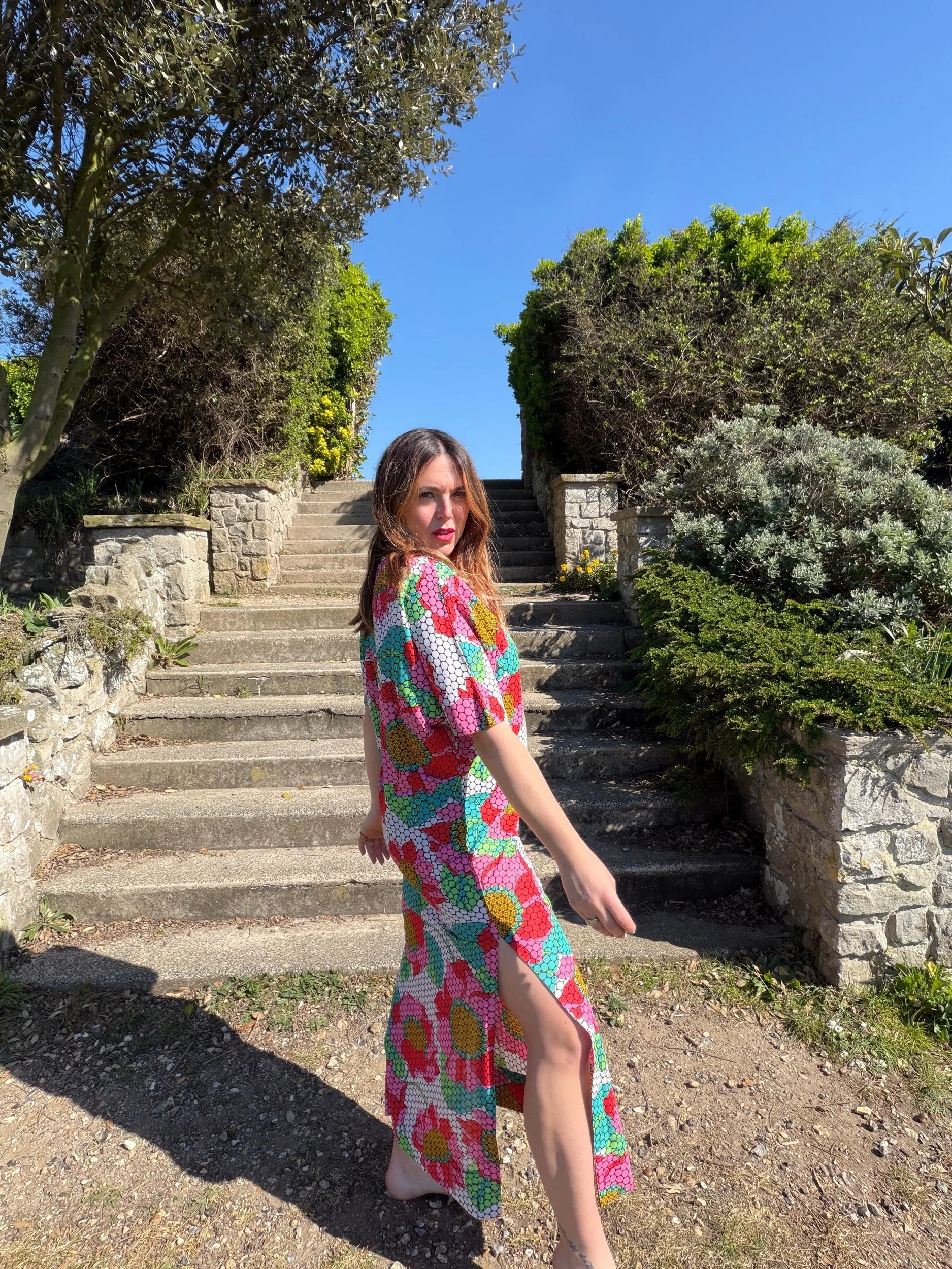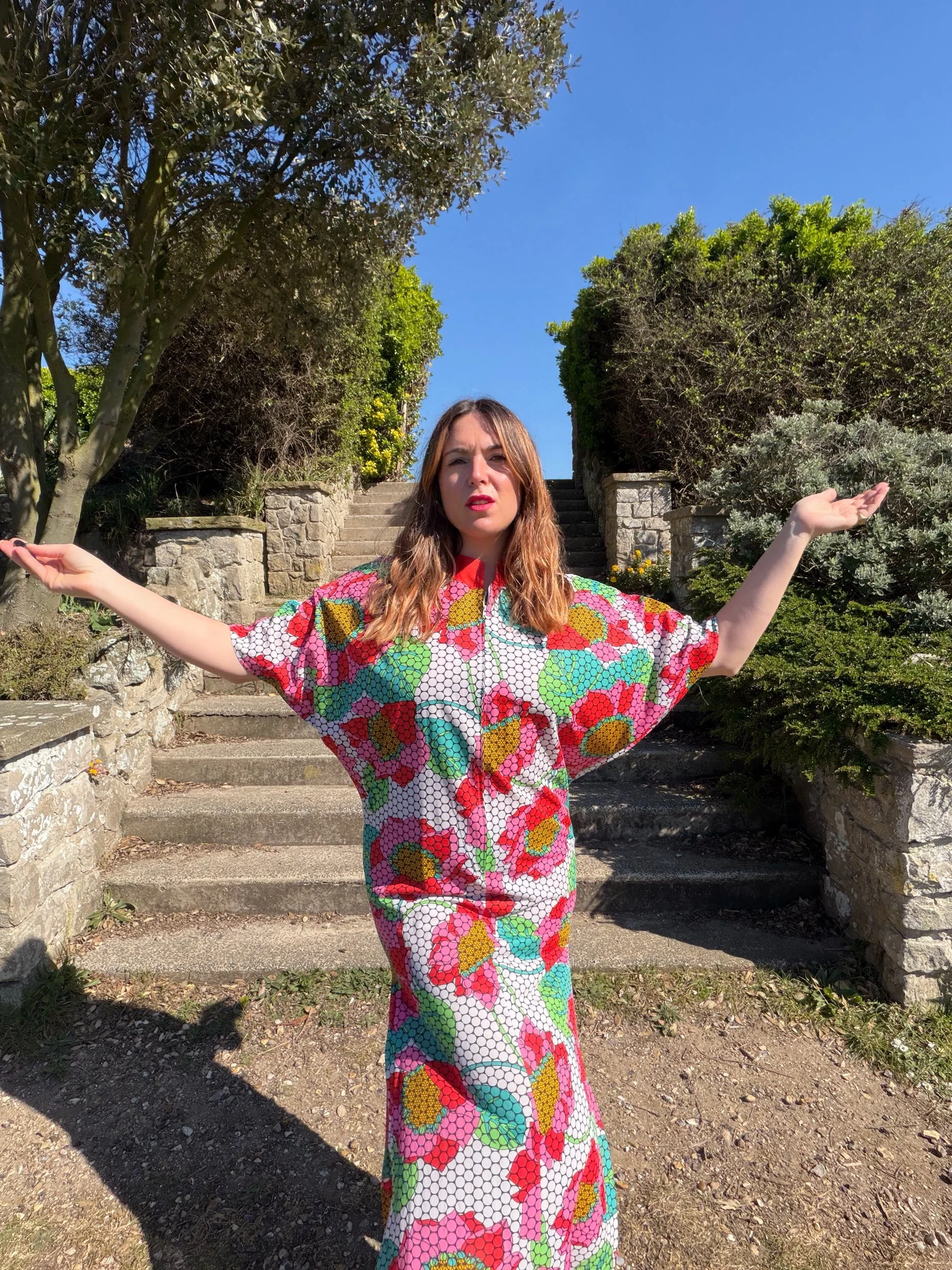 Just wow! They don’t make em like this anymore. An original 1970s kaftan dress with the most beautiful polkadot- hiveeqsue print. Love the enlarged florals and bold colour palette. Quarter zip at the front and slits to the side.