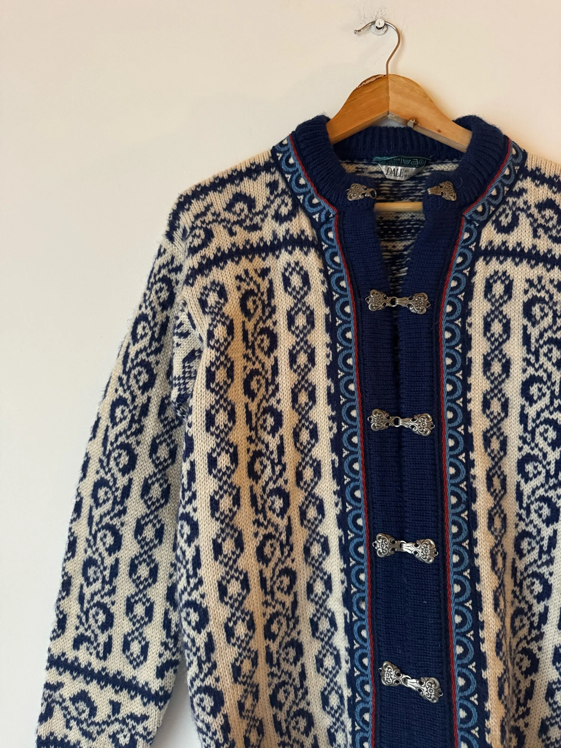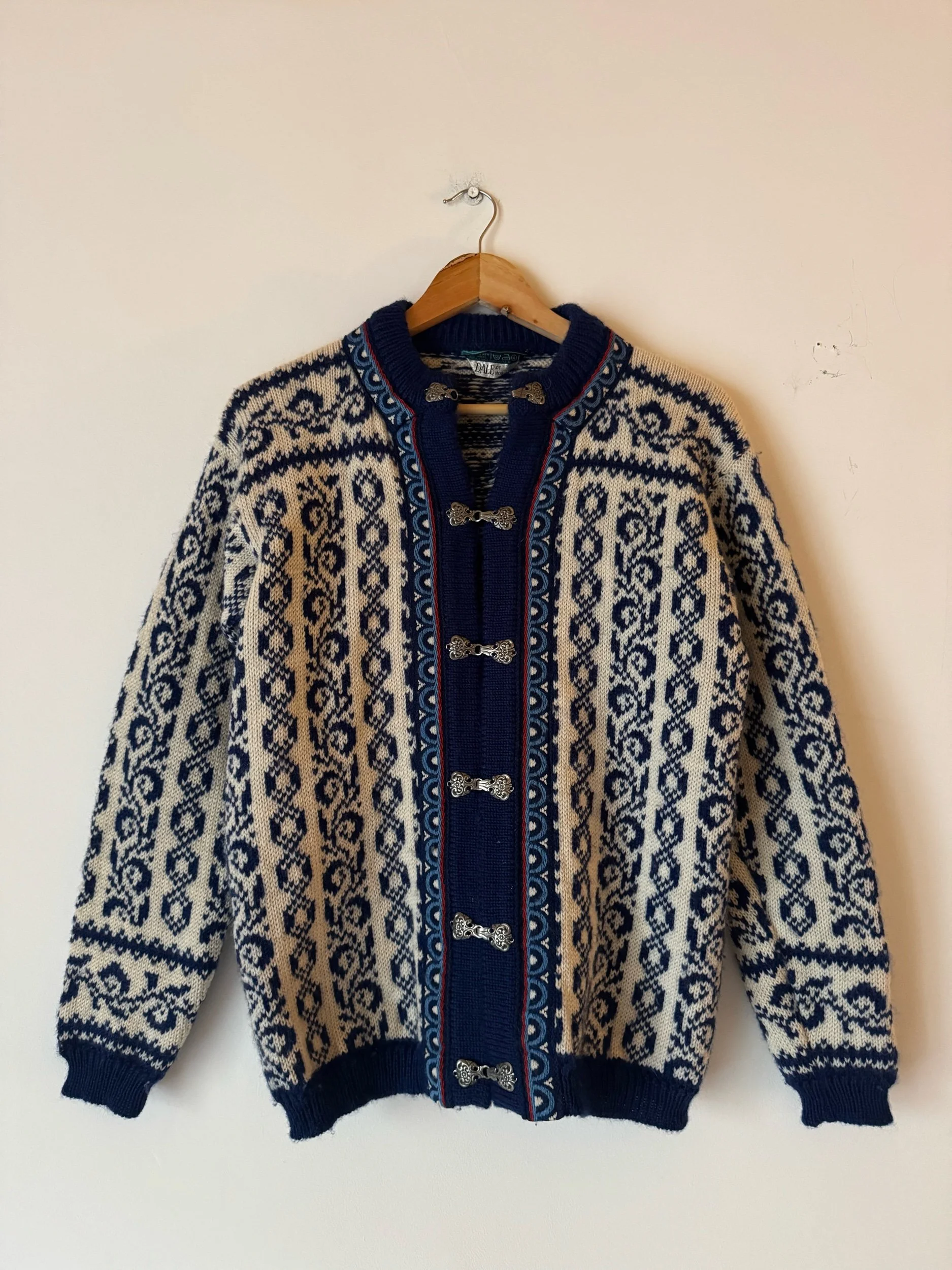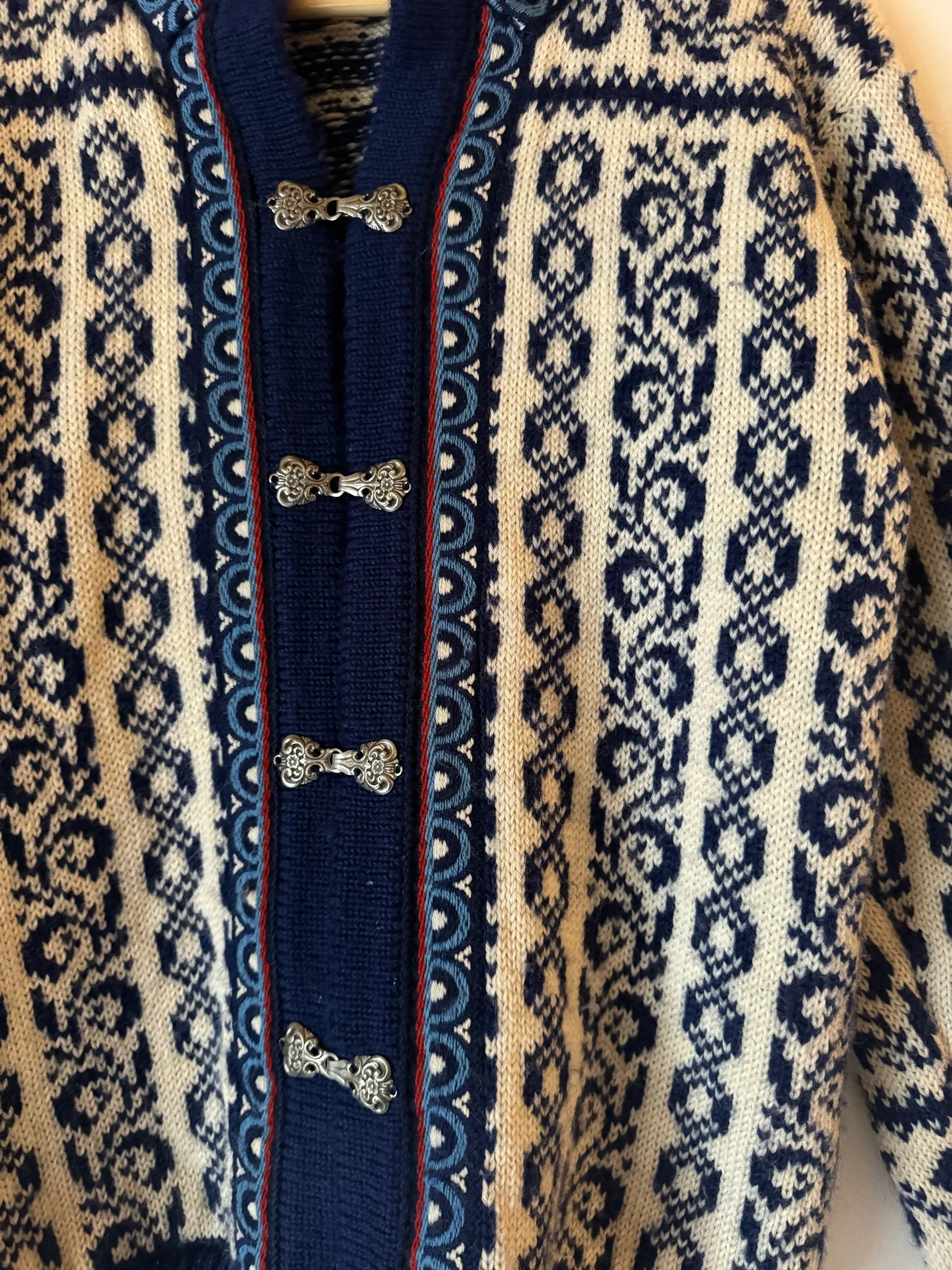 Classic Nordic knit in classic blue and white. “ Dale of Norway” Which is a super soft after brand. Silver clasp detailing. A perfect festive piece which also lends itself to beyond Christmas!