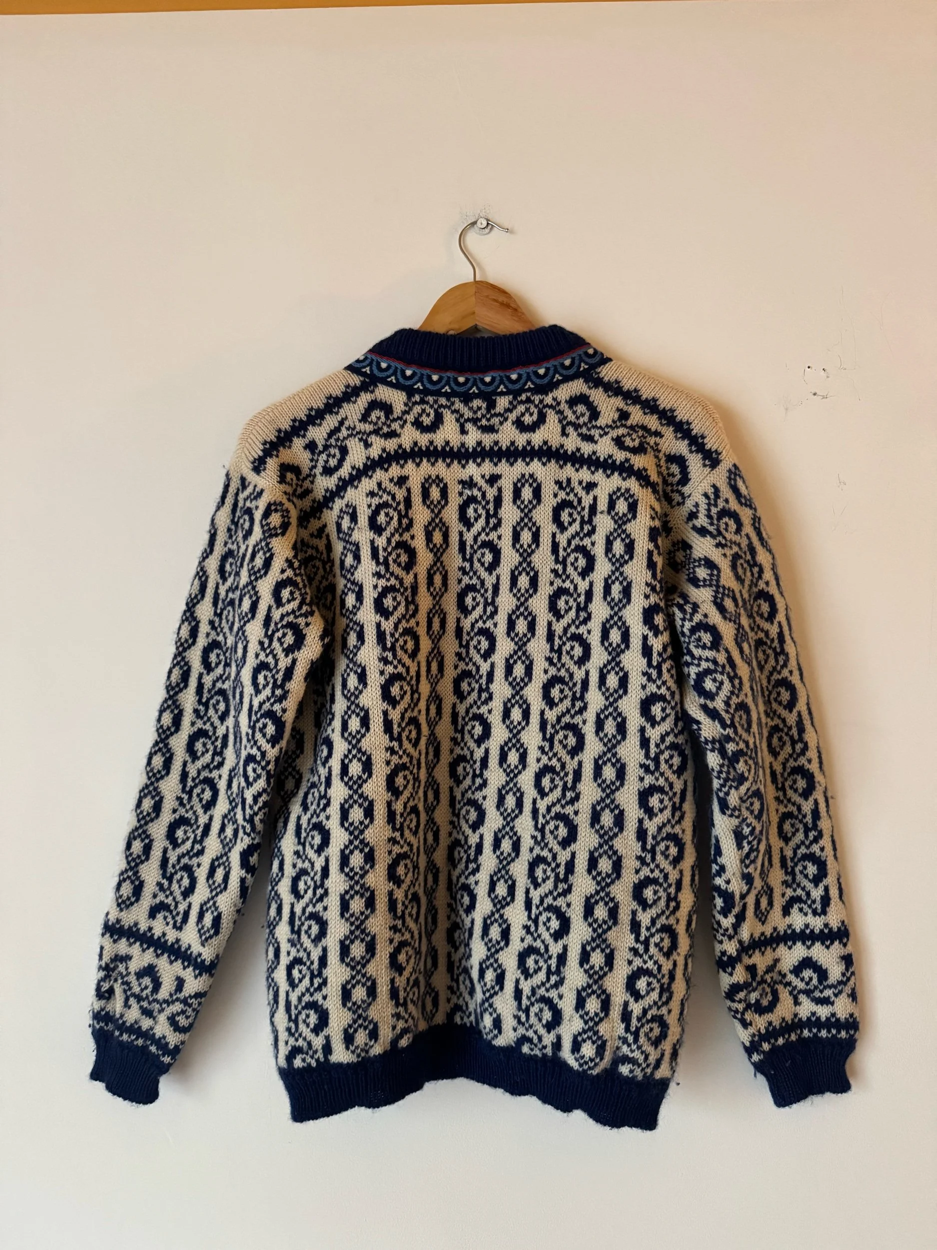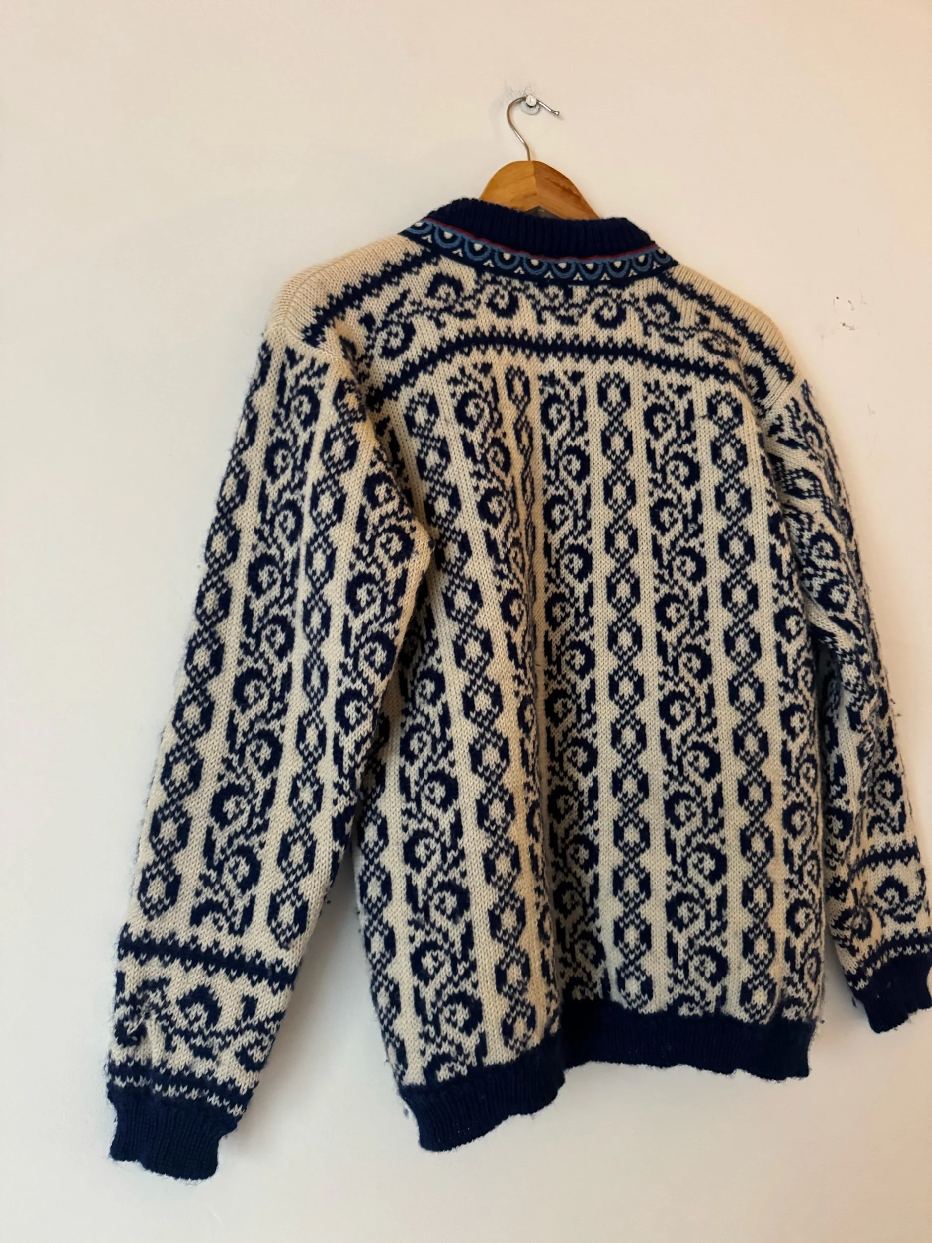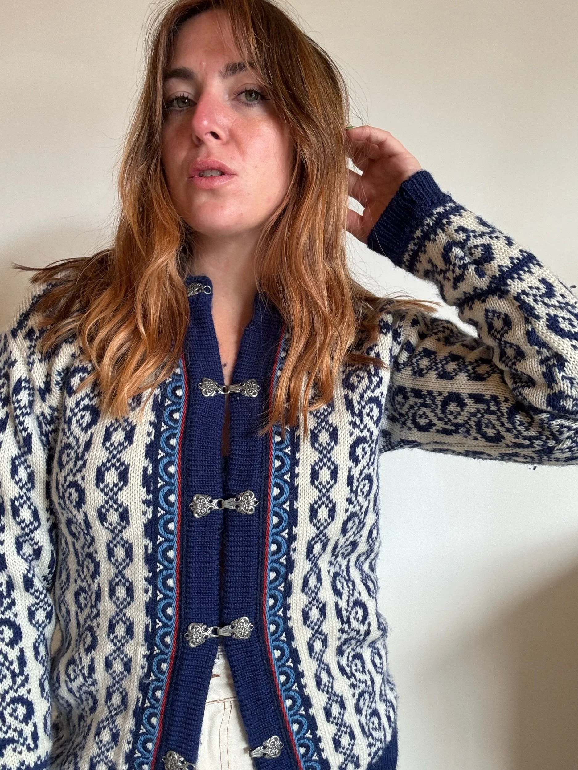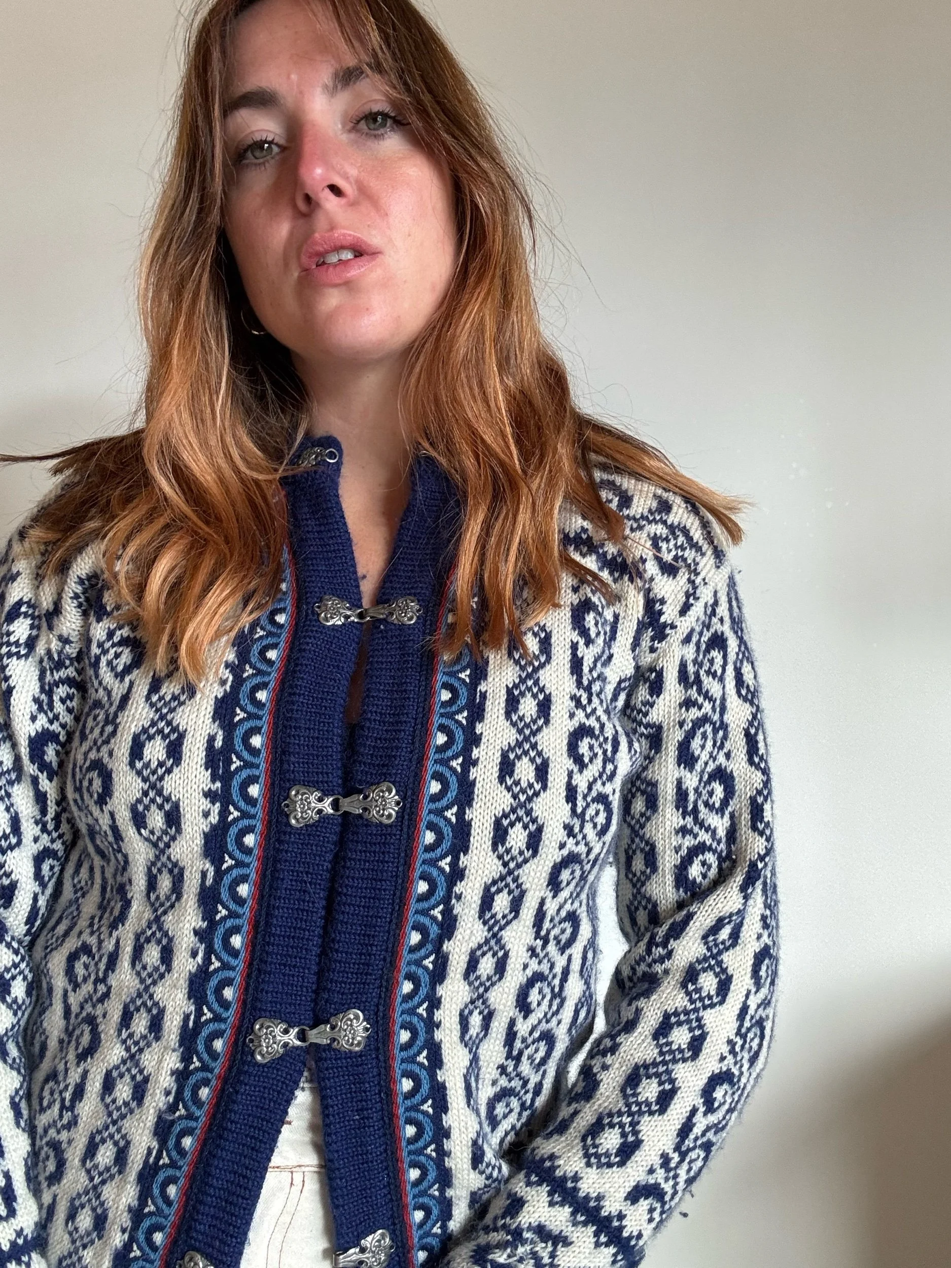 Classic Nordic knit in classic blue and white. “ Dale of Norway” Which is a super soft after brand. Silver clasp detailing. A perfect festive piece which also lends itself to beyond Christmas!