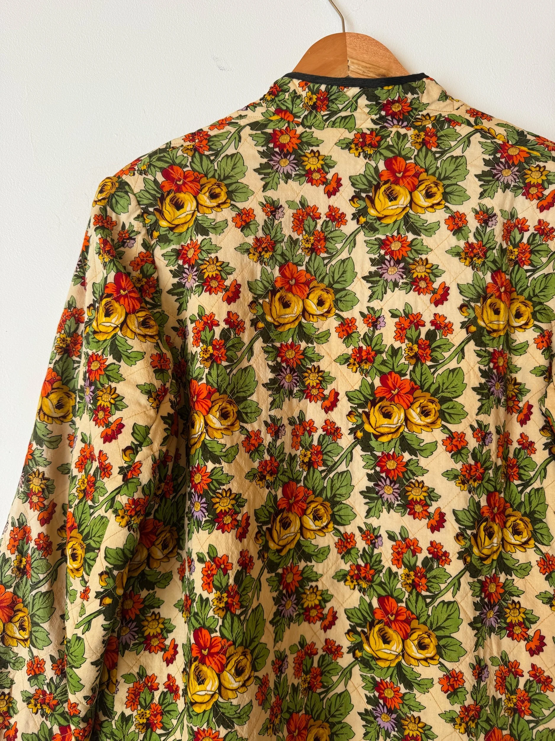 Insane 70s jacket made with the most beautiful silk : it’s feels absolutely glorious and so soft. The garden esque pattern really pops and the florals are so beautiful up close.