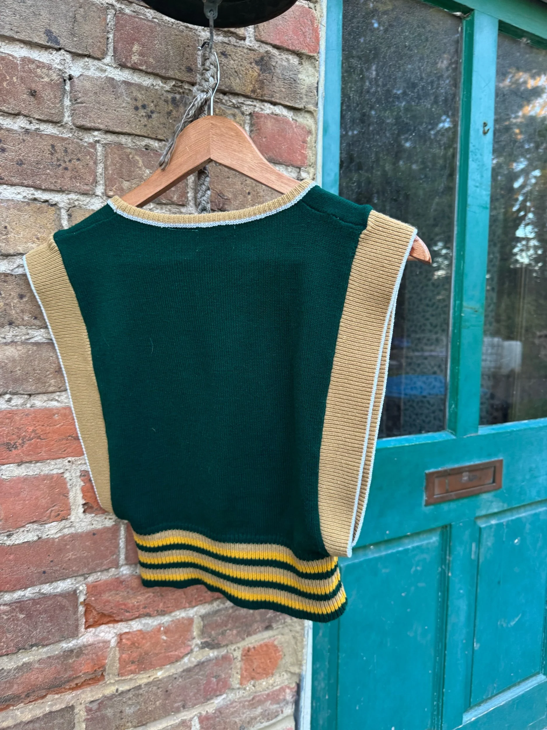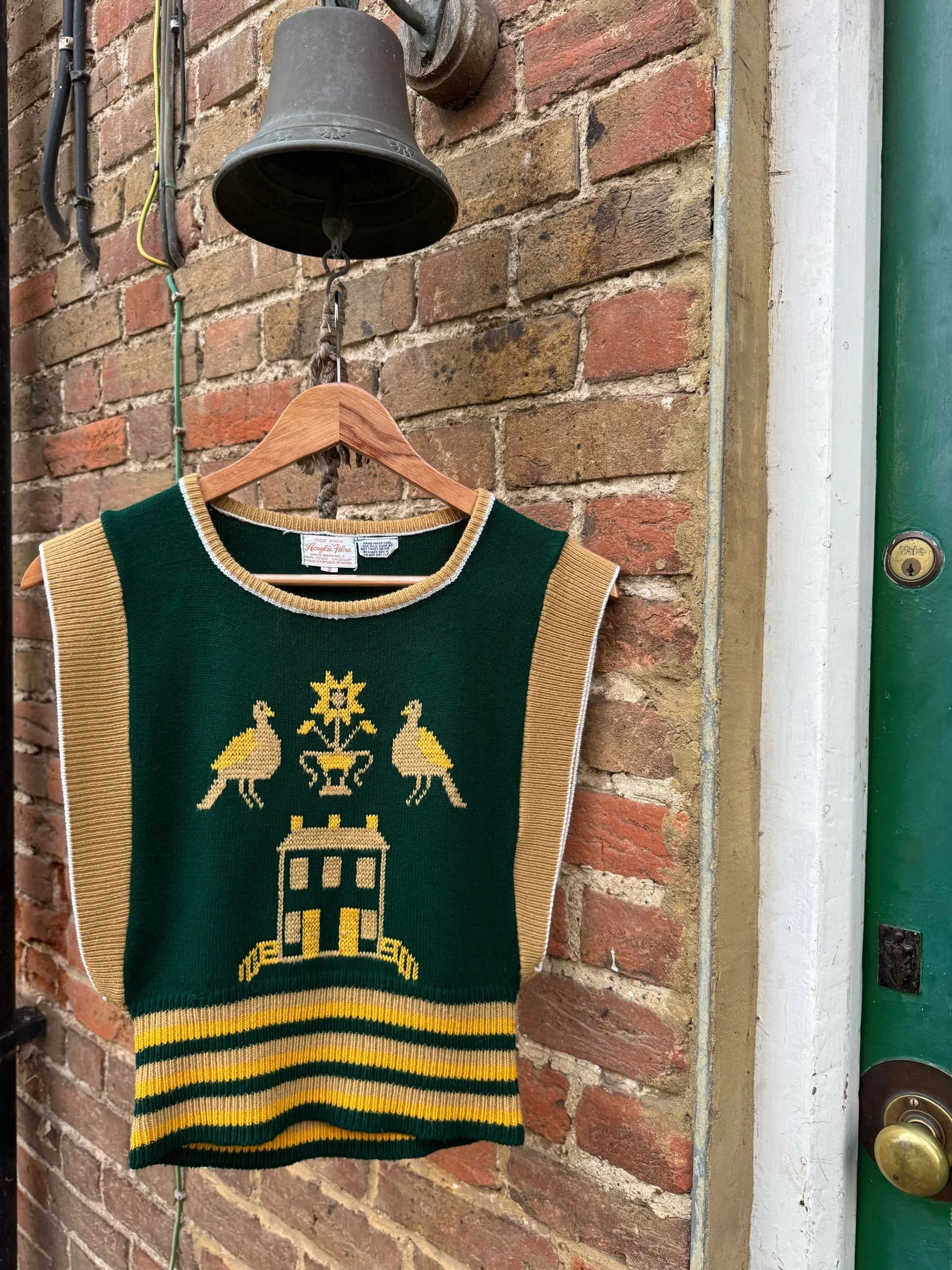 Beautiful 70s tank- Austrian vibes. Green and golden yellow stitching. Cute little birds and houses motifs. Looks fab styled over a white balloon sleeve blouse
