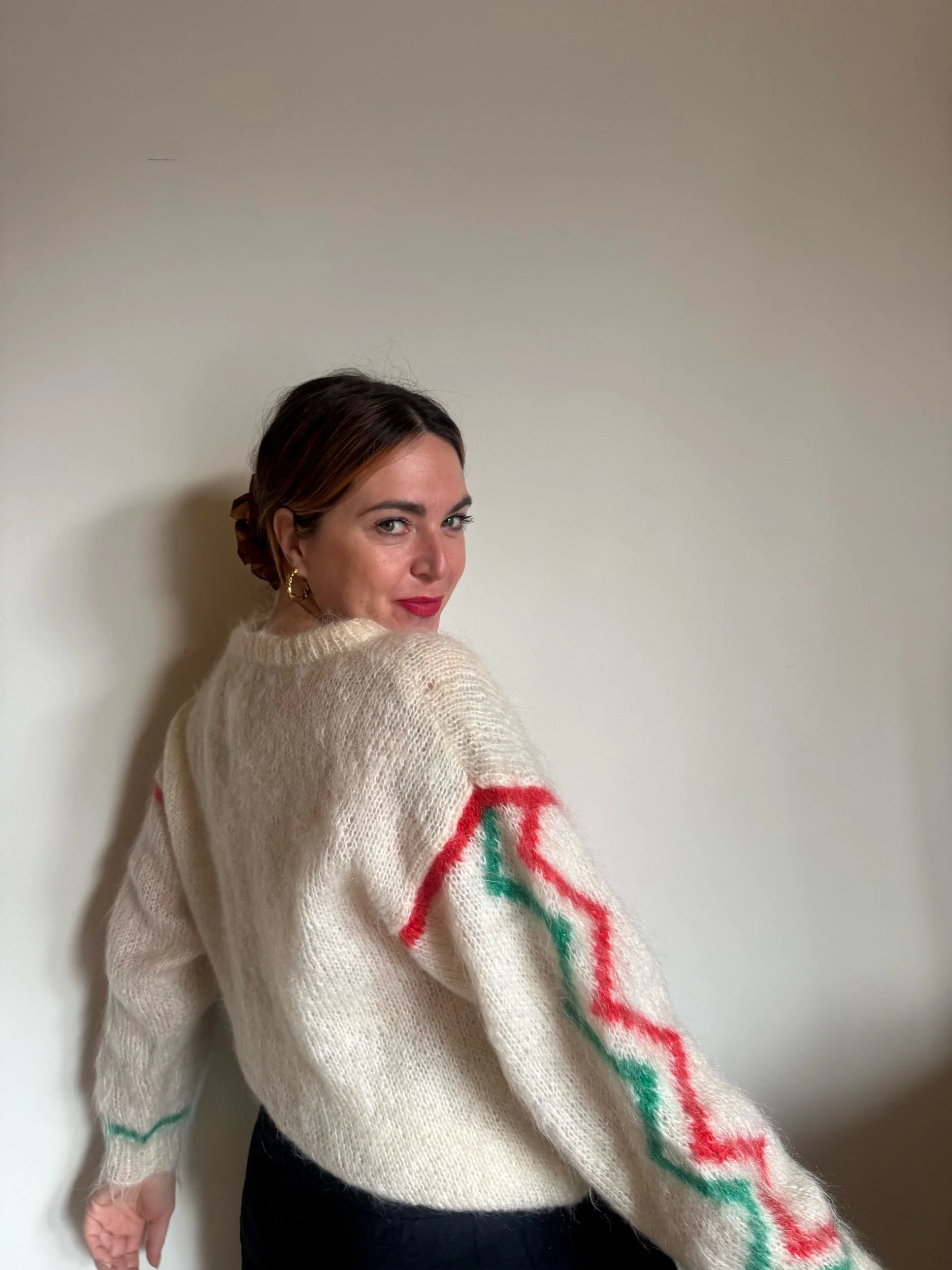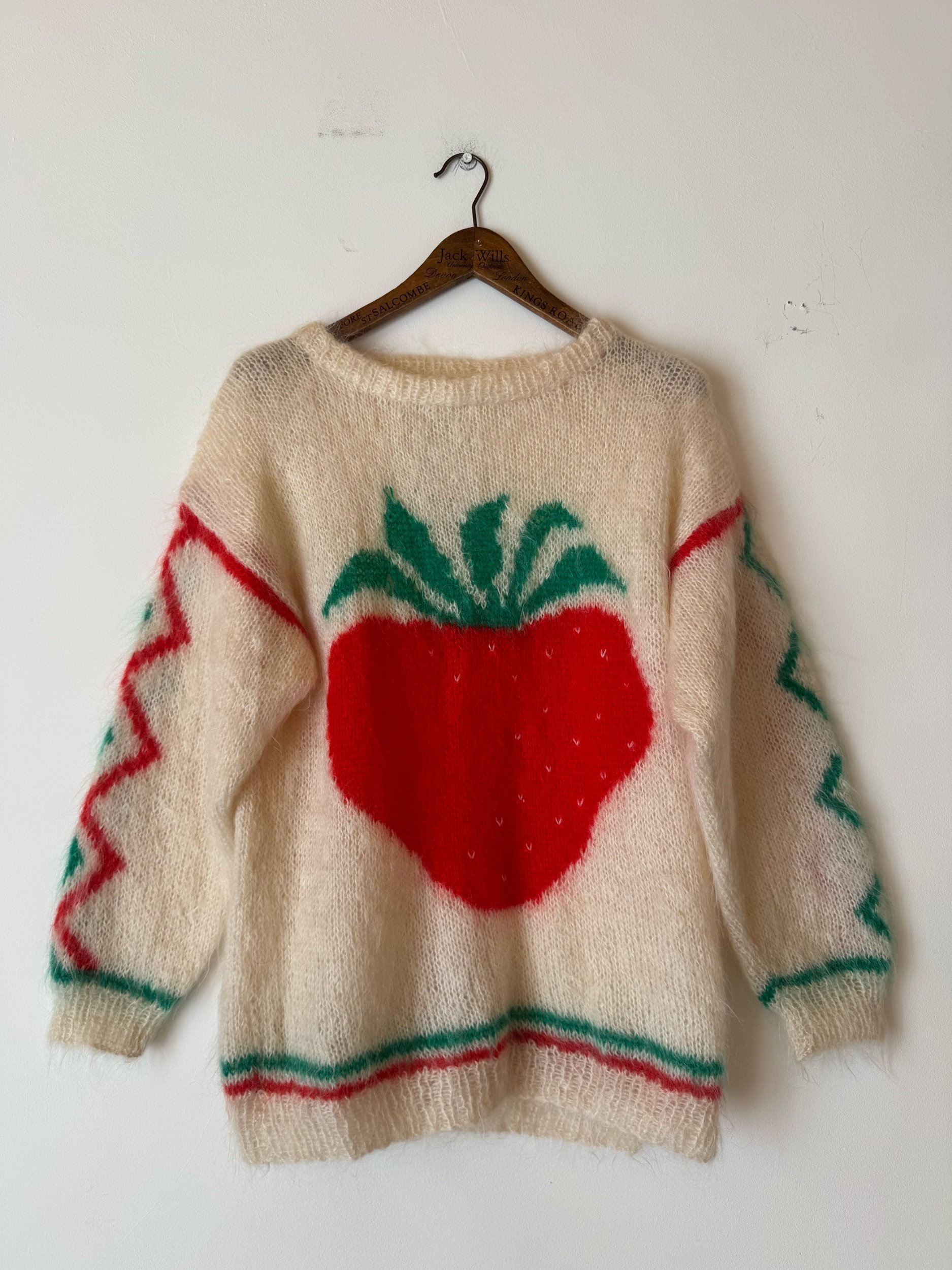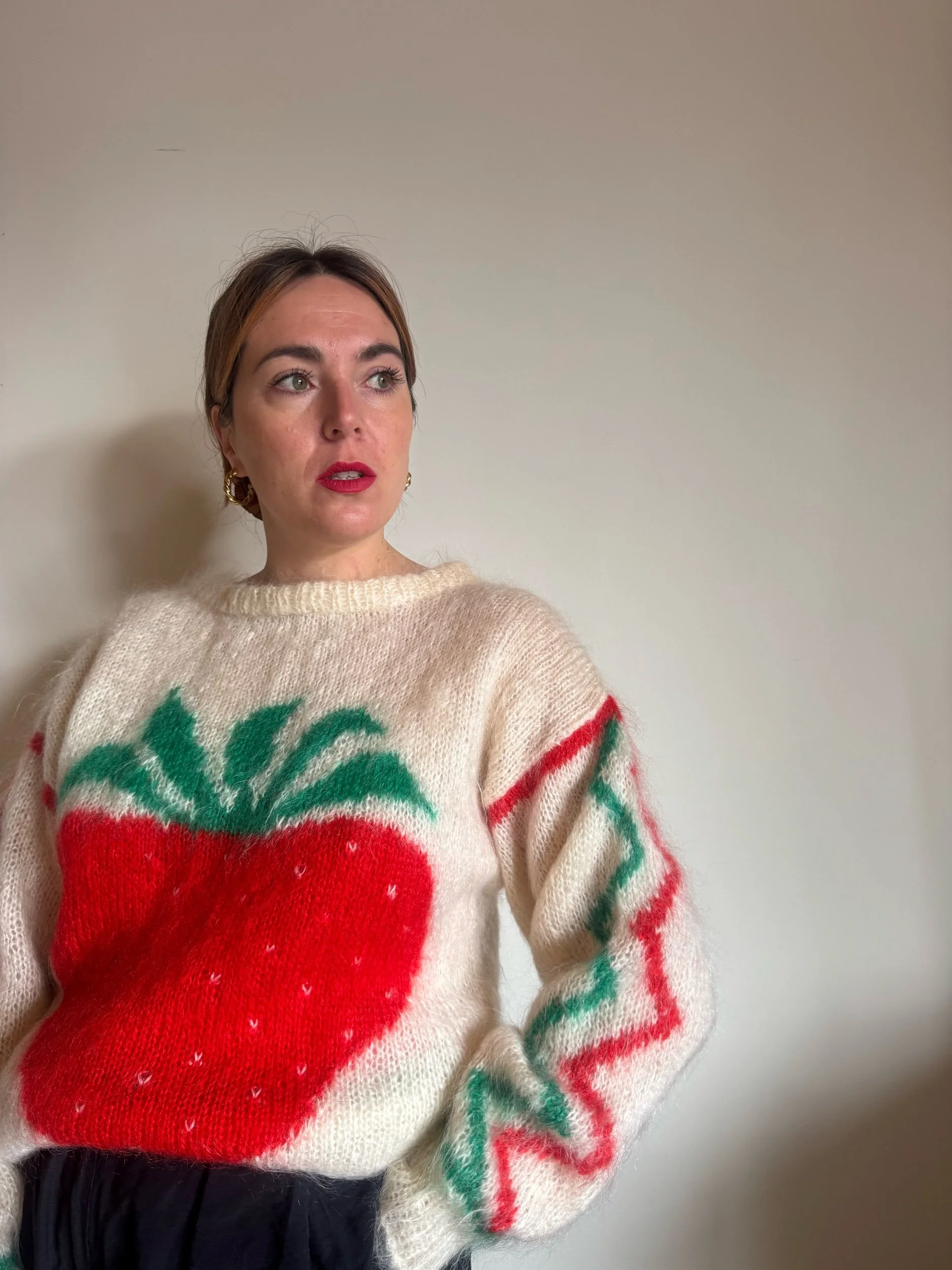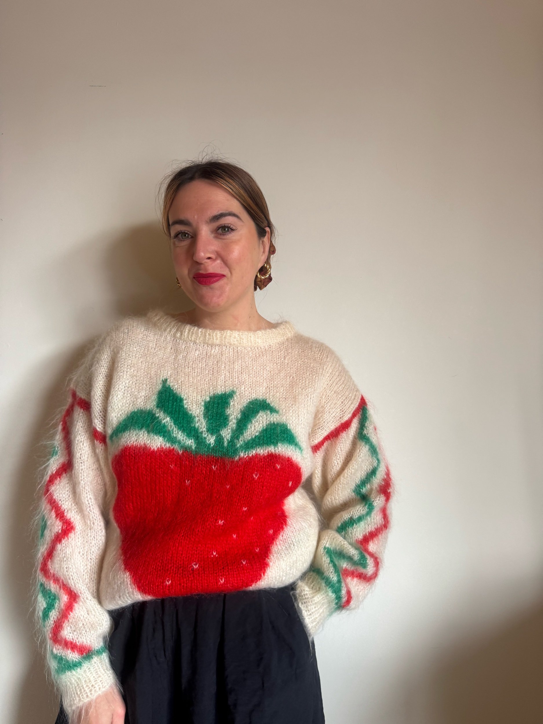 Stunning 80s handknitted jumper. The giant strawberry and that zig zag line work is just the best! She’s the right amount of fuzzy and the perfect shape to style with a float dress/ skirt