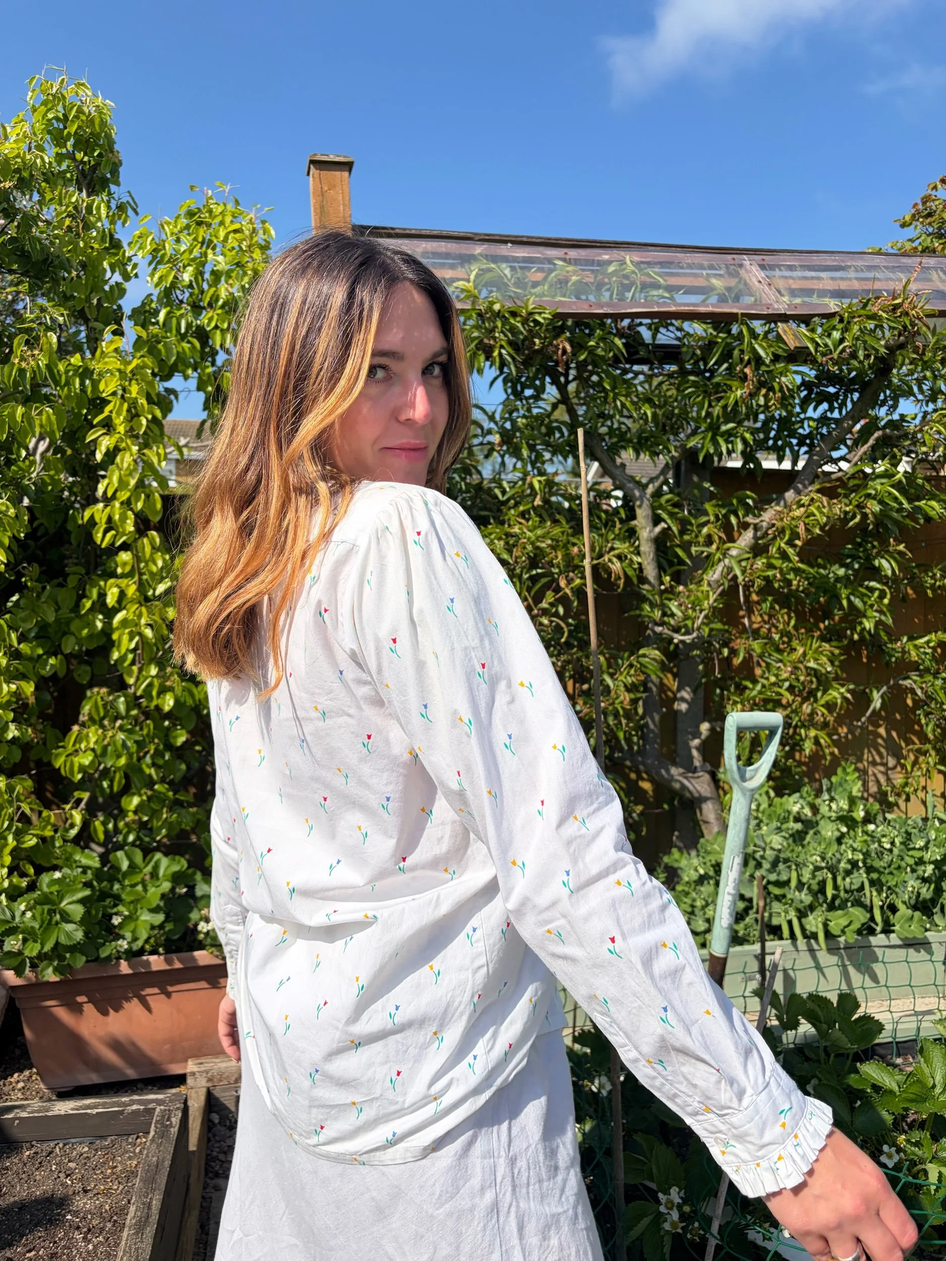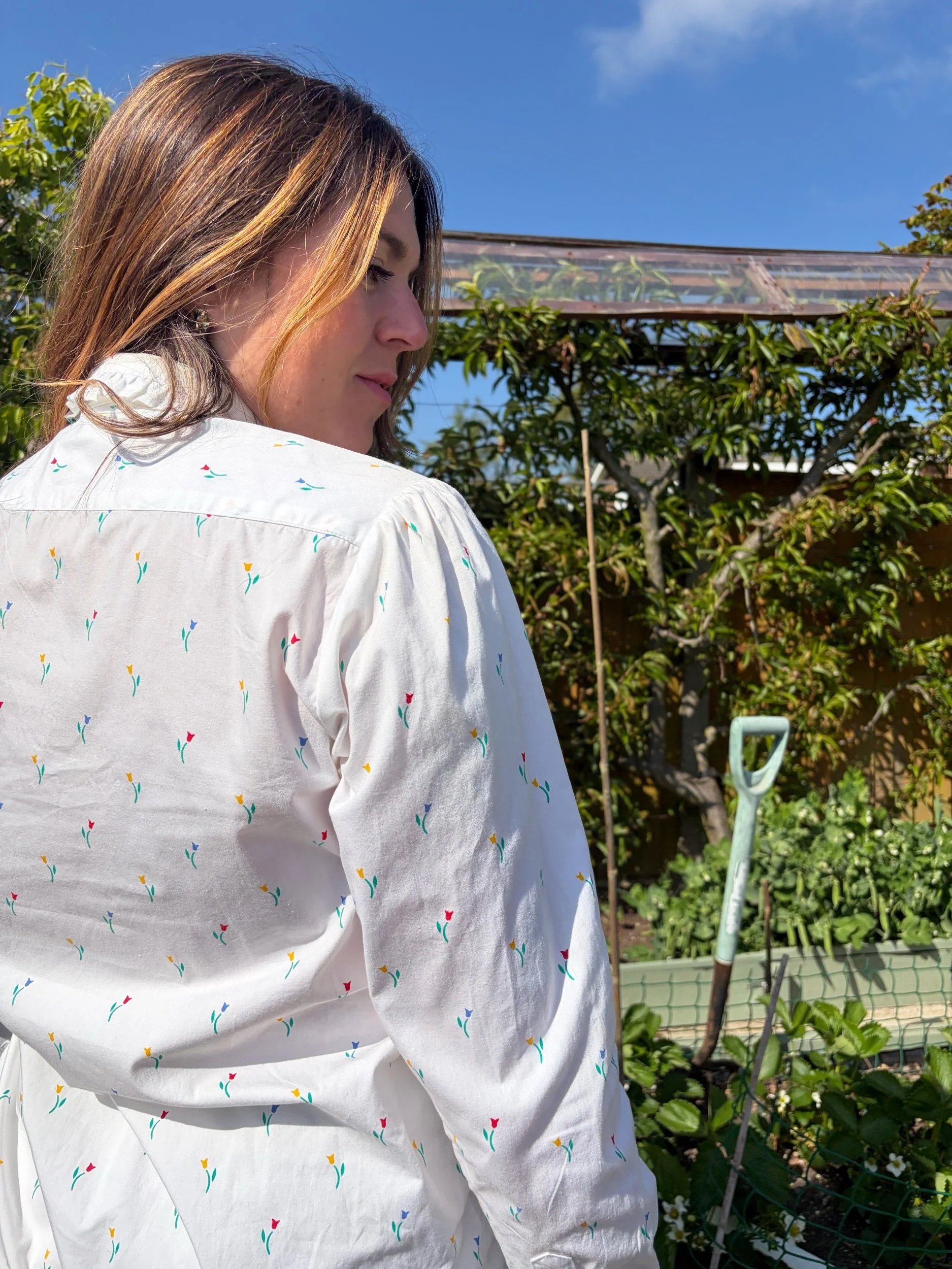 80s blouse with Peter Pan collar and cute ditzy tulips. Very spring! Would work well underneath dungarees or with any light blue denim. The cotton is absolutely gorgeous!