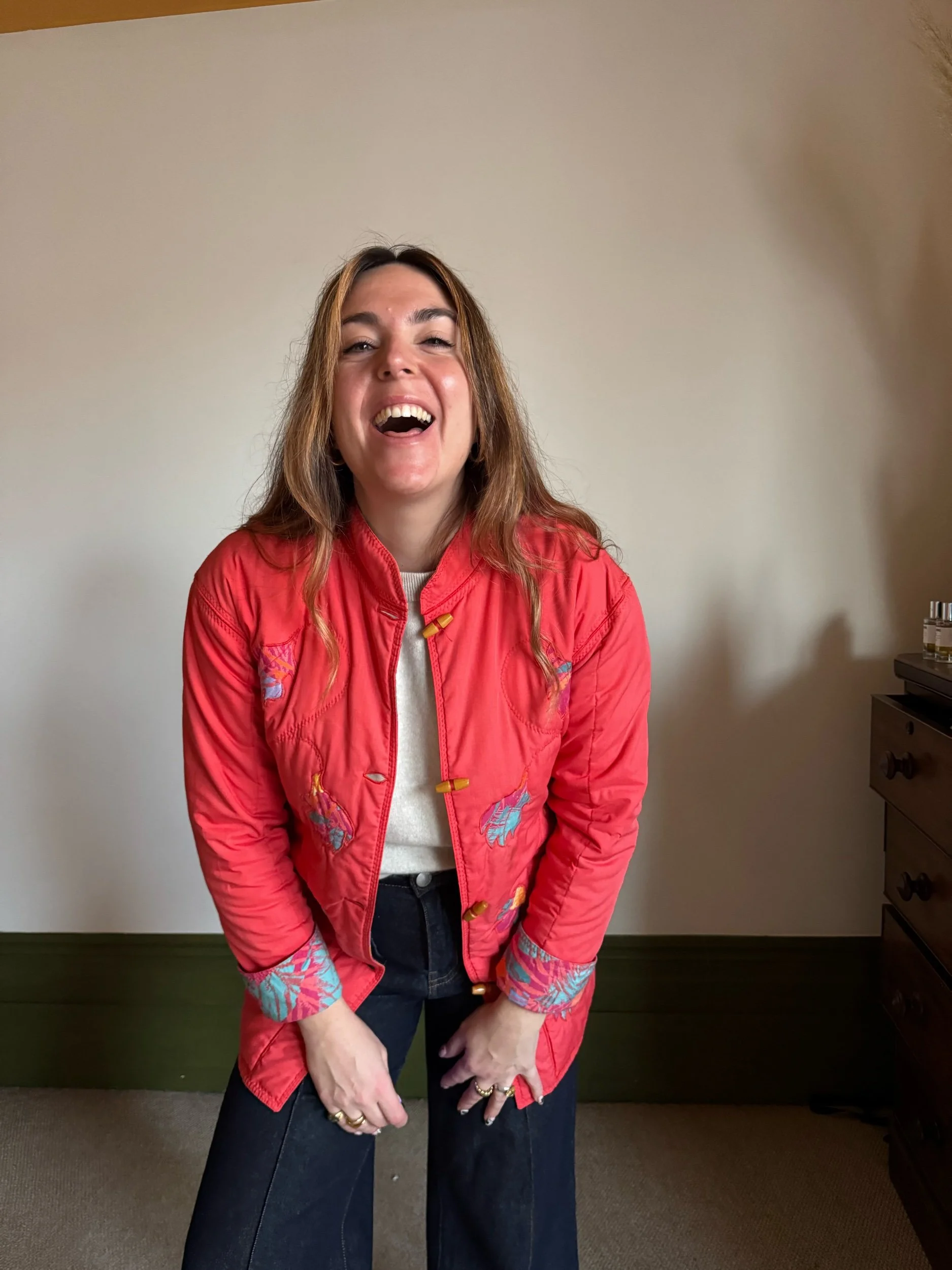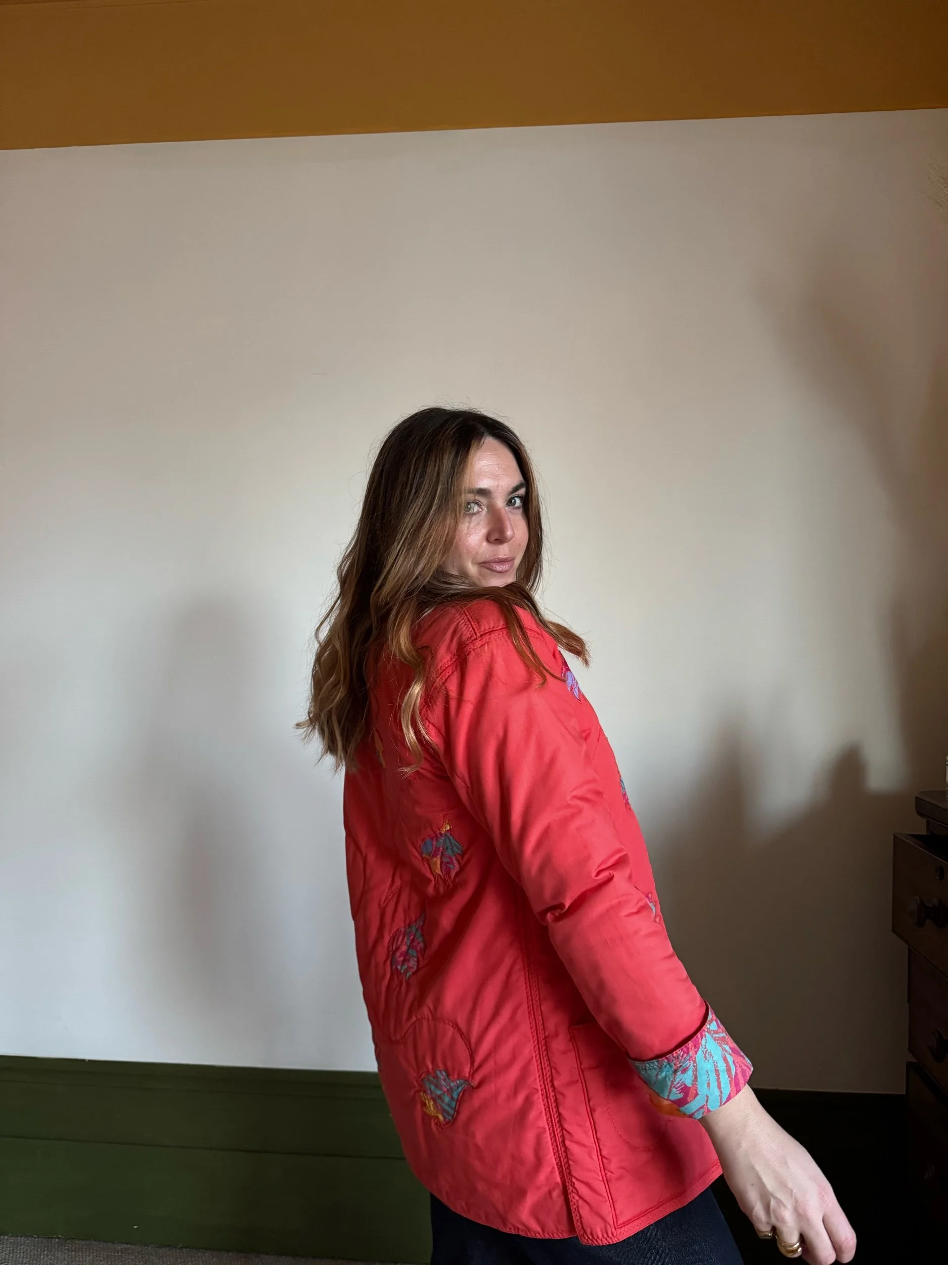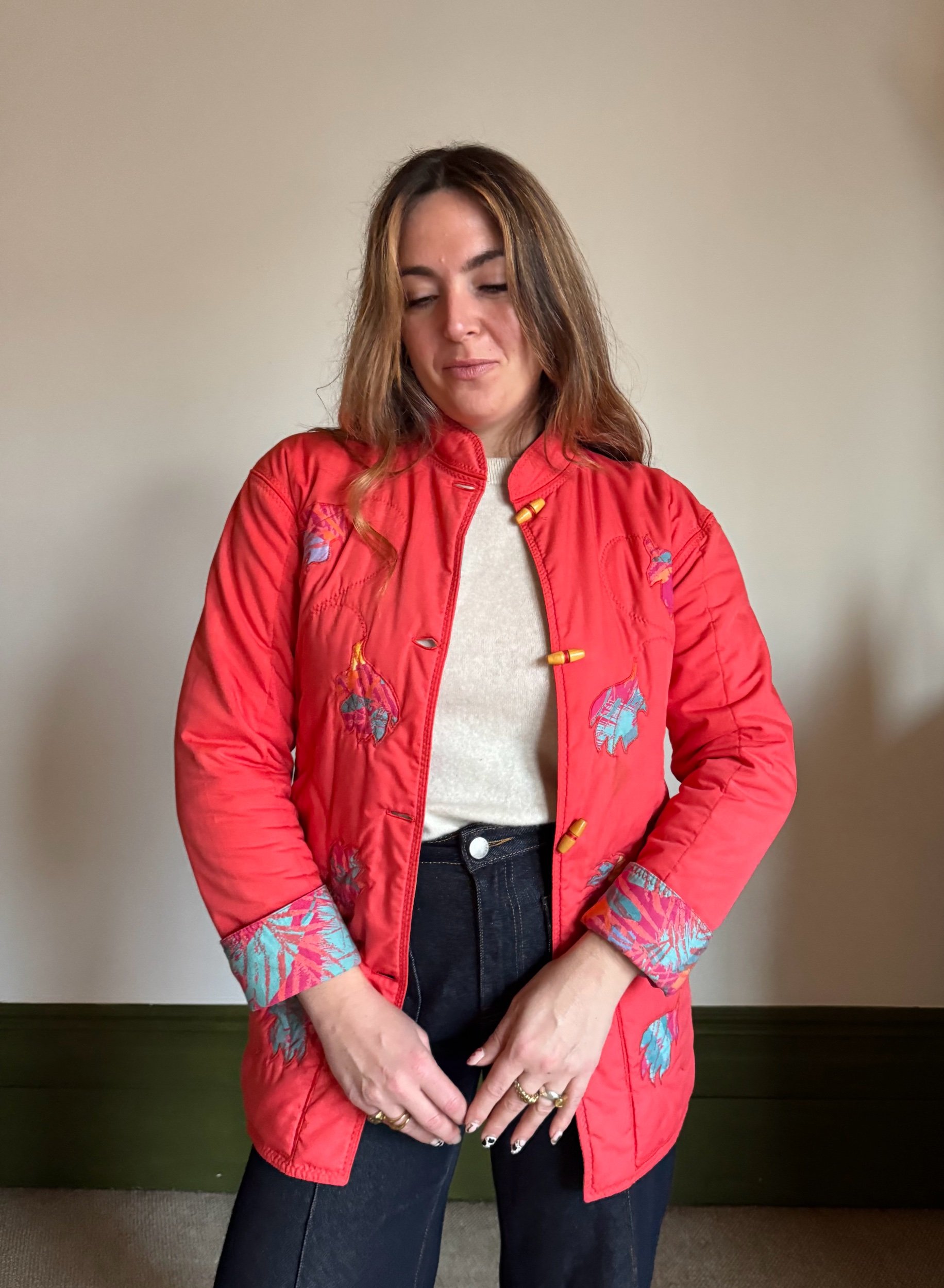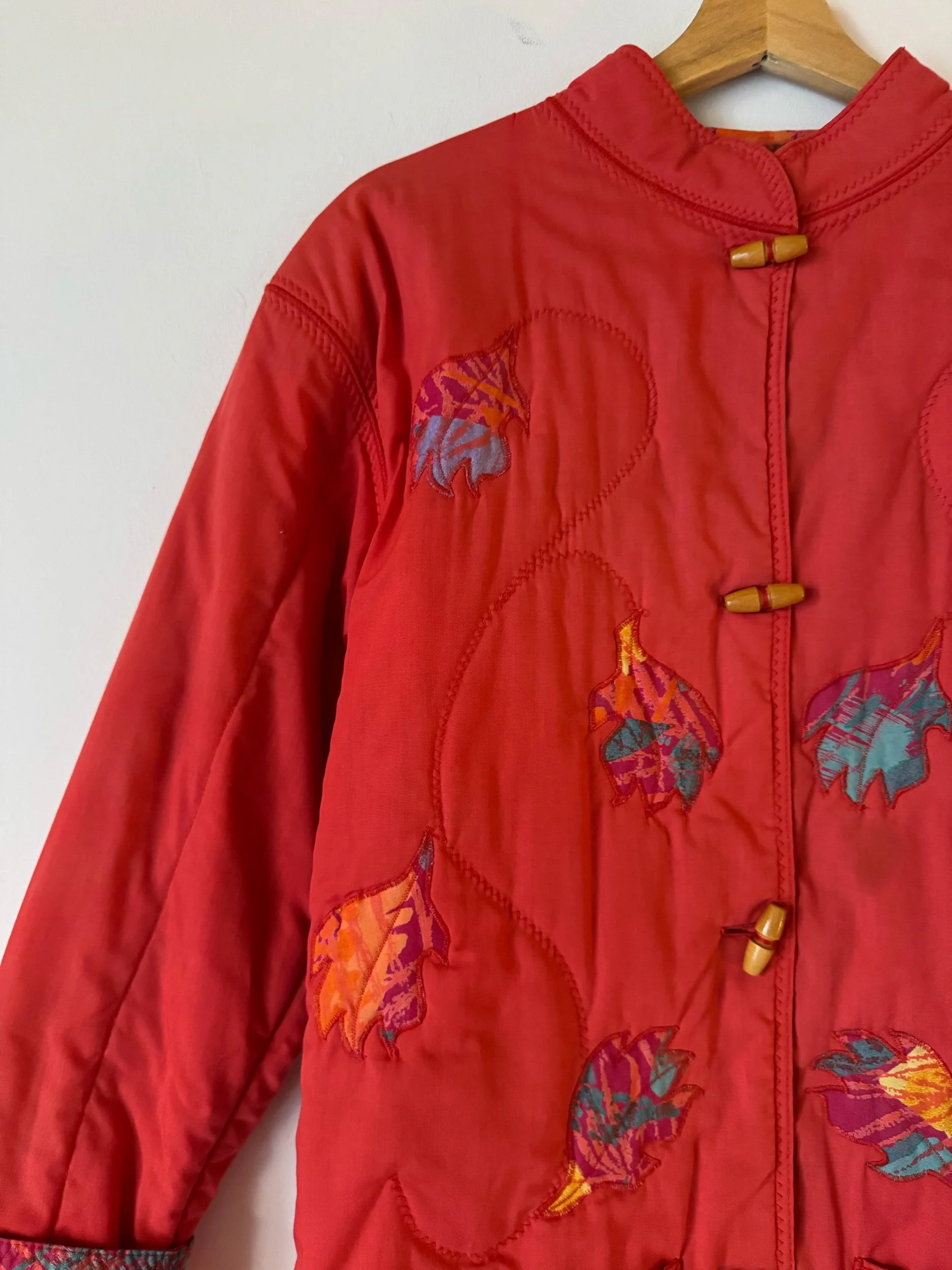 Beautiful vintage 70s quilted jacket. Mandarin collar with petal floral aplique and wooden toggle buttons. Perfect spring jacket!