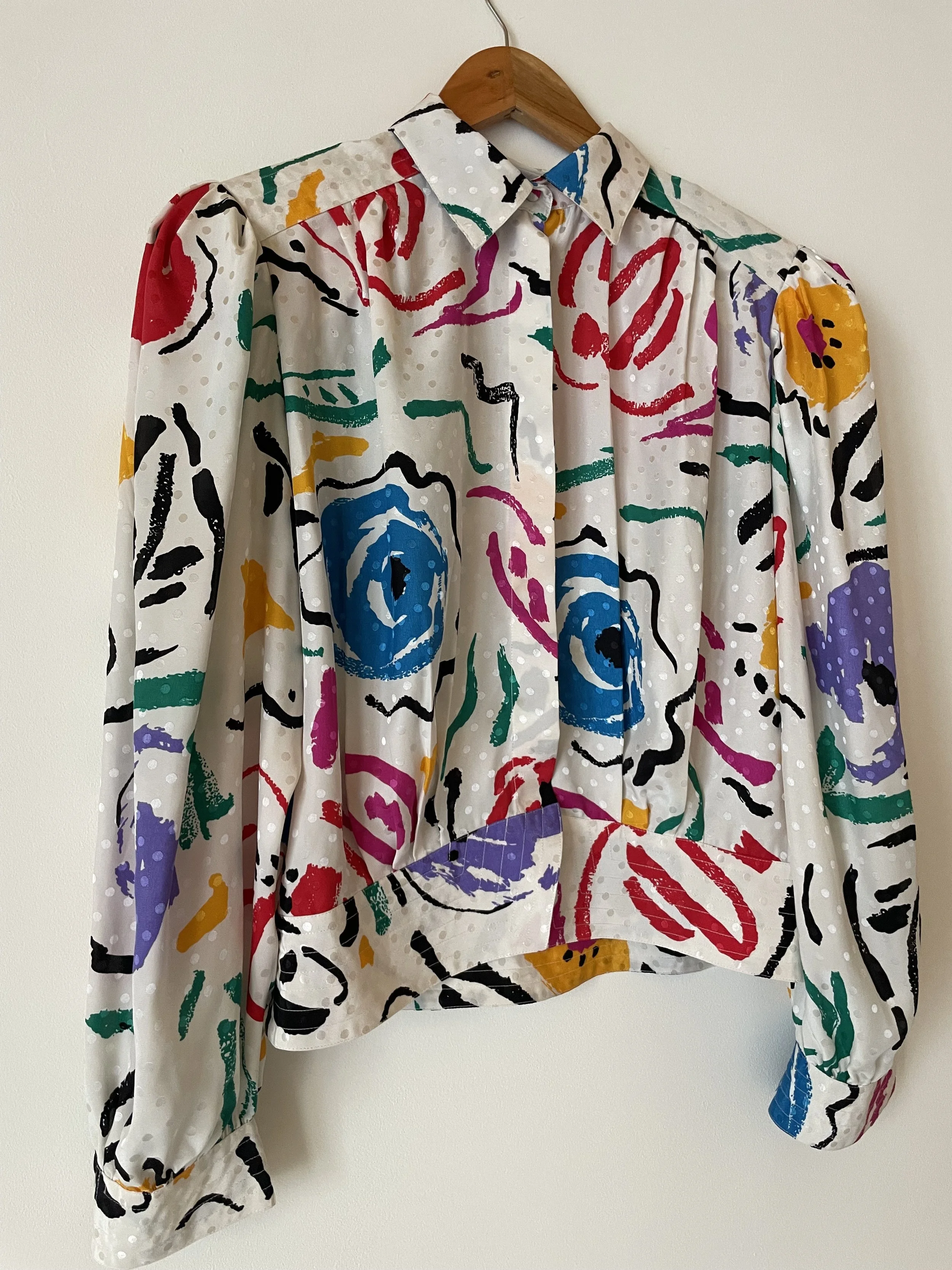 This beauty can be worn as both a jacket and a blouse. A proper 80s gem with Shoulder pads ( removable) and that classic 80s slouchy fit. Slightly cropped