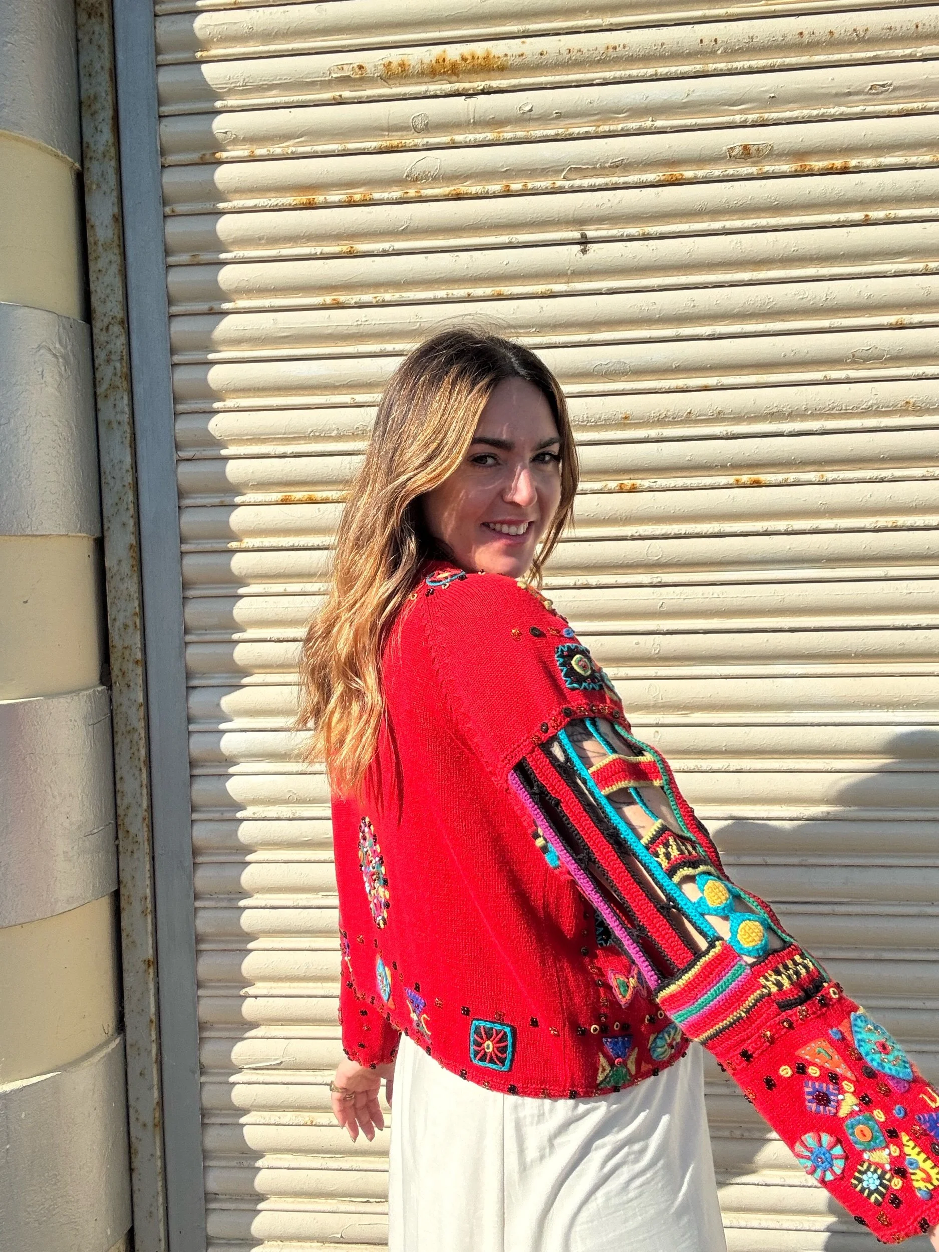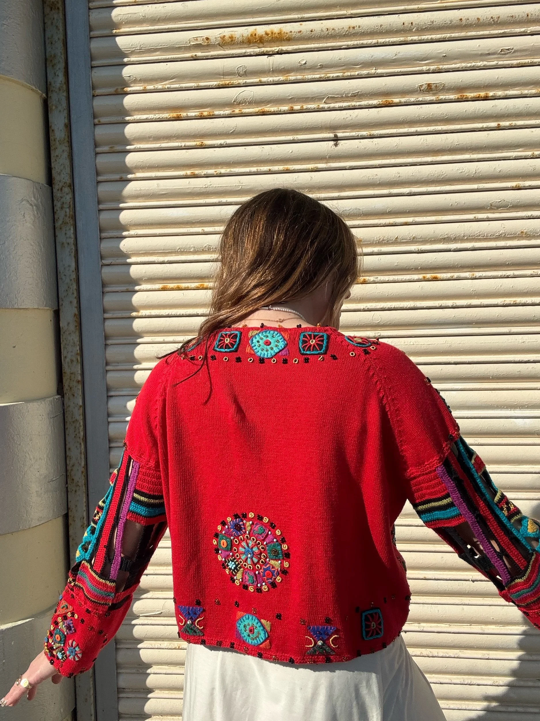 Unreal Michal Simone cardie. I love this collectors brand but I’ve never seen one quite like this. The cut out sleeves and that insane embellishment! Such a showstopper of a piece and in such mint condition too! Giant concealed poppers to fasten.