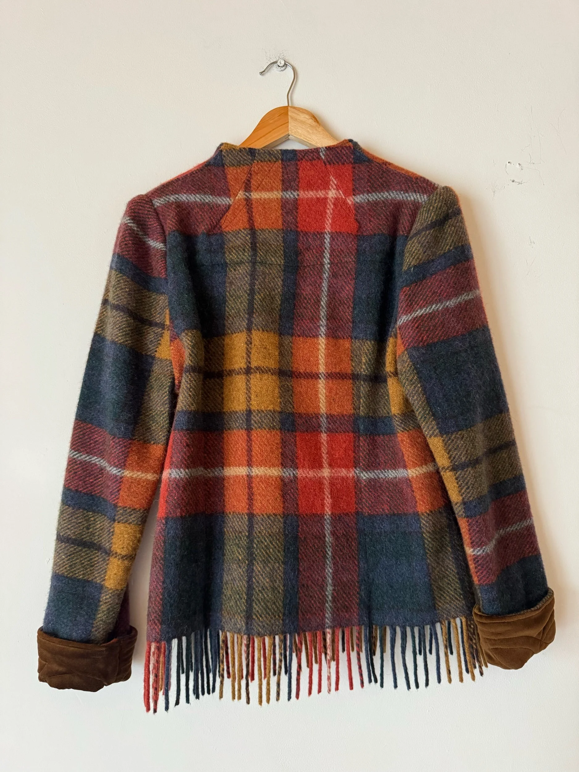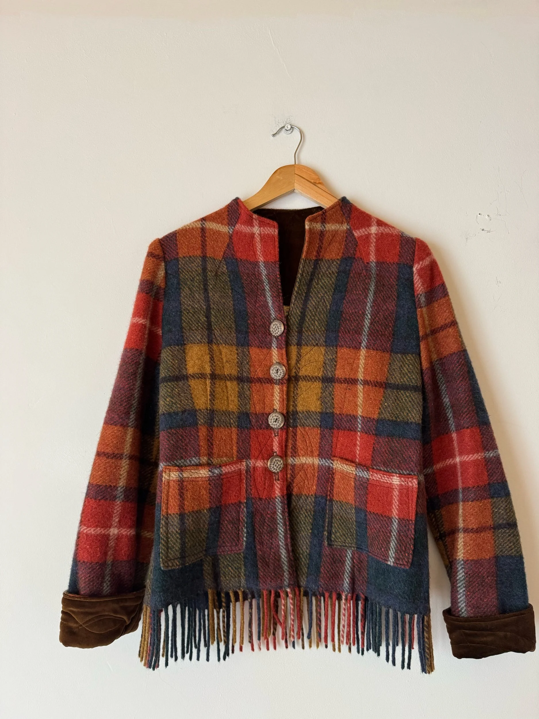 Stunning blanket coat from the 80s/ 90s in lovely warm orangey/ brown tones. Fringing to the hem and subtle needlework by the chest. Luxurious brown velvet lining and wooden buttons