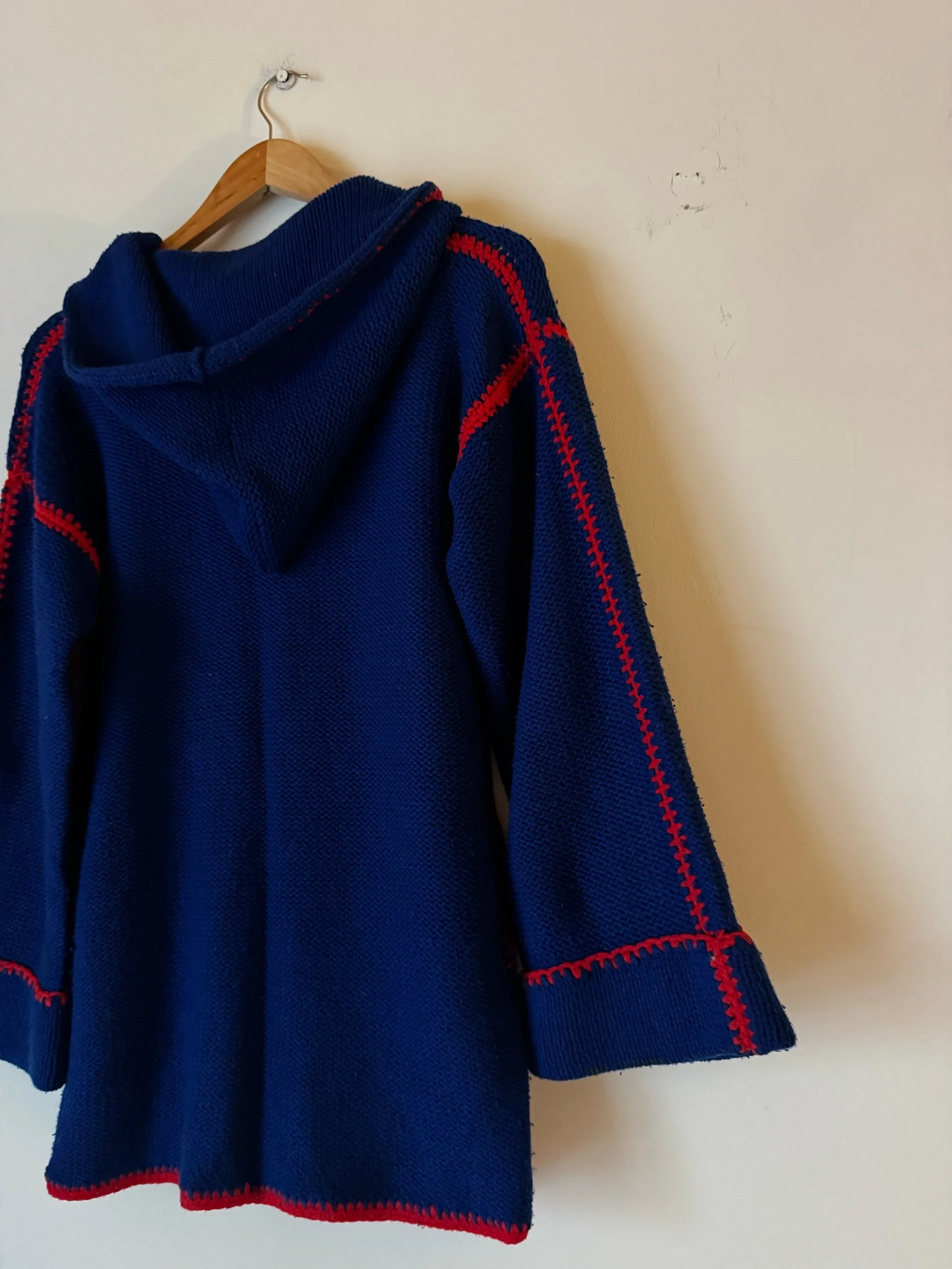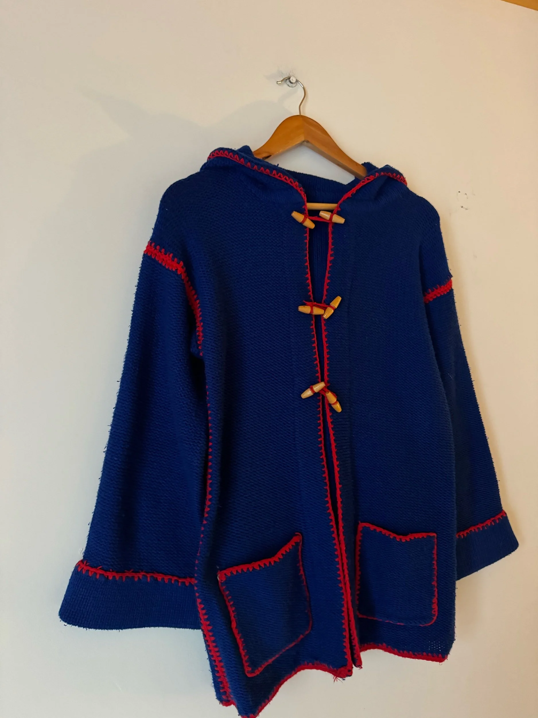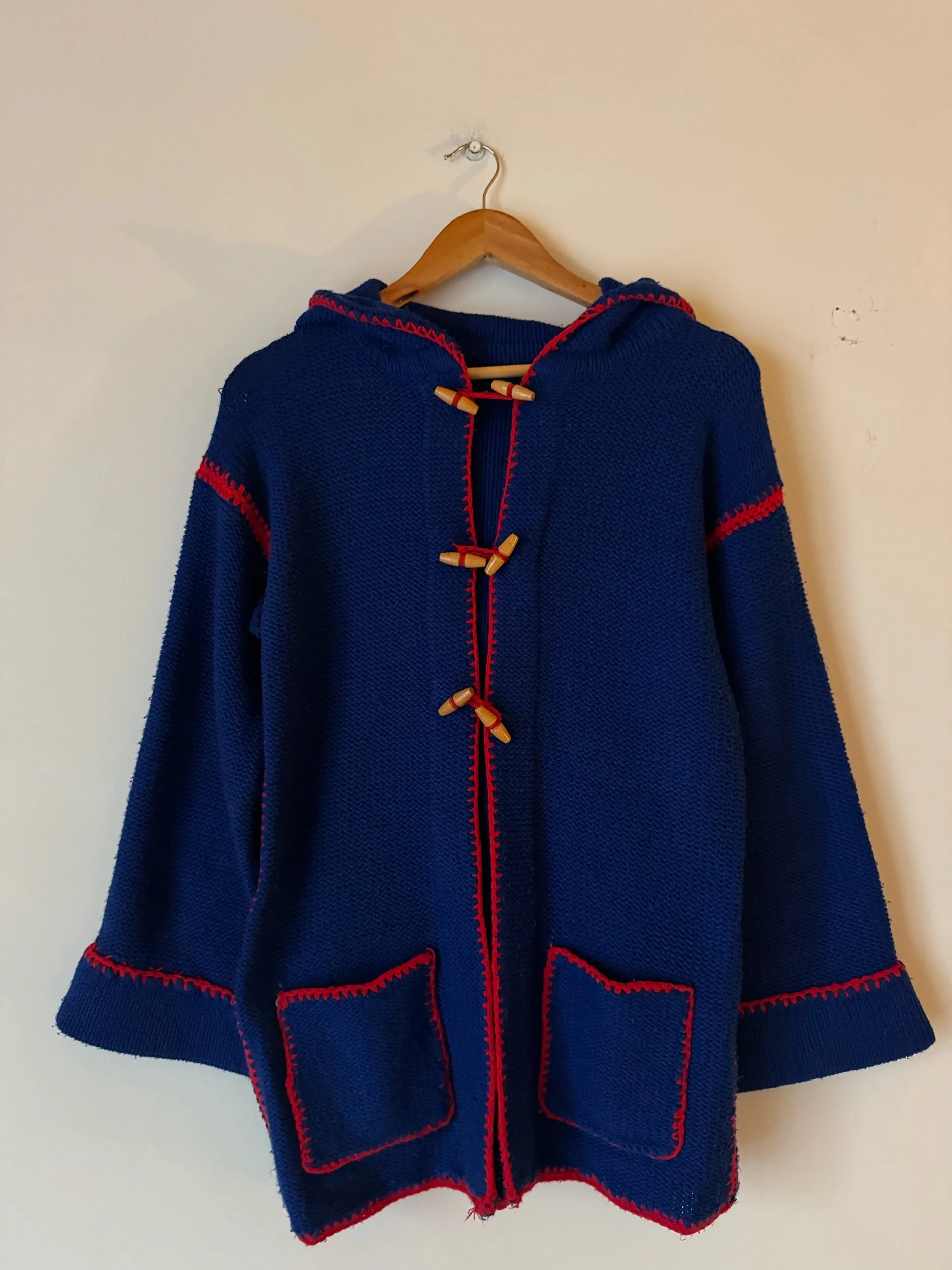 An original 70s hooded cardie. In the most scrumptious blue with oversized stitching in shocking red. Has wooden toggle buttons, super warm and cosy