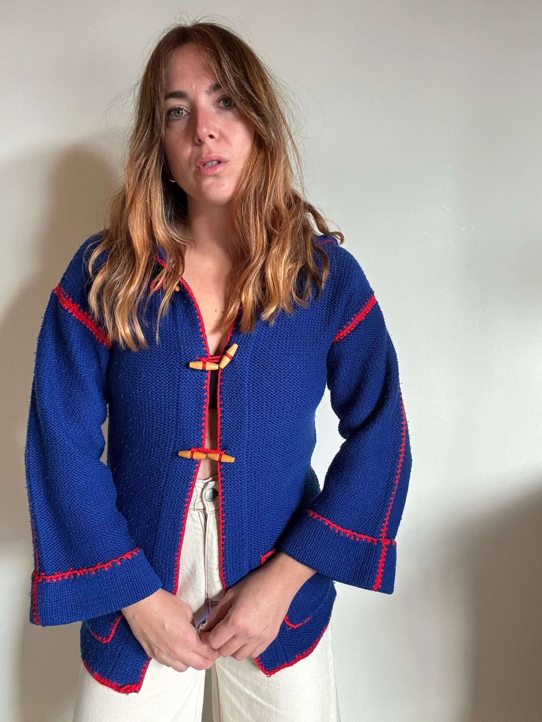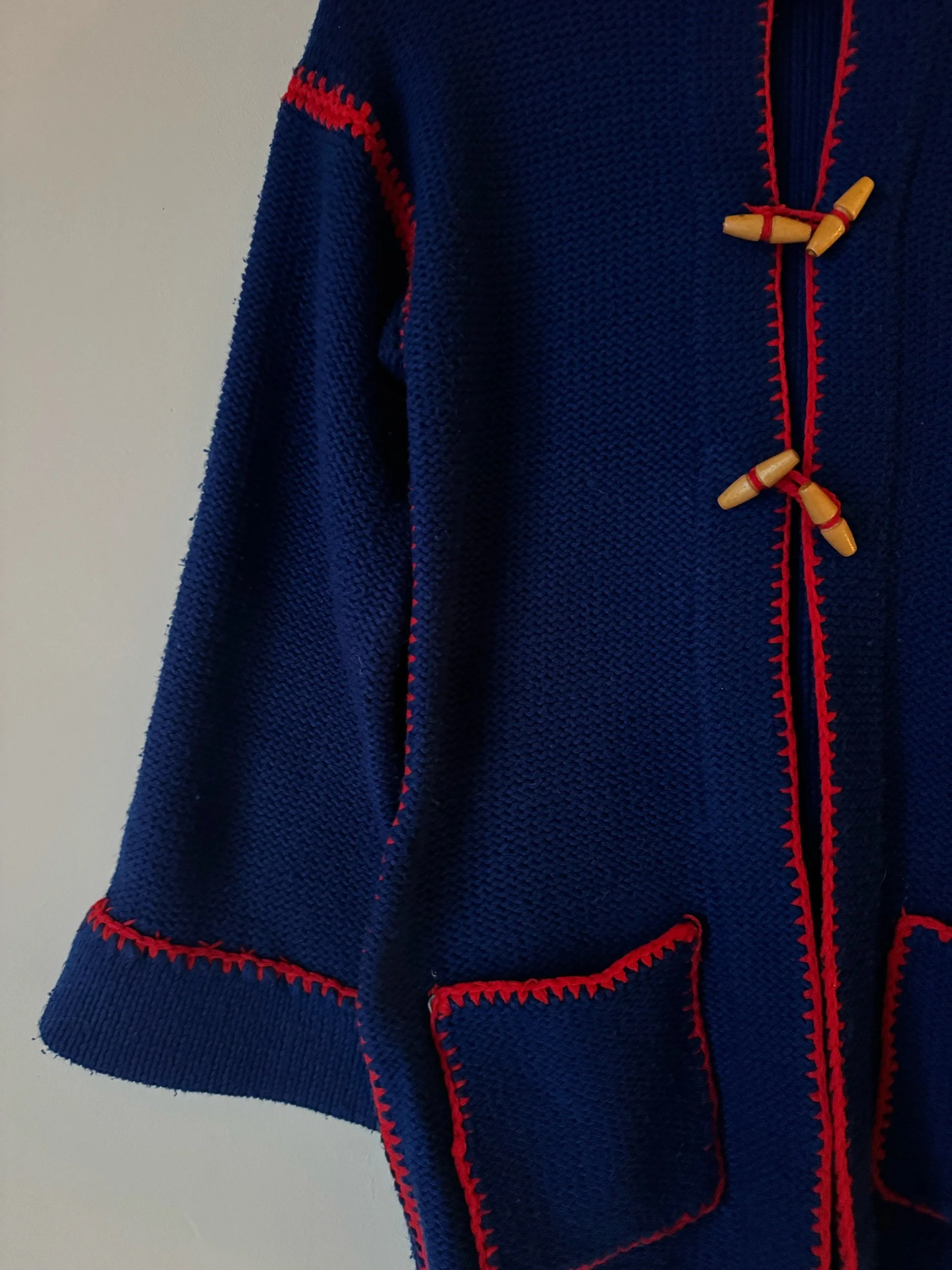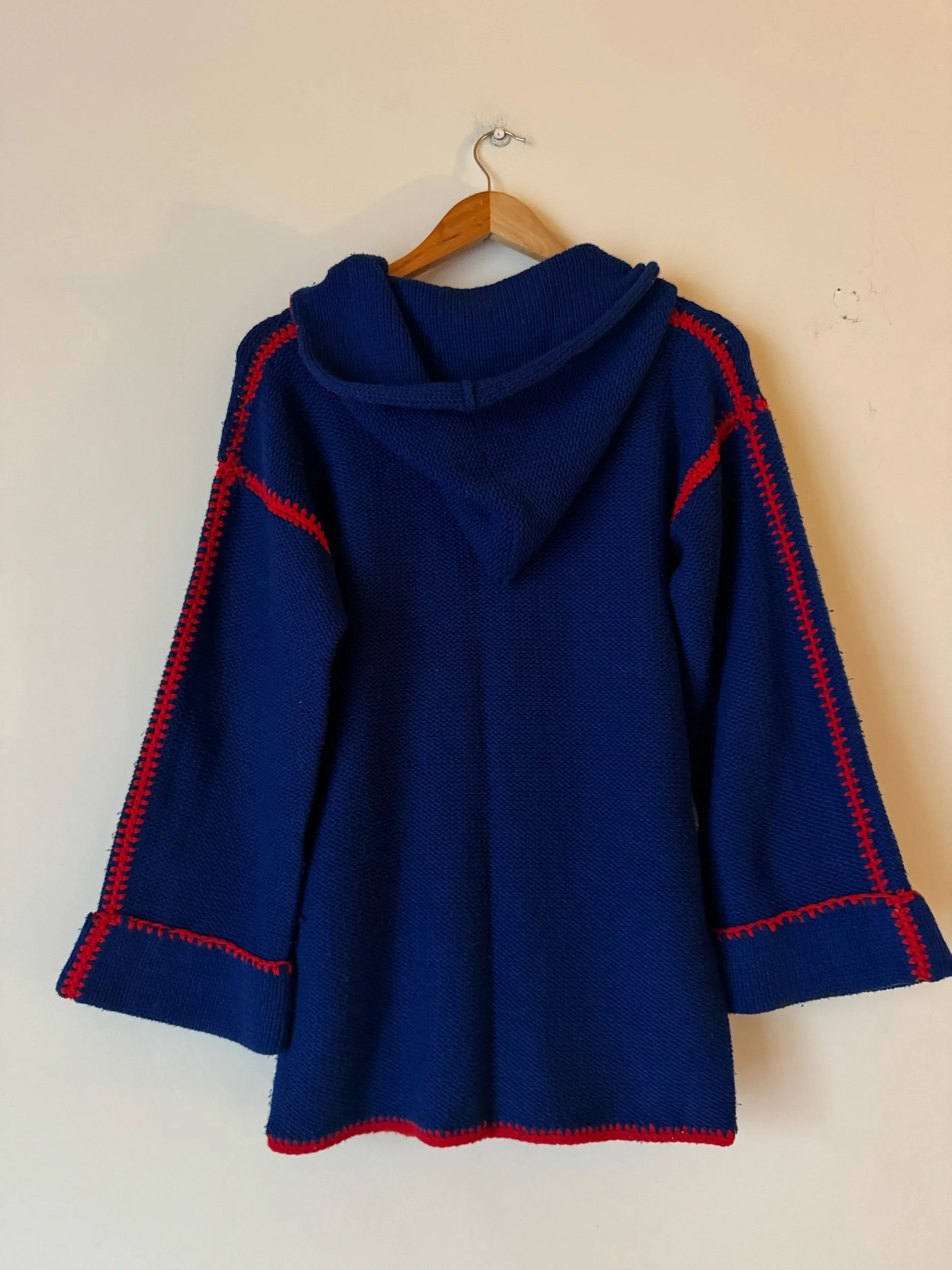 An original 70s hooded cardie. In the most scrumptious blue with oversized stitching in shocking red. Has wooden toggle buttons, super warm and cosy
