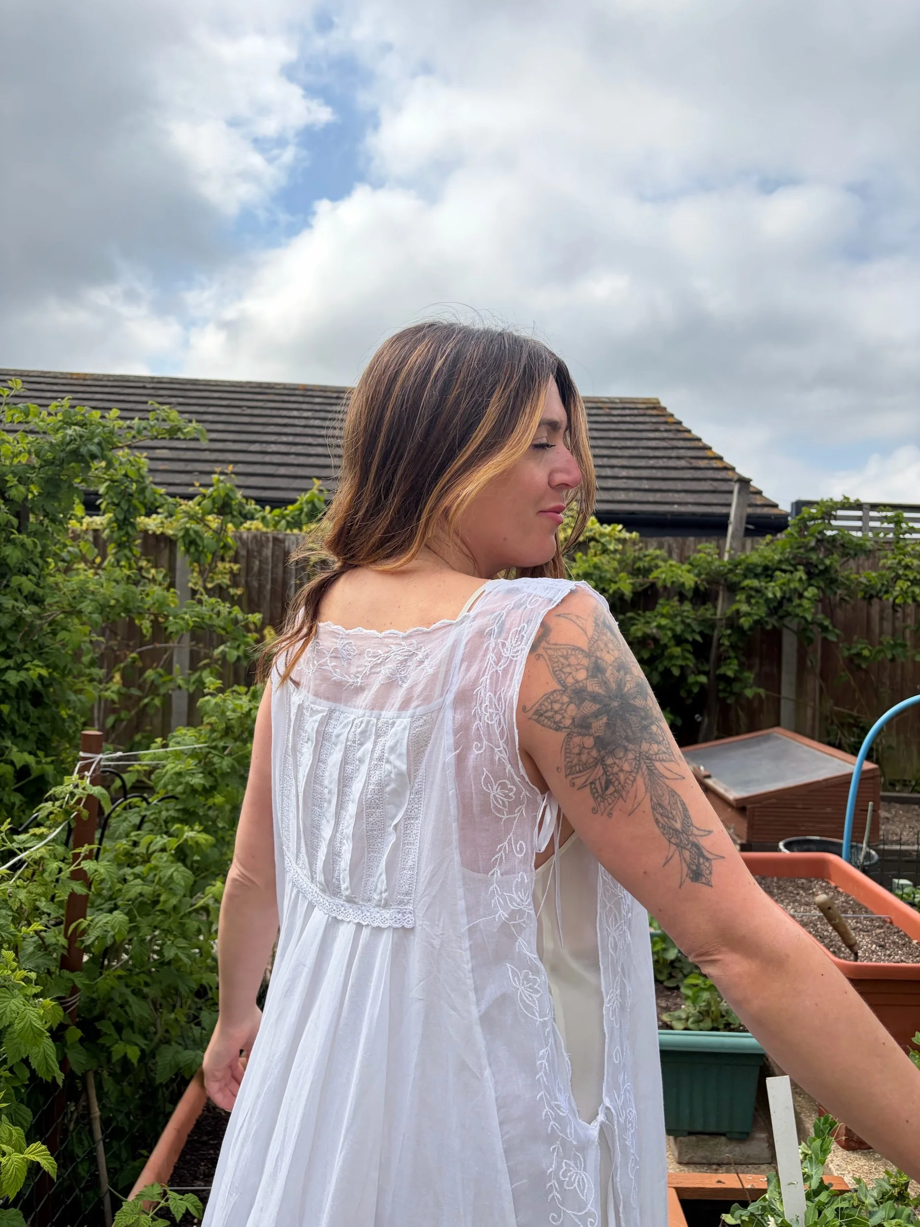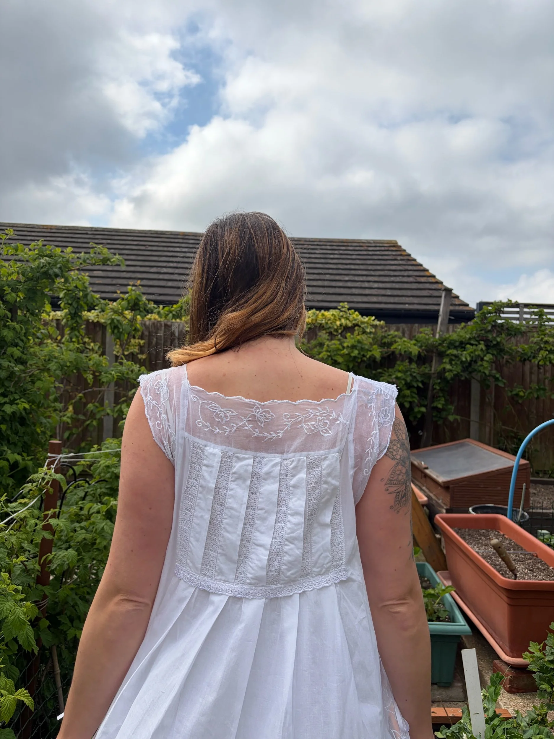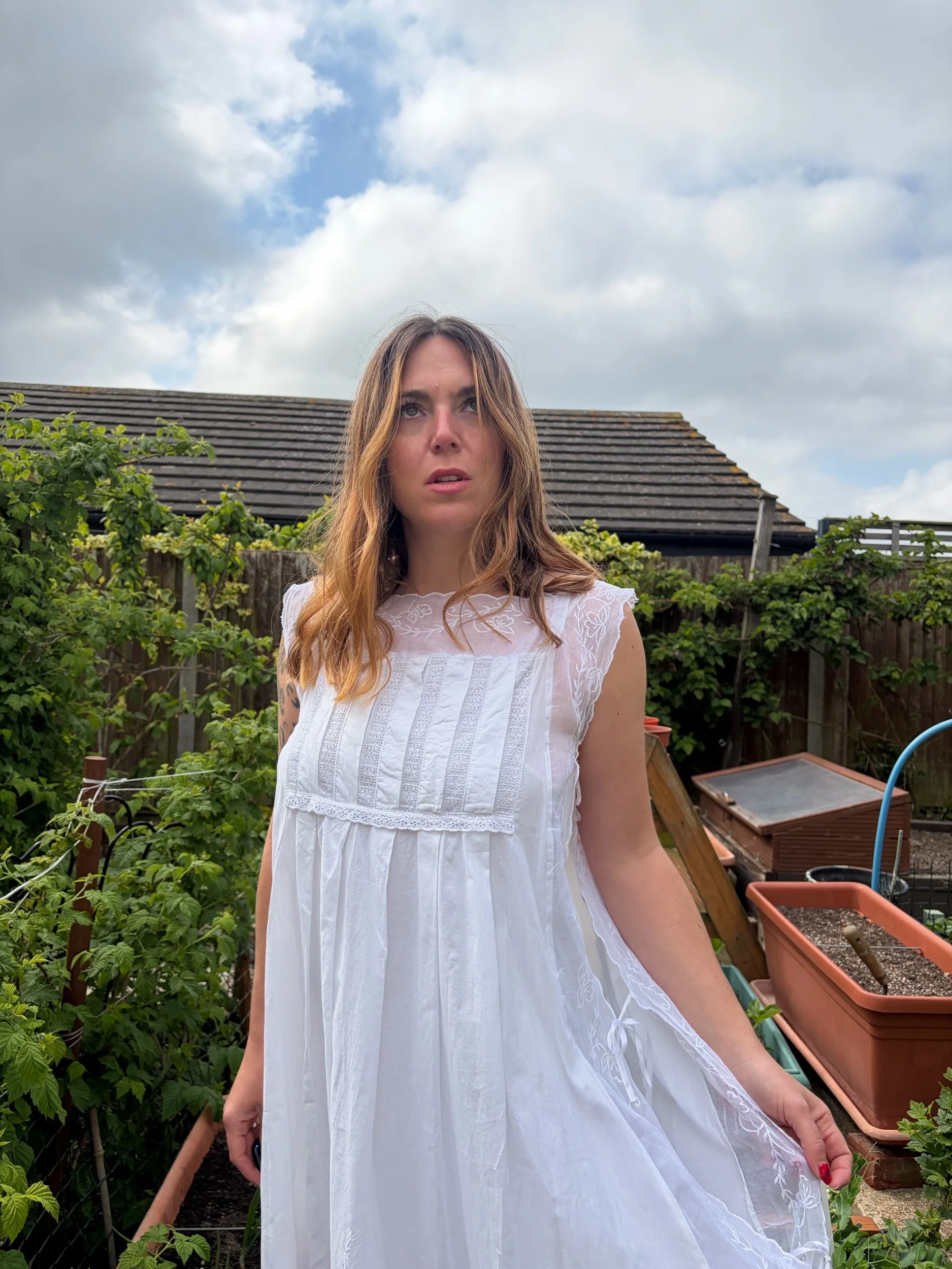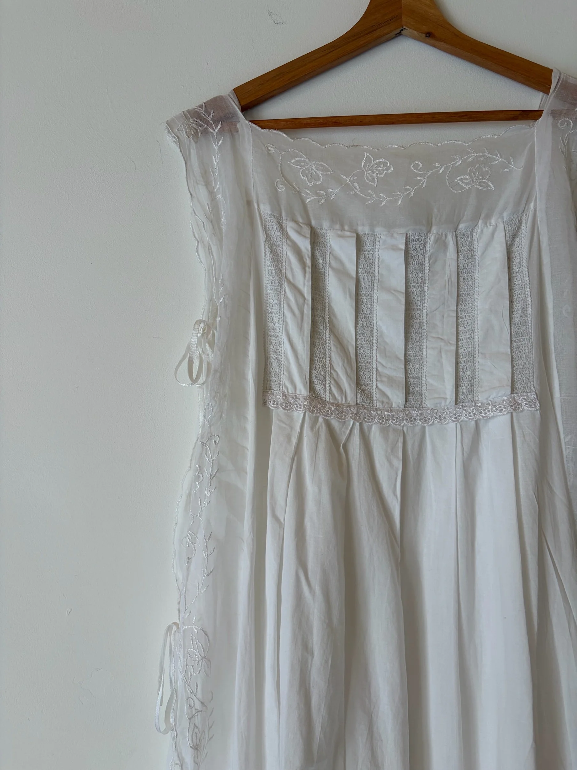 Late 80s nightie/ dress by the brand petals which is known for its quality cotton. Ties at the side like a tabbard, fits 12-18 as these ties can be adjusted. Has beautiful embroidered sheer panelling at the side. Sublime piece