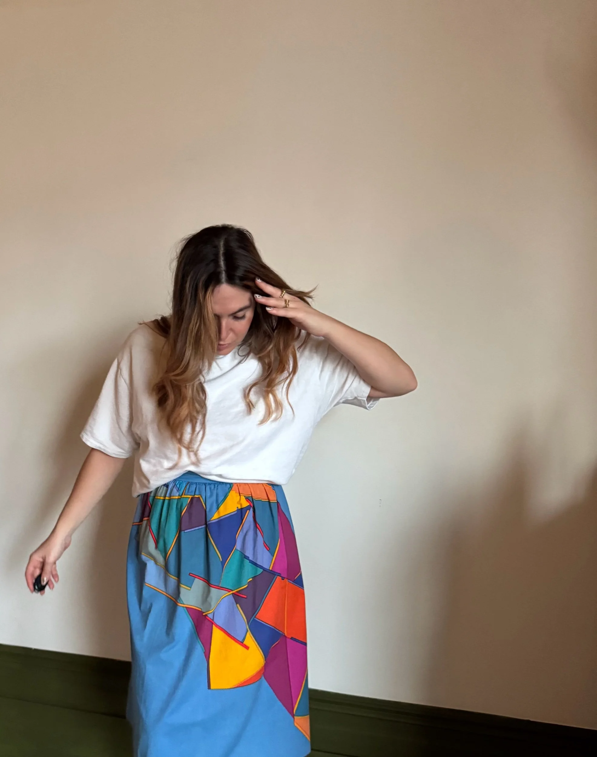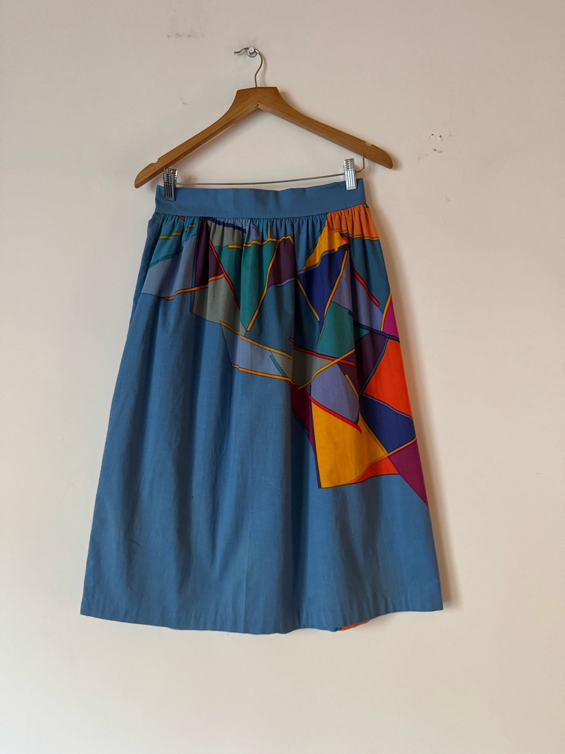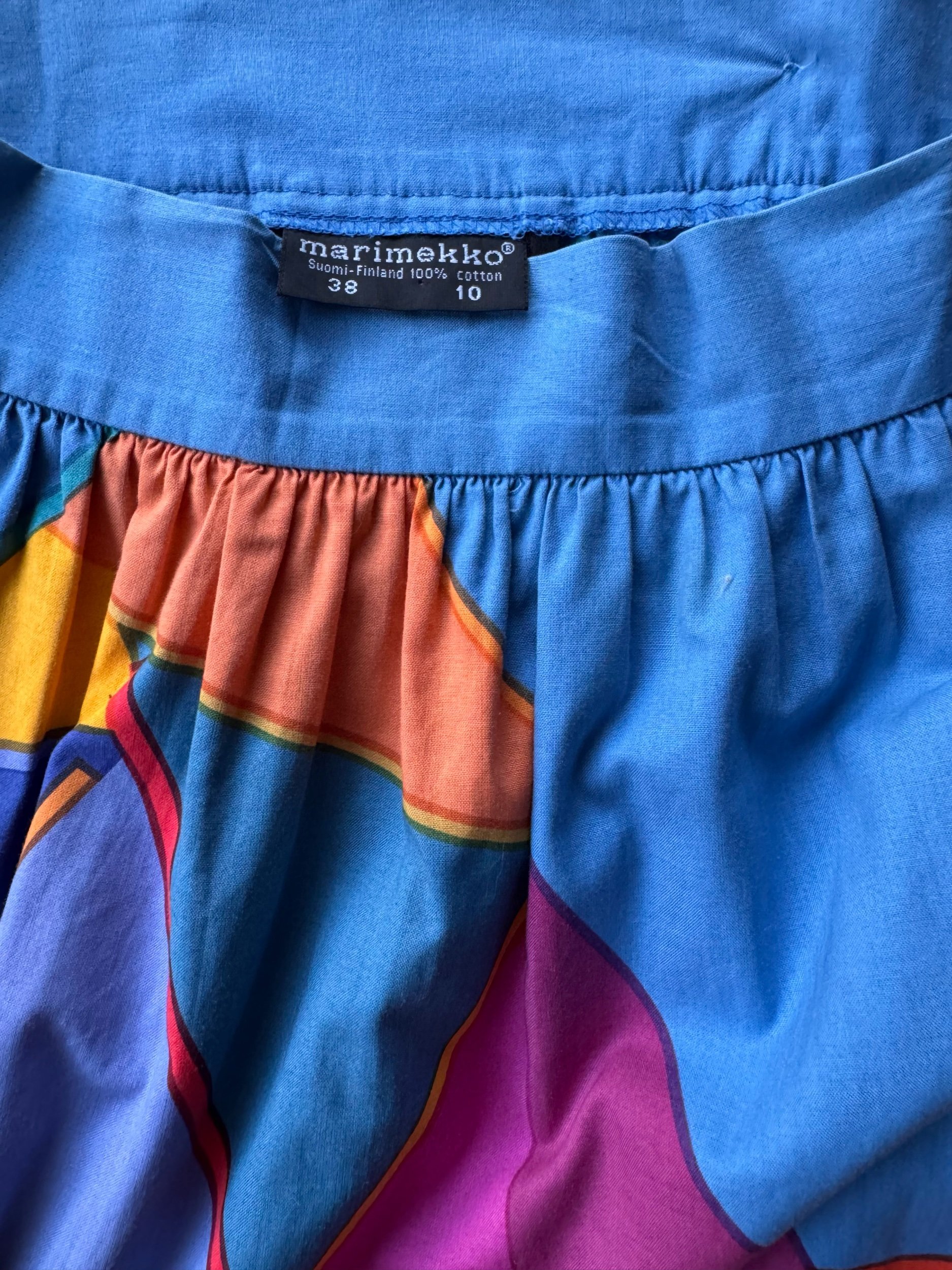 Absolutely stunning original 70s Marimekko skirt. These pieces are so rare to source these days! The colours and abstract pattern combo is chefs kiss. Buttons to fasten at the side. Sits high waisted.
