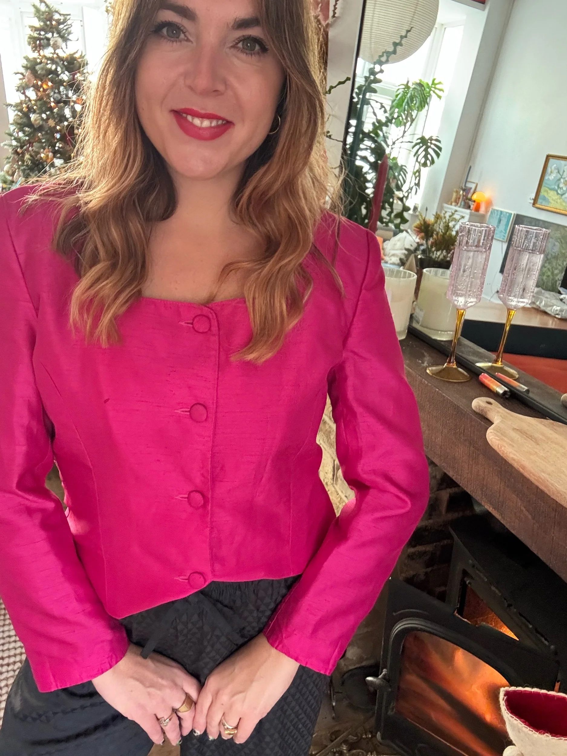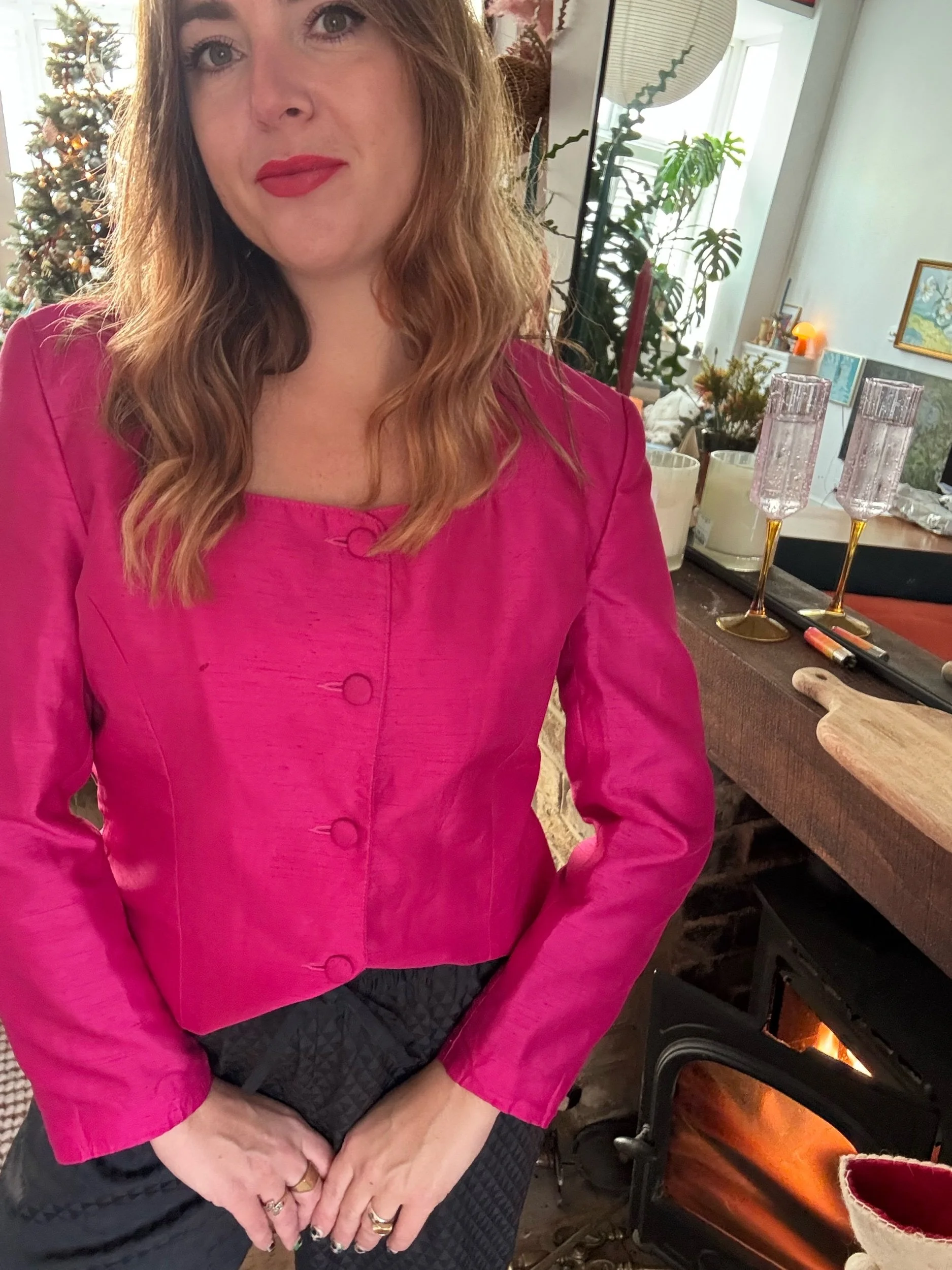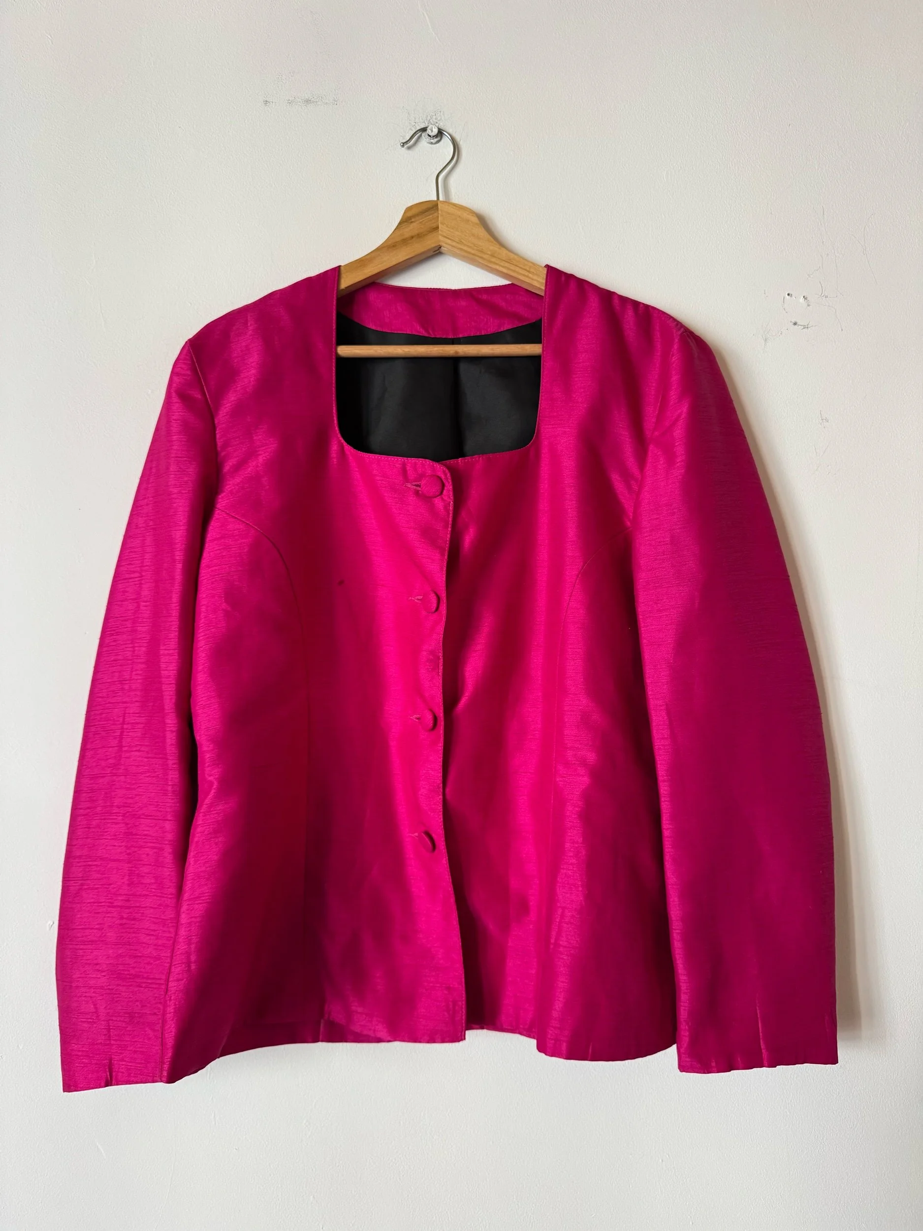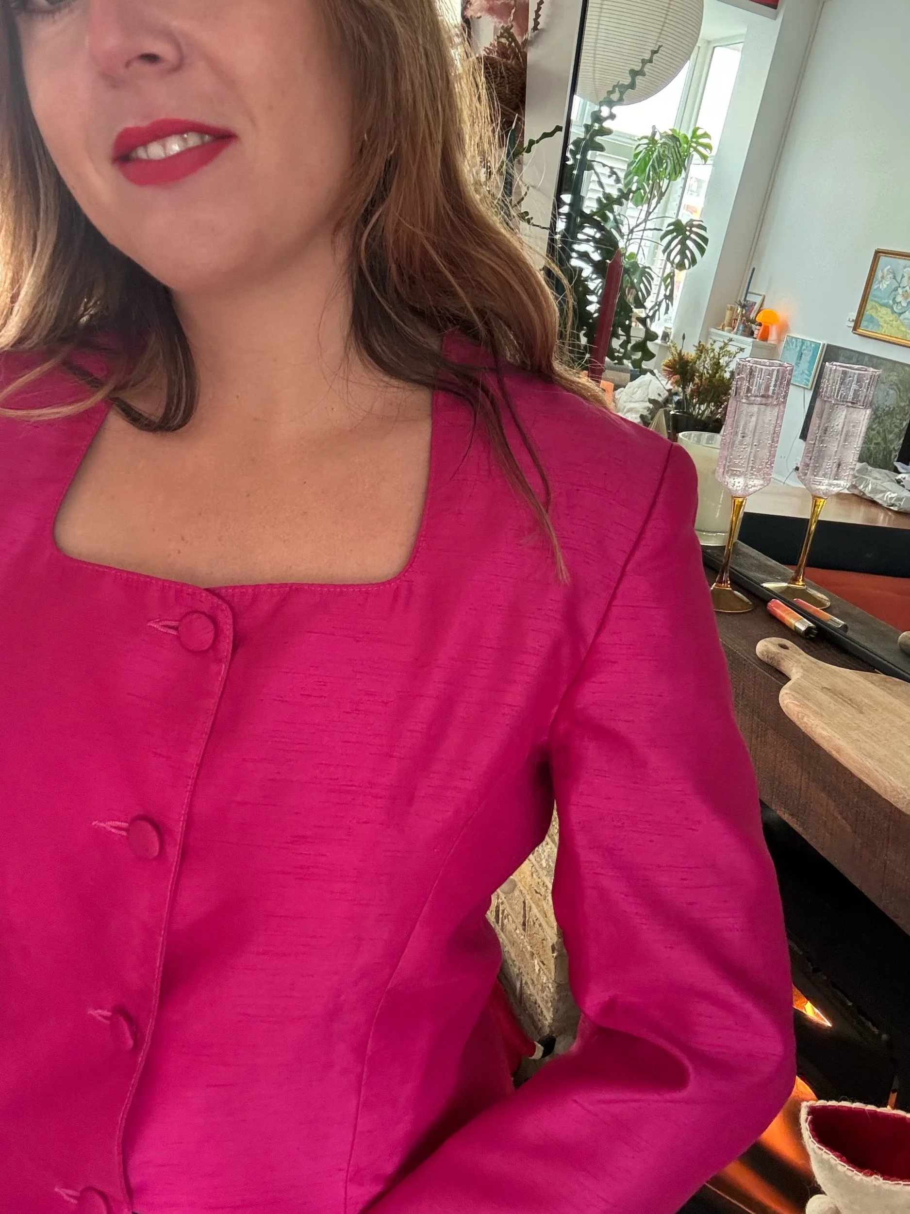 90s silk jacket/ blouse in a fab shade of pink. Love the structure of the shoulders and covered buttons. Such a beautiful piece