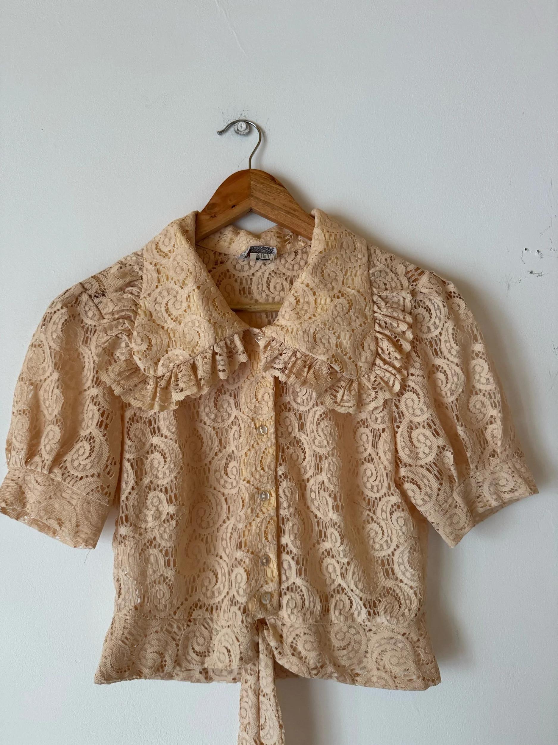 An original 70s blouse by Richard Shops. Stunning crochet lace material, lace full collar and original converted buttons. Great piece for all your round as it can be layered with tanks and cardies