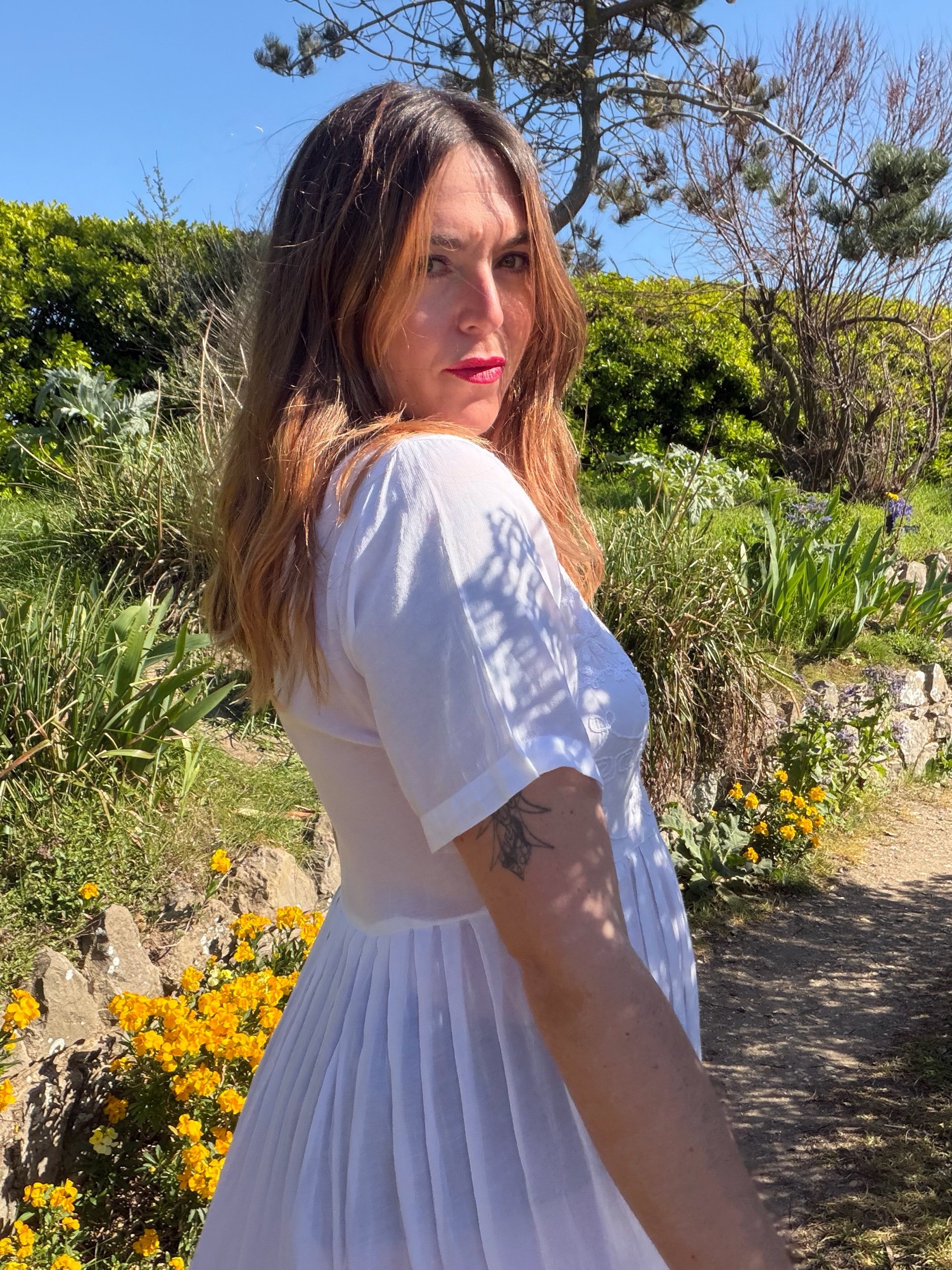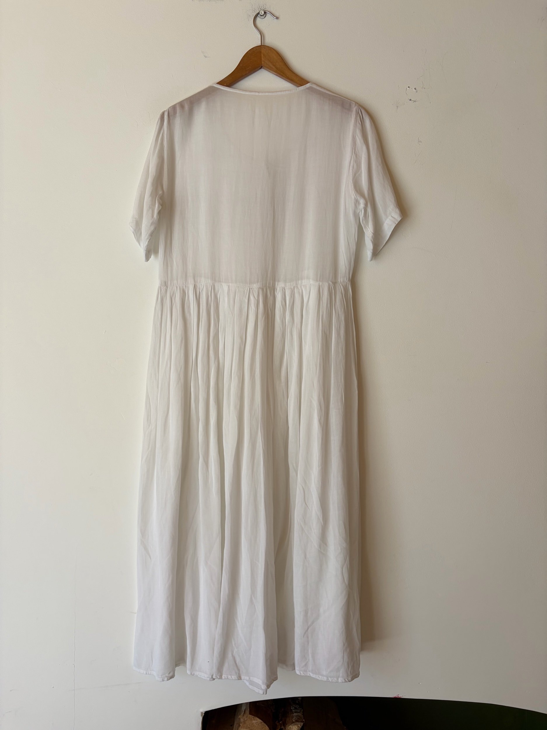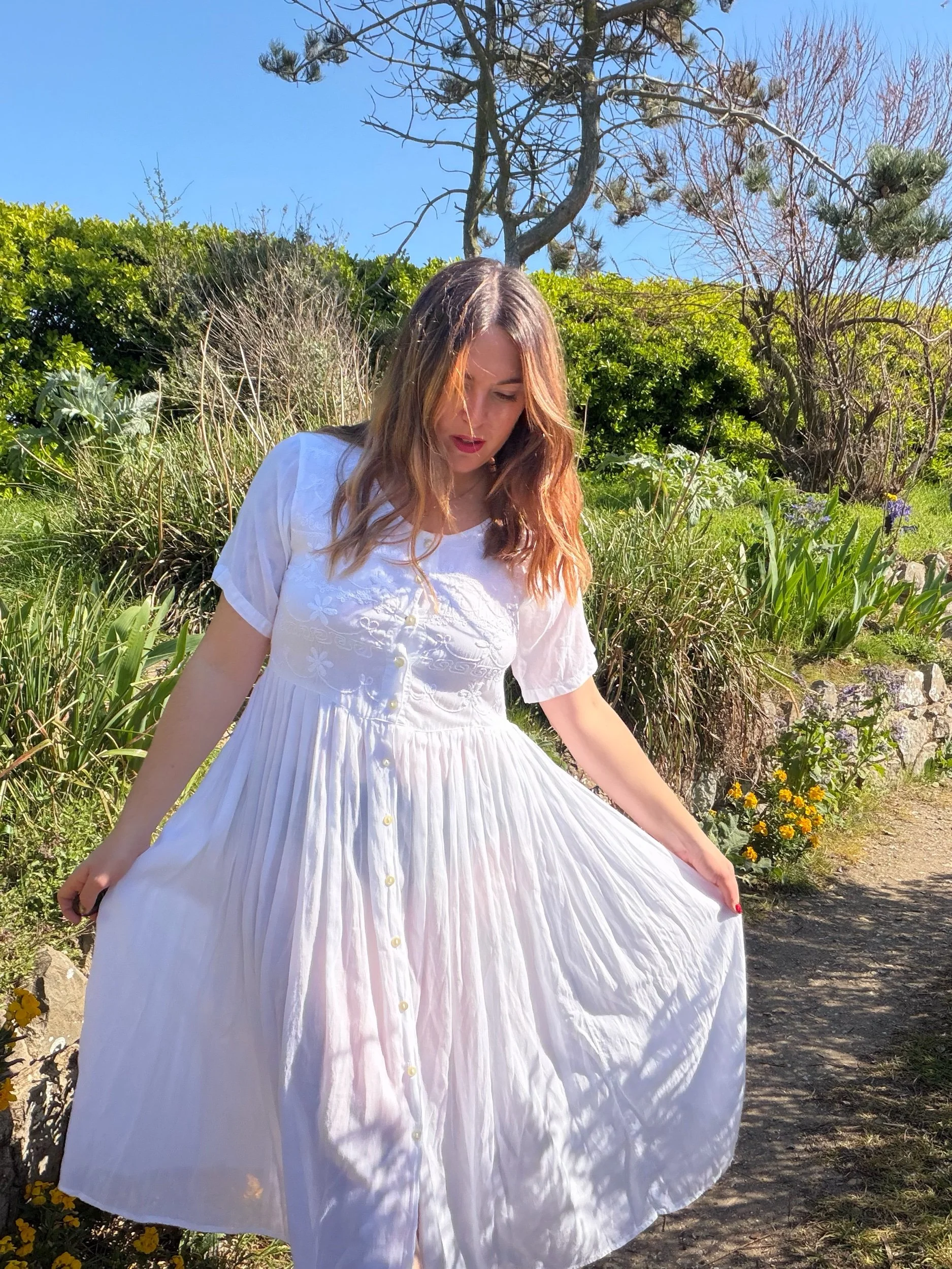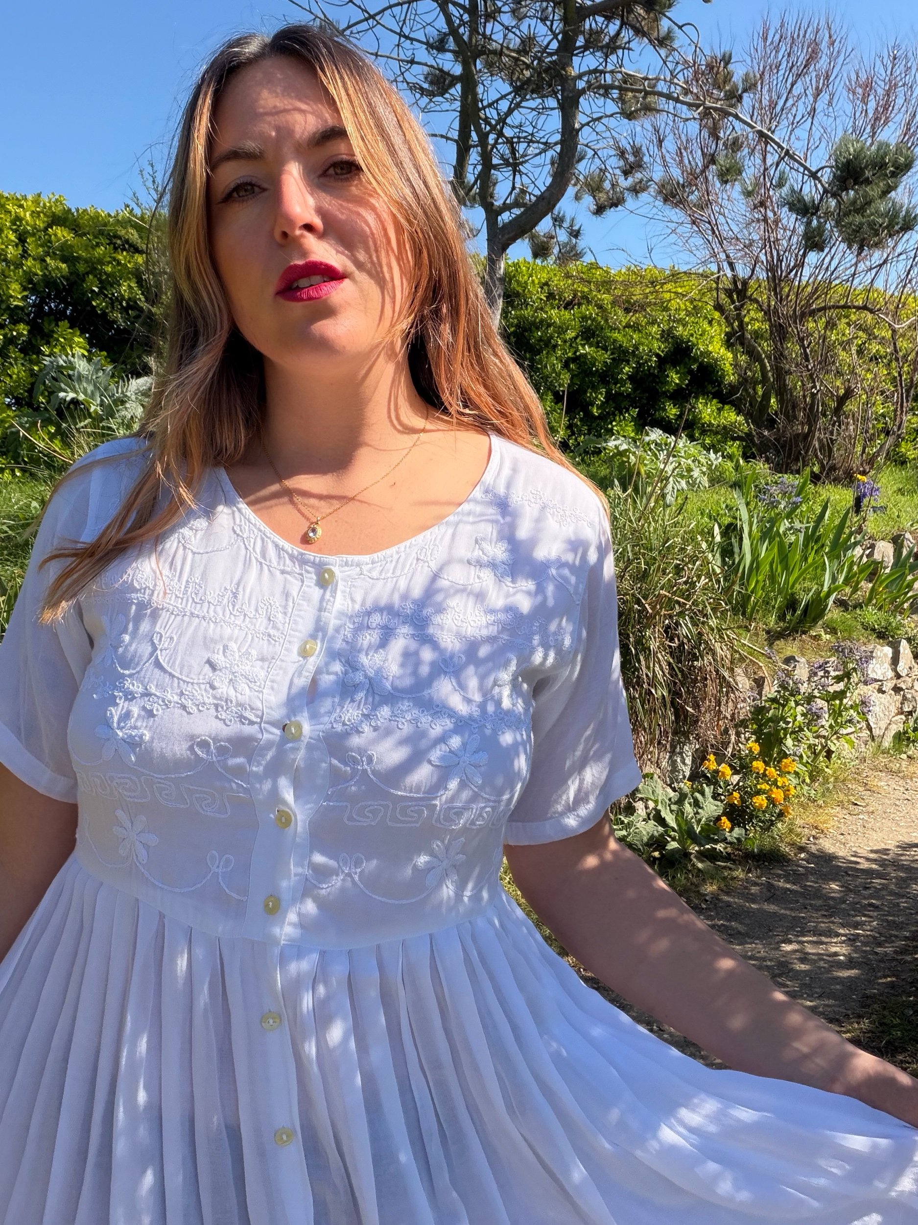 Stunning white cotton midaxi dress. Buttons down. Made with the most exquisite quality cotton. 70s style , 90s era. Really lovely embroidery at the front. Looks fab paired with cowboy boots!