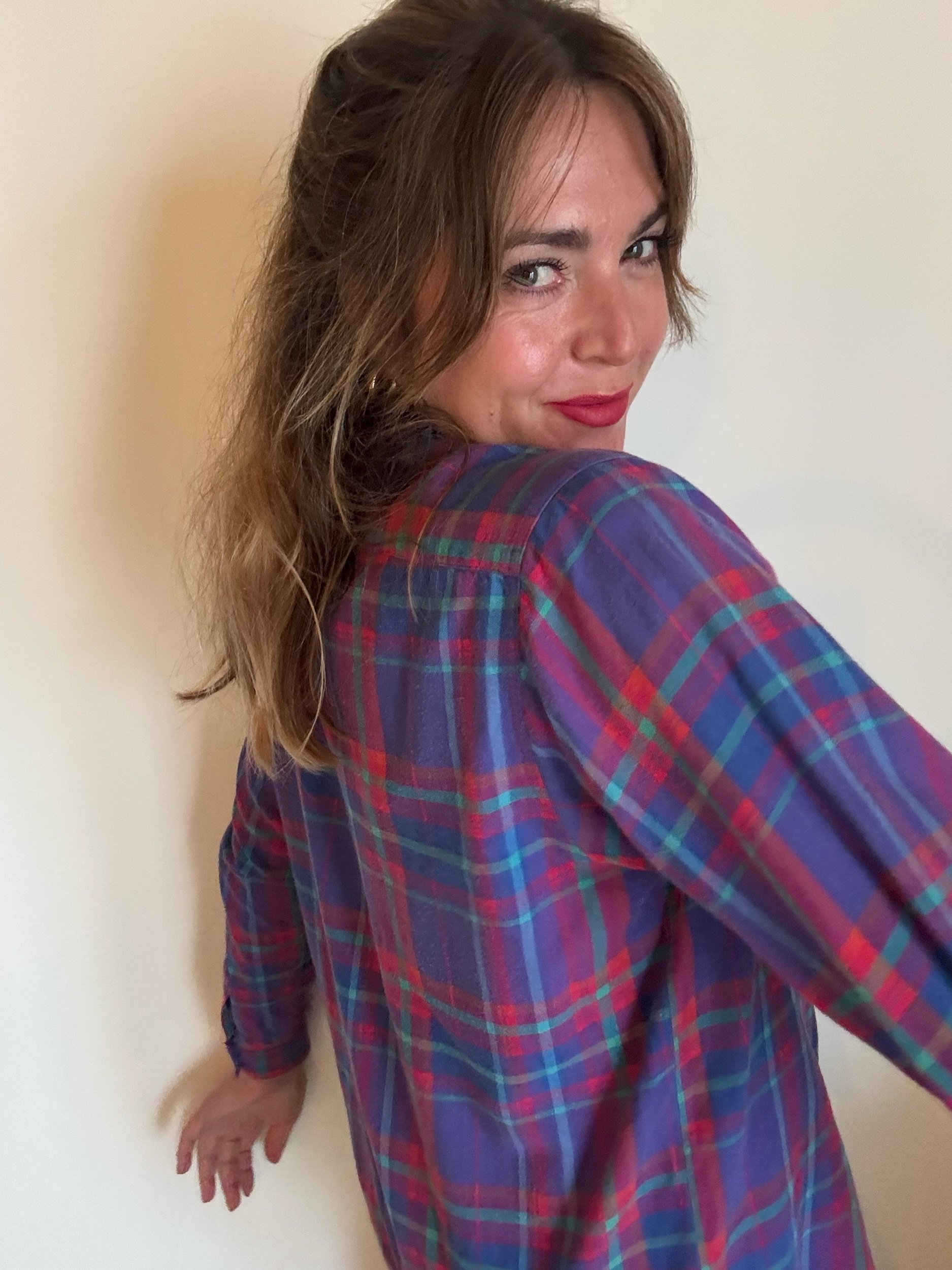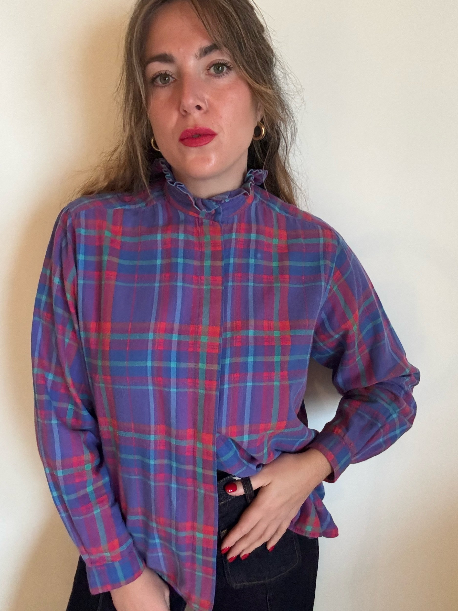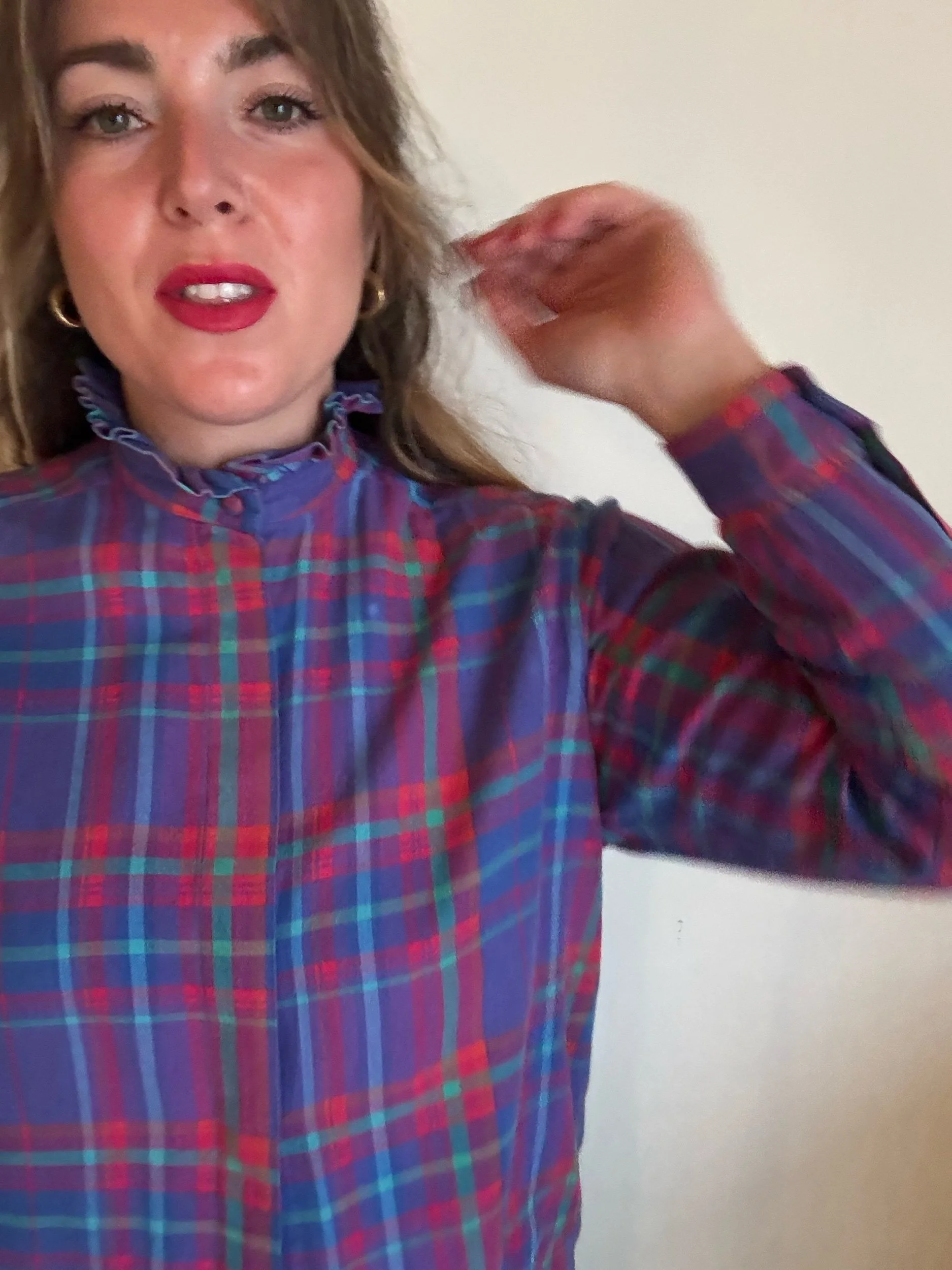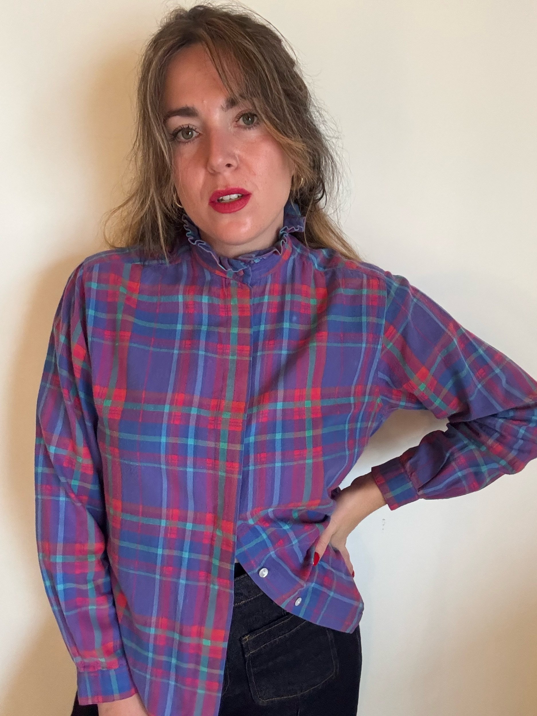 Fab 80s blouse in a fun, vibrant plaid. It’s festive but also works all year round, love the purples and teals together. High neck with ruffle collar