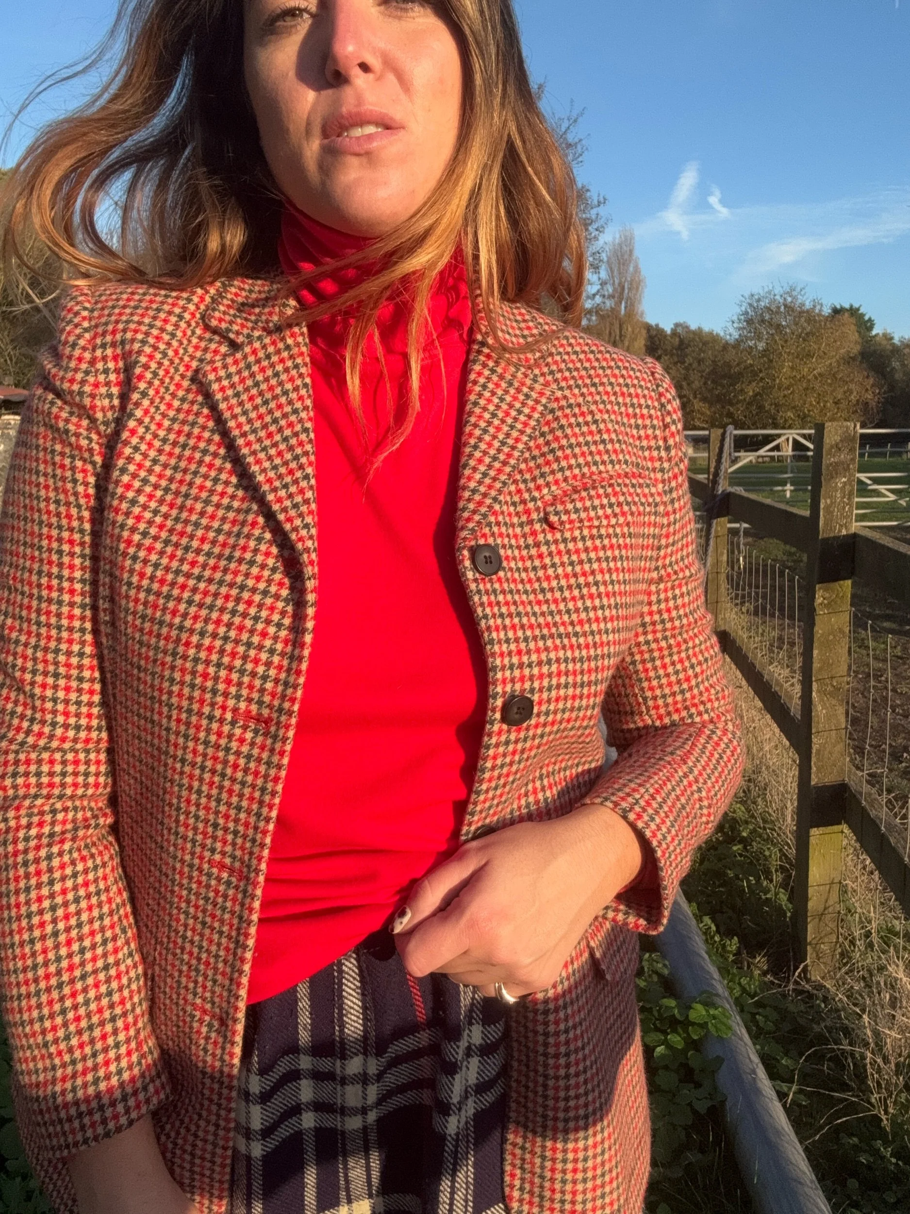 Gorgeous 90s French connection blazer with a stunning red ditzy houndstooth patter. Red lining. Perfect for the festive season!