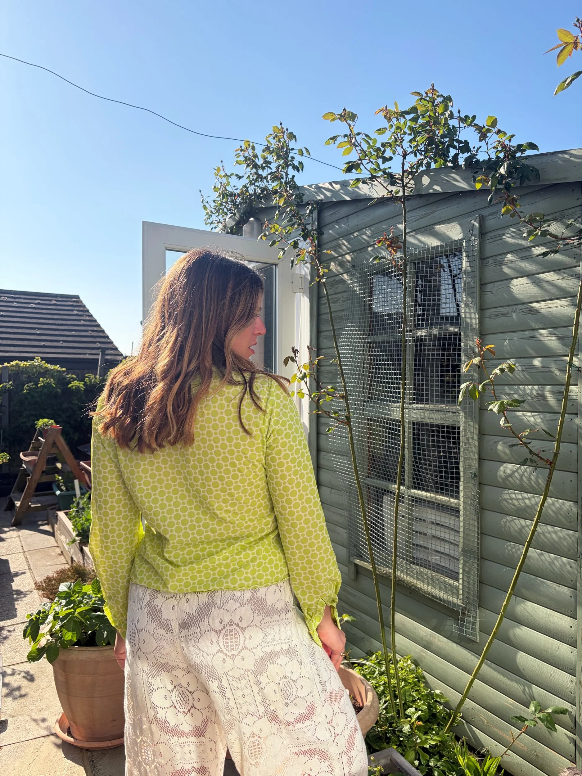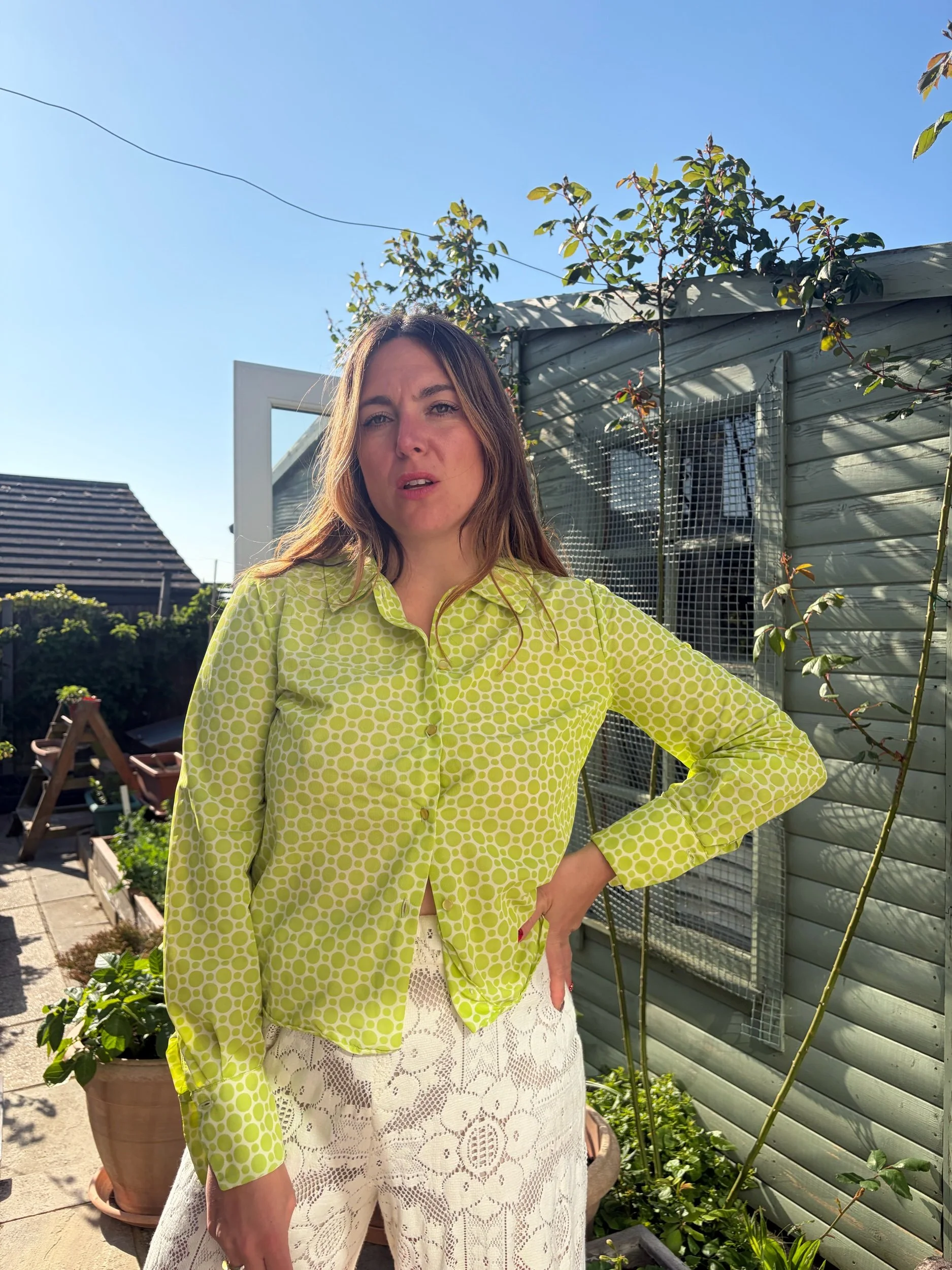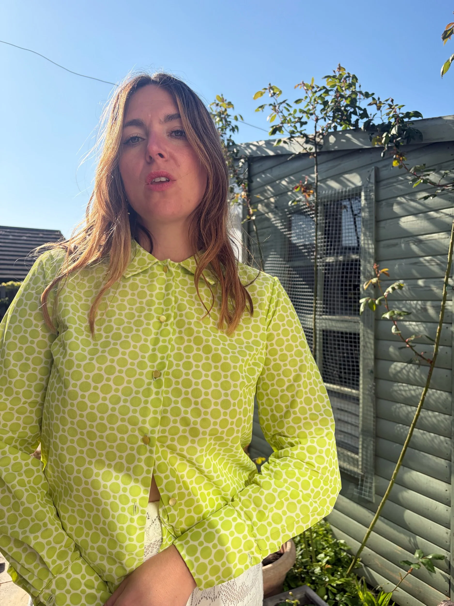 Absolutely love the zesty green colour and polkadot pattern of this blouse. Classic 70s shaping and fit.