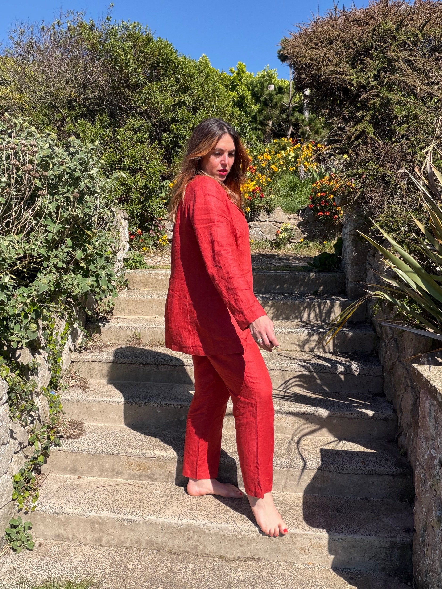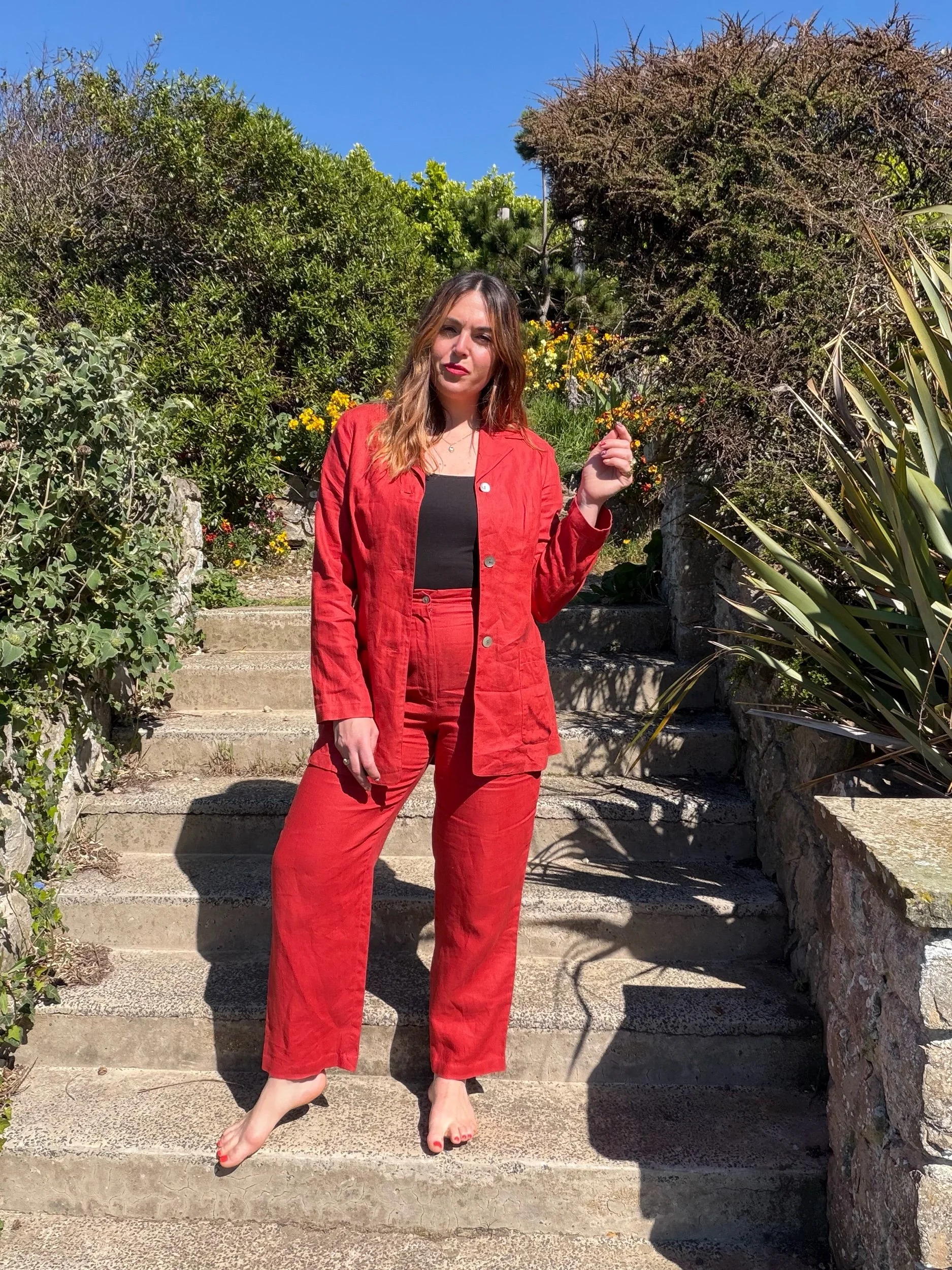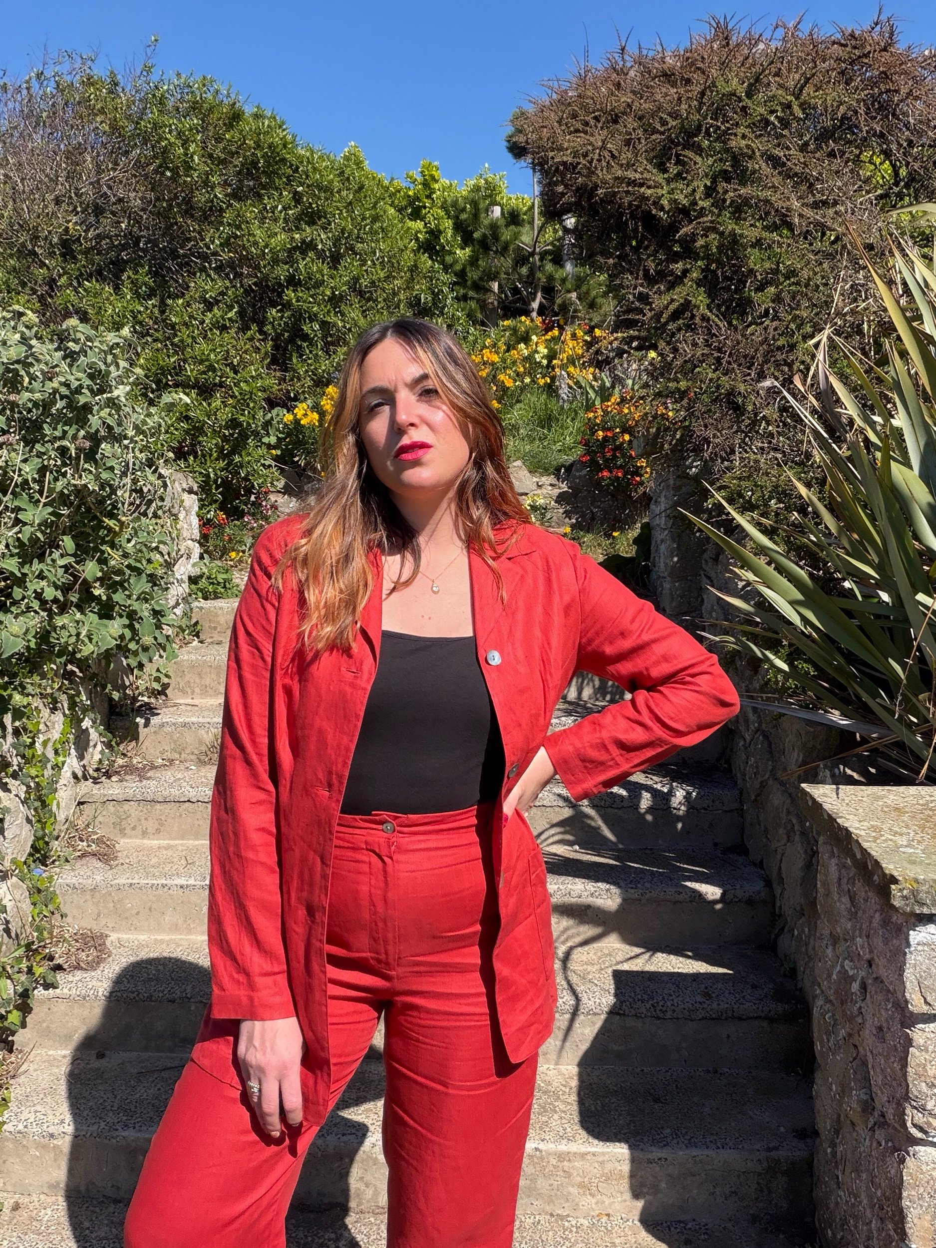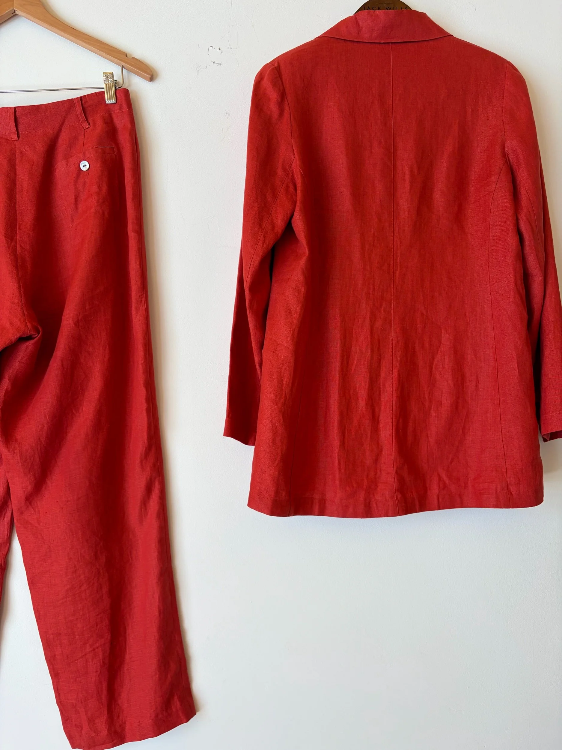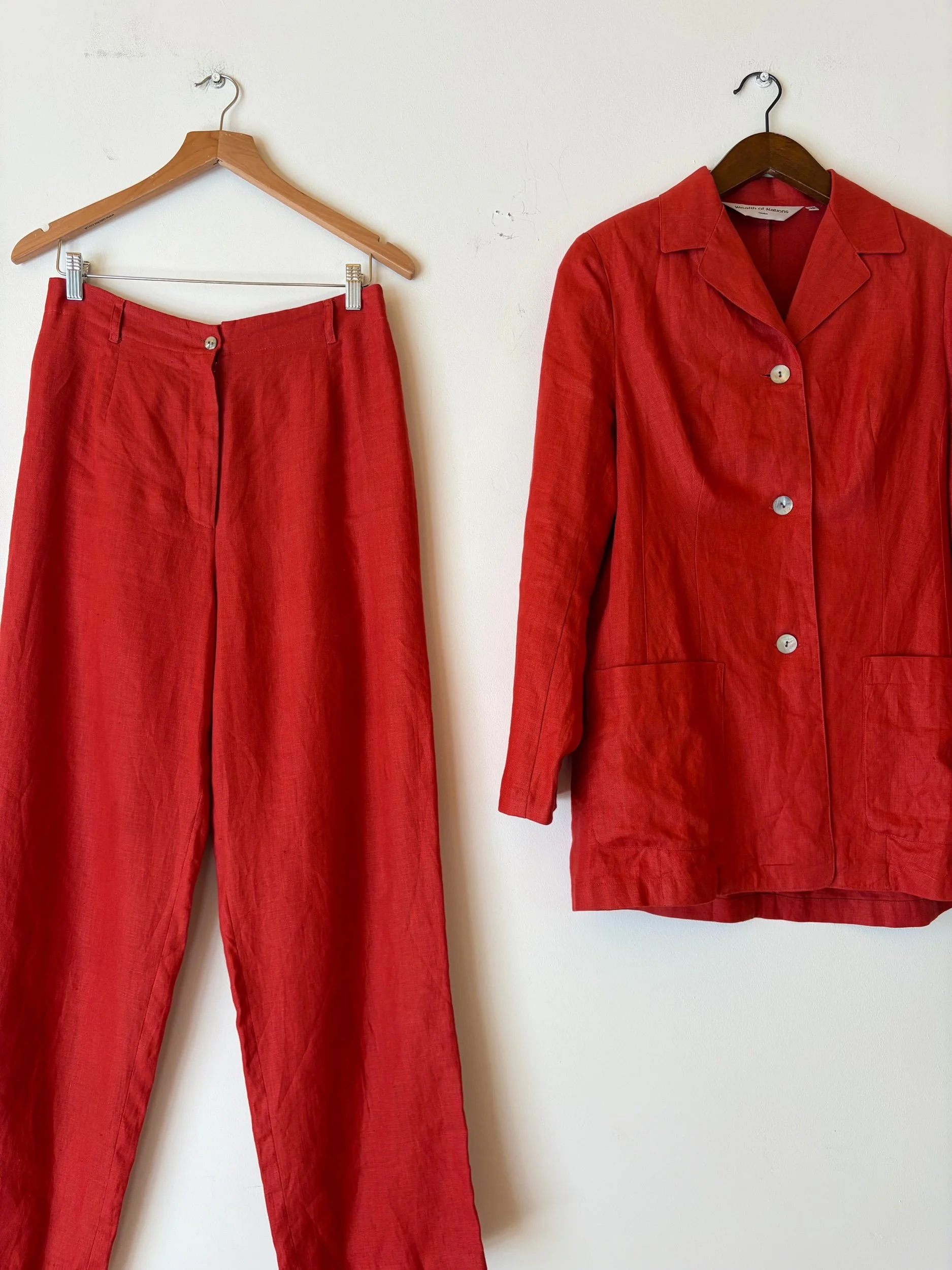 Adore this 90s suit so much. I feel like everyone needs a red power suit to boost their mood! The linen is sublime quality. I would totally wear this to a wedding or night out!