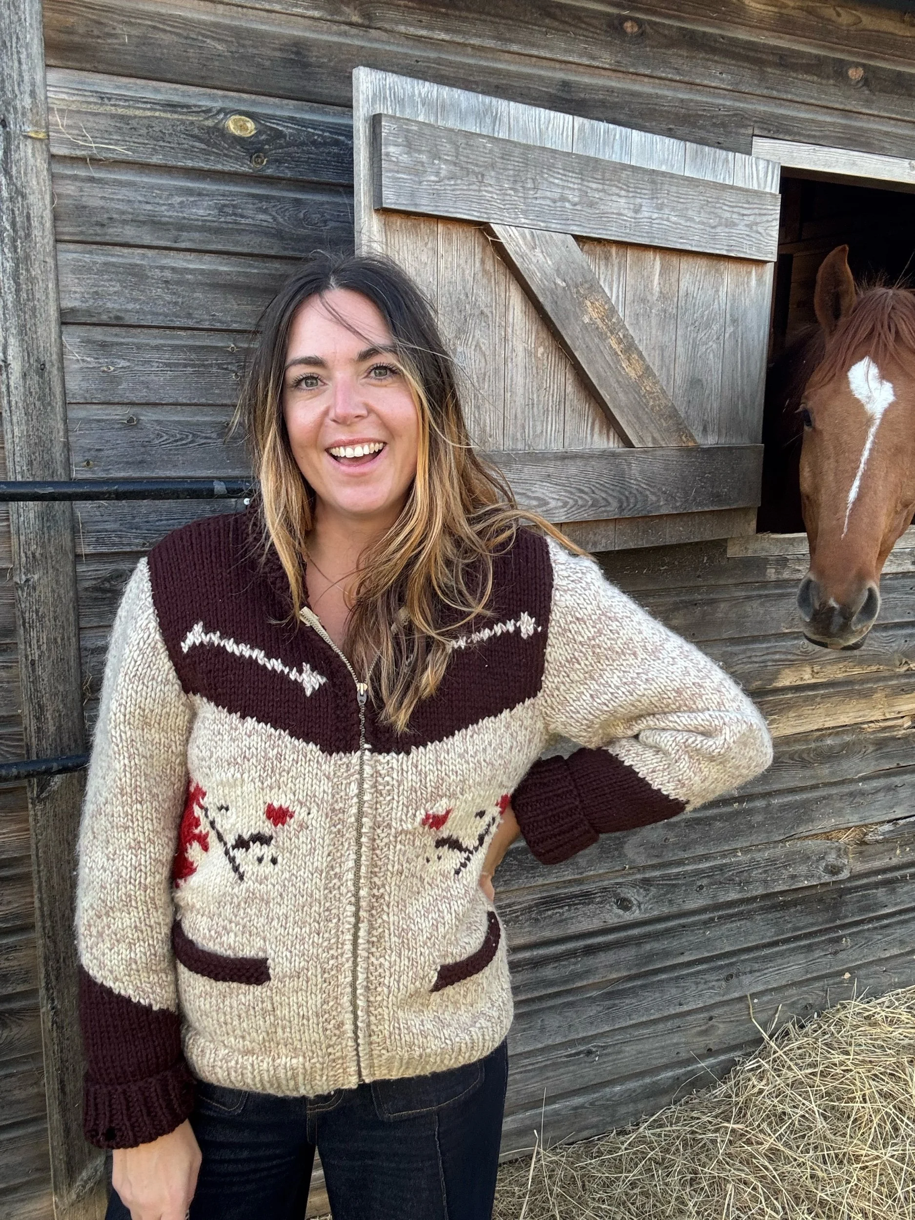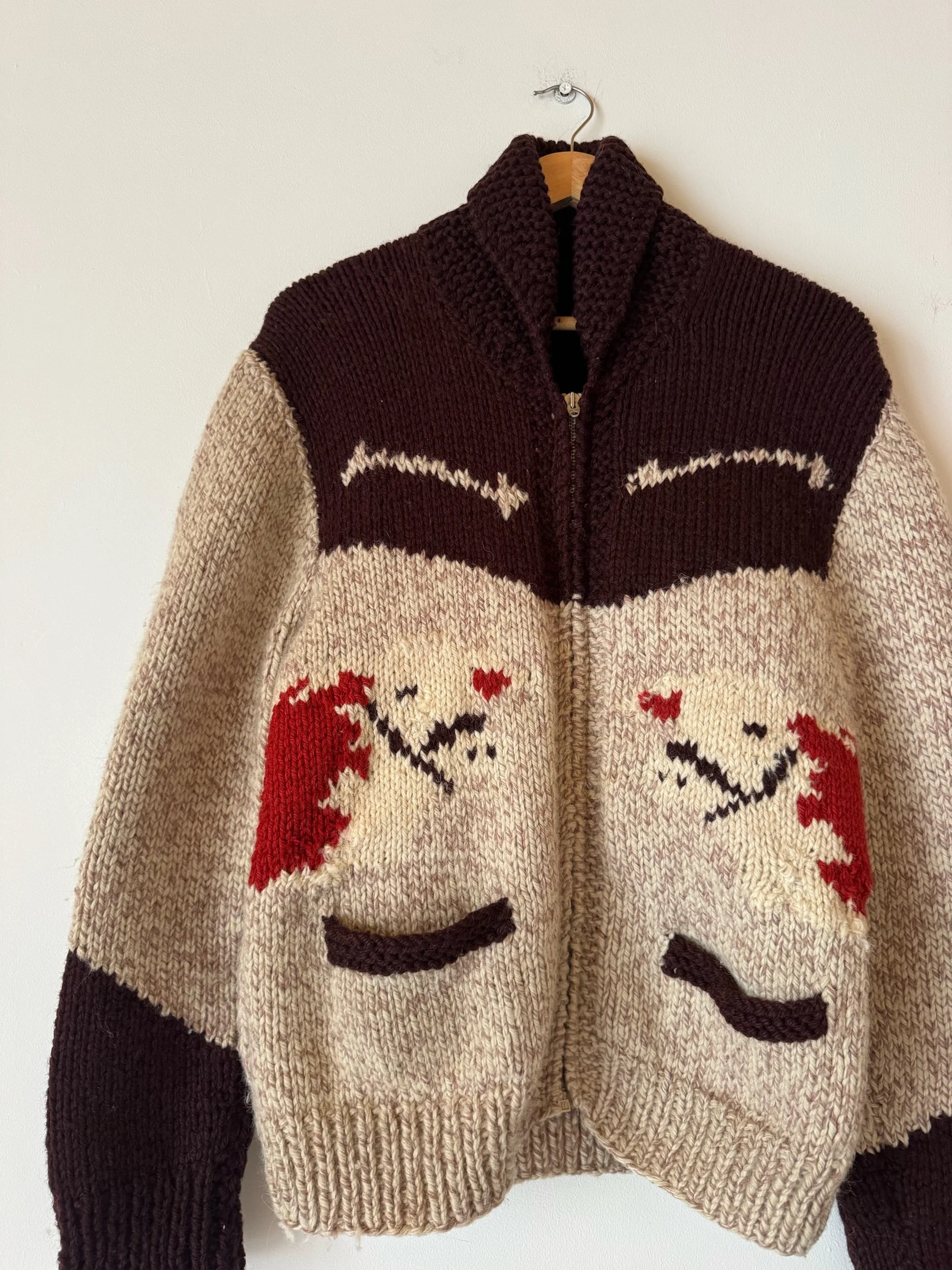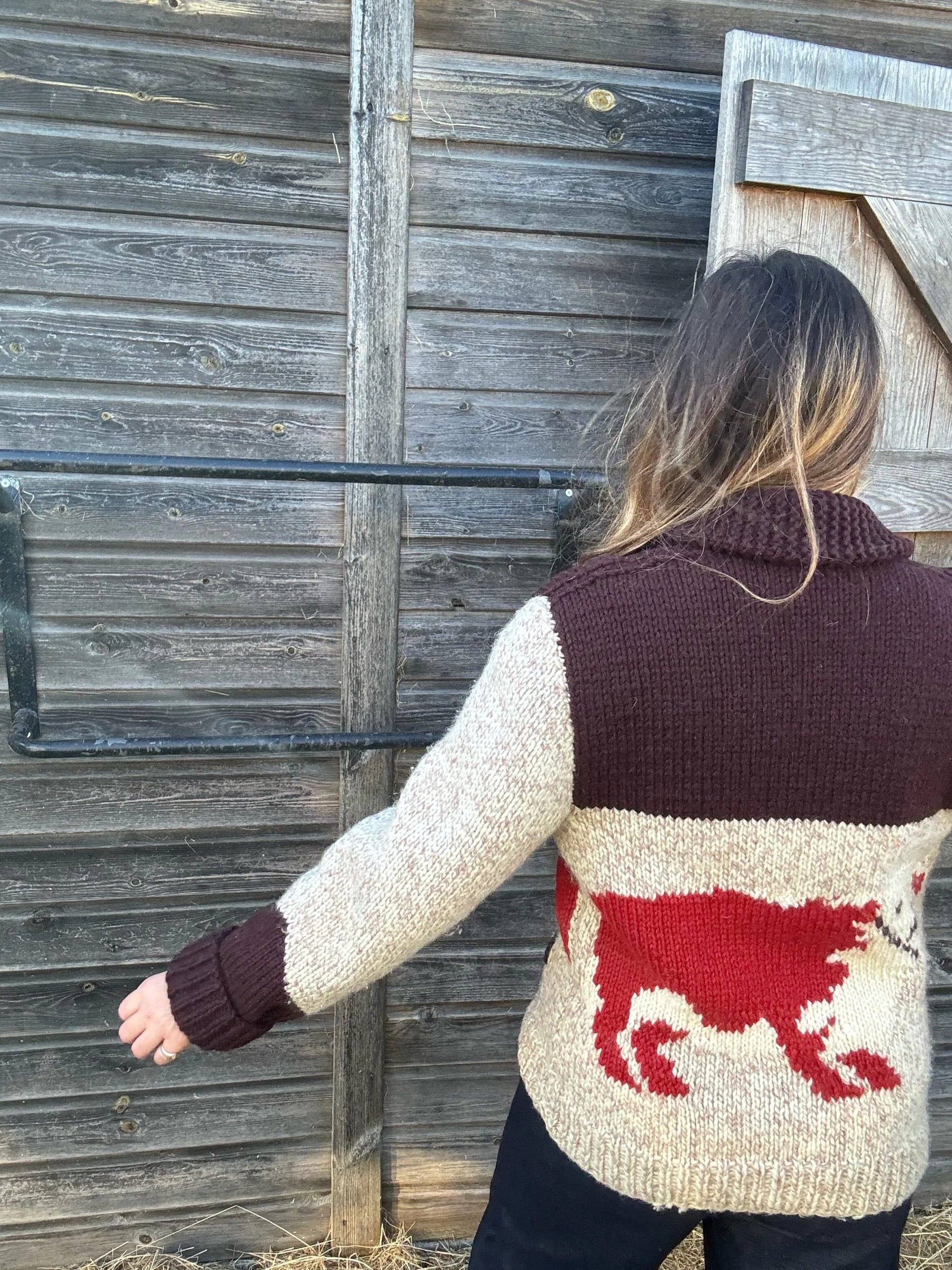 Super rare Cowingjan cardie from the 1970s. It’s giving a western feel with the brown and rich red. Zips to the front