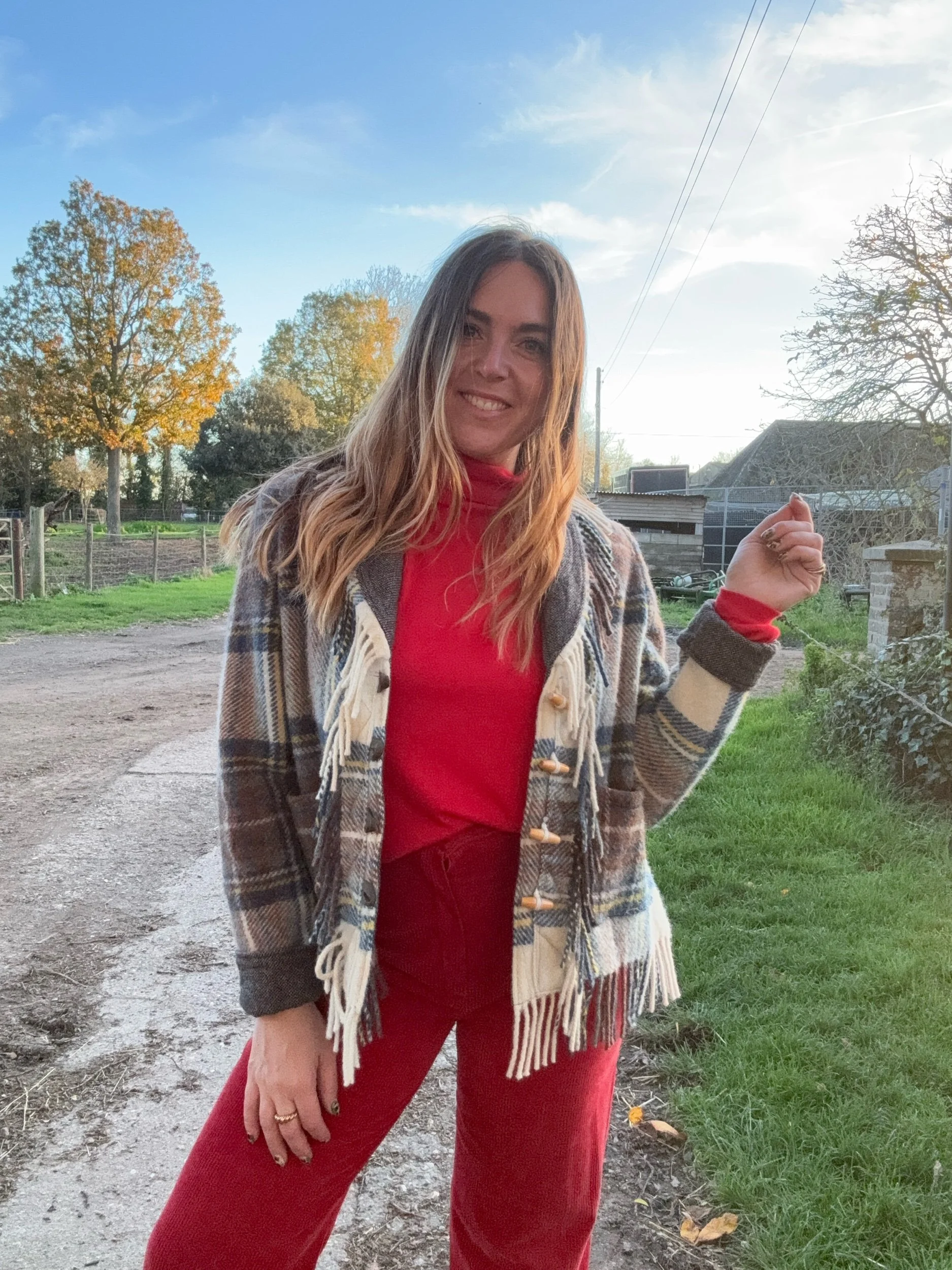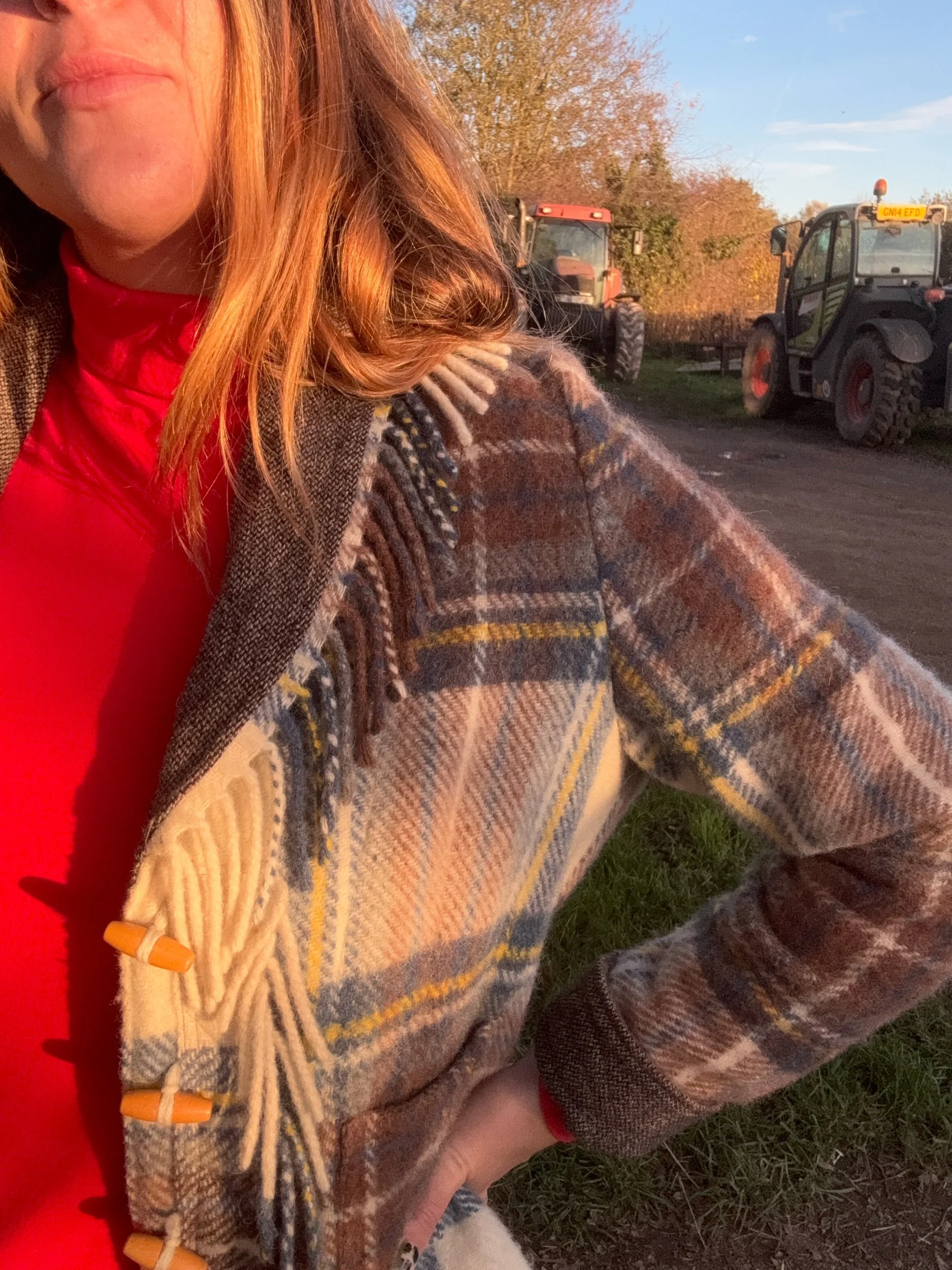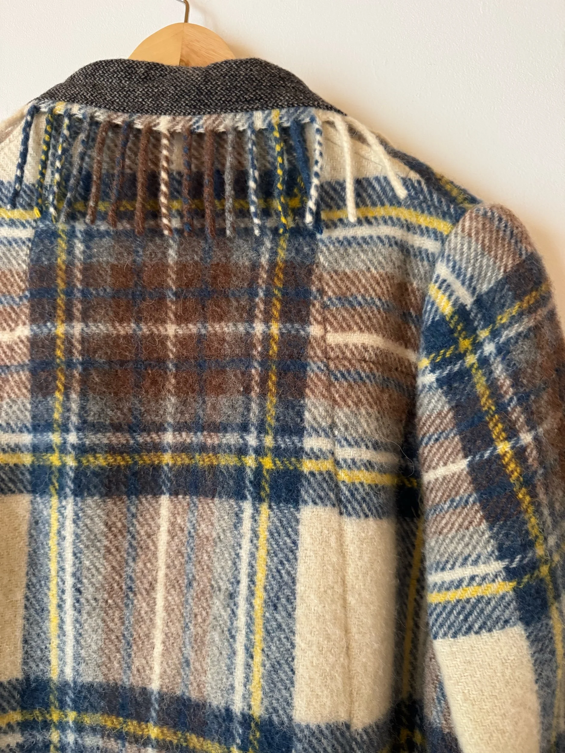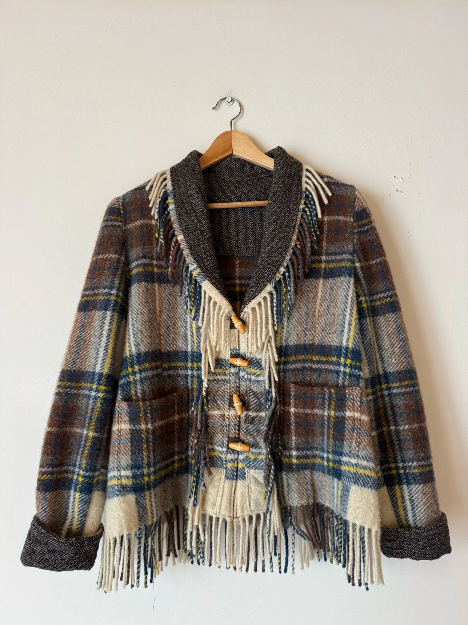 Such a beautiful blanket coat with grey and blue tones in the tartan. Equipped with grinding and wooden toggle buttons. Looks great with a roll neck underneath