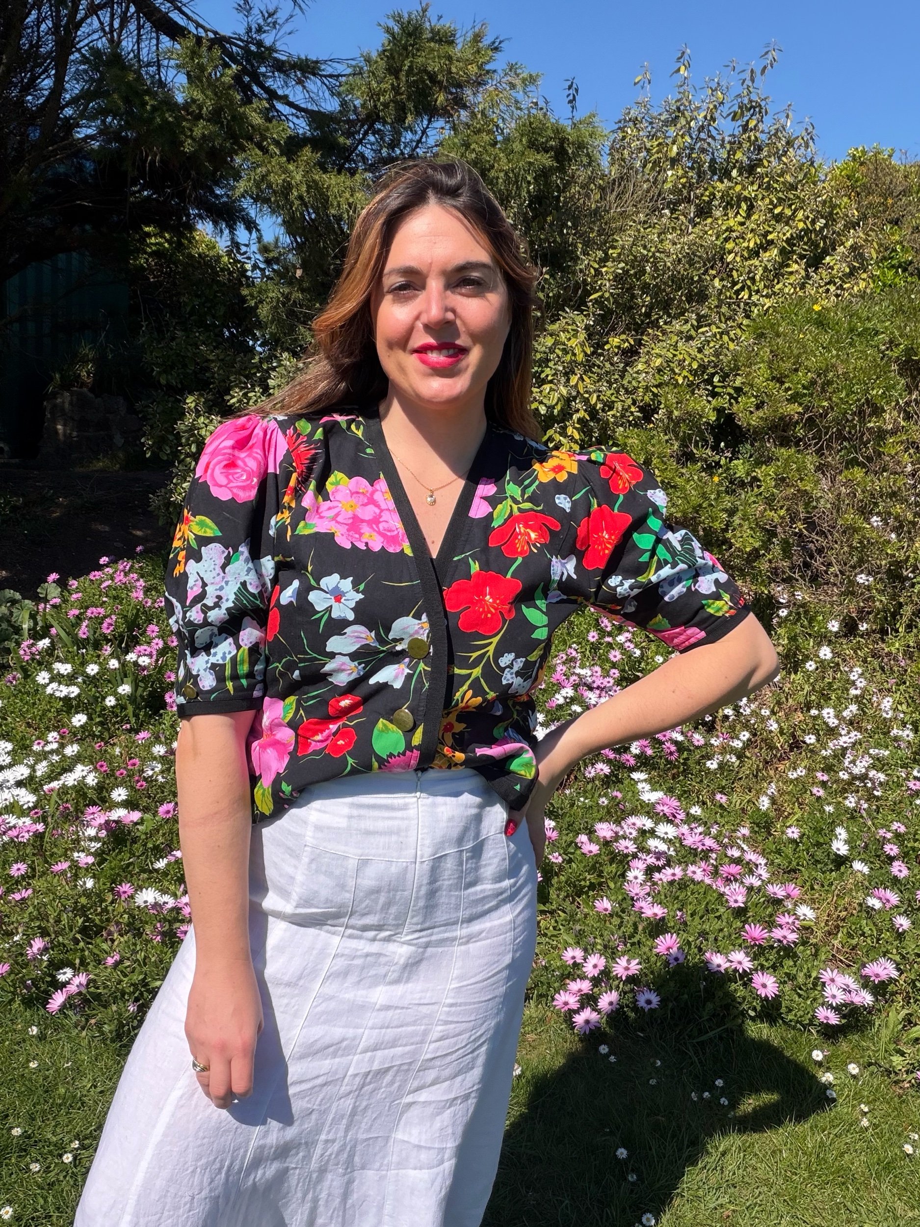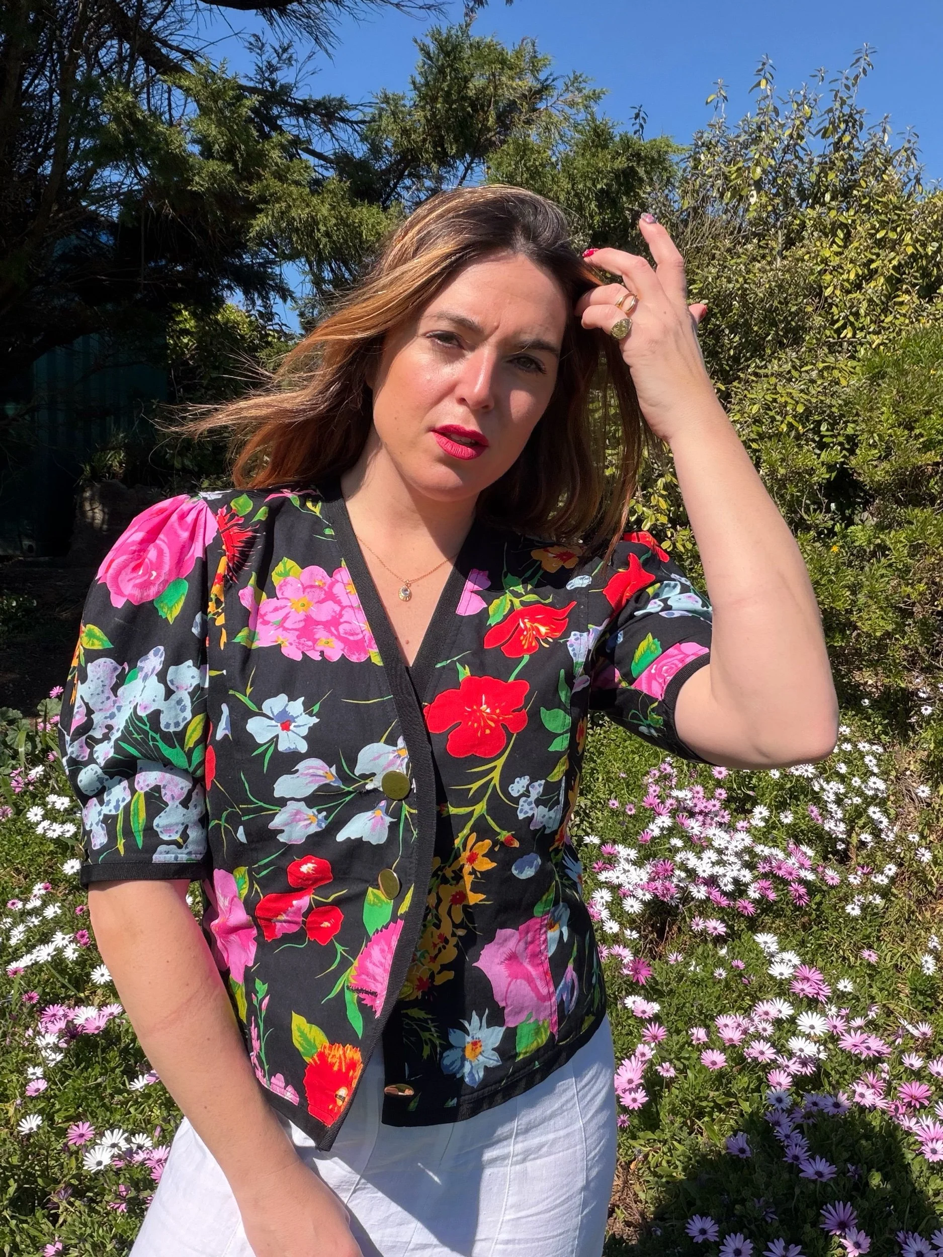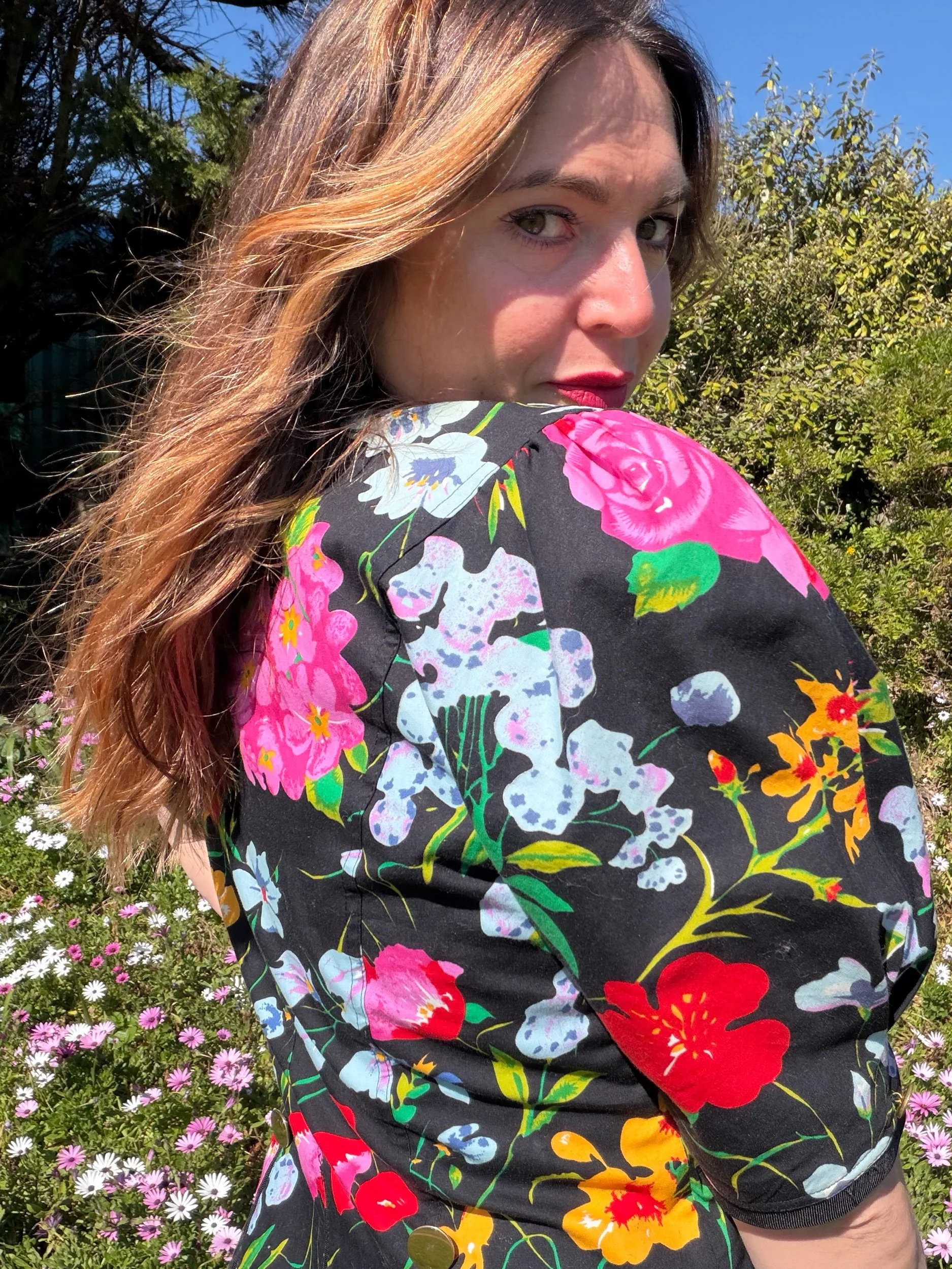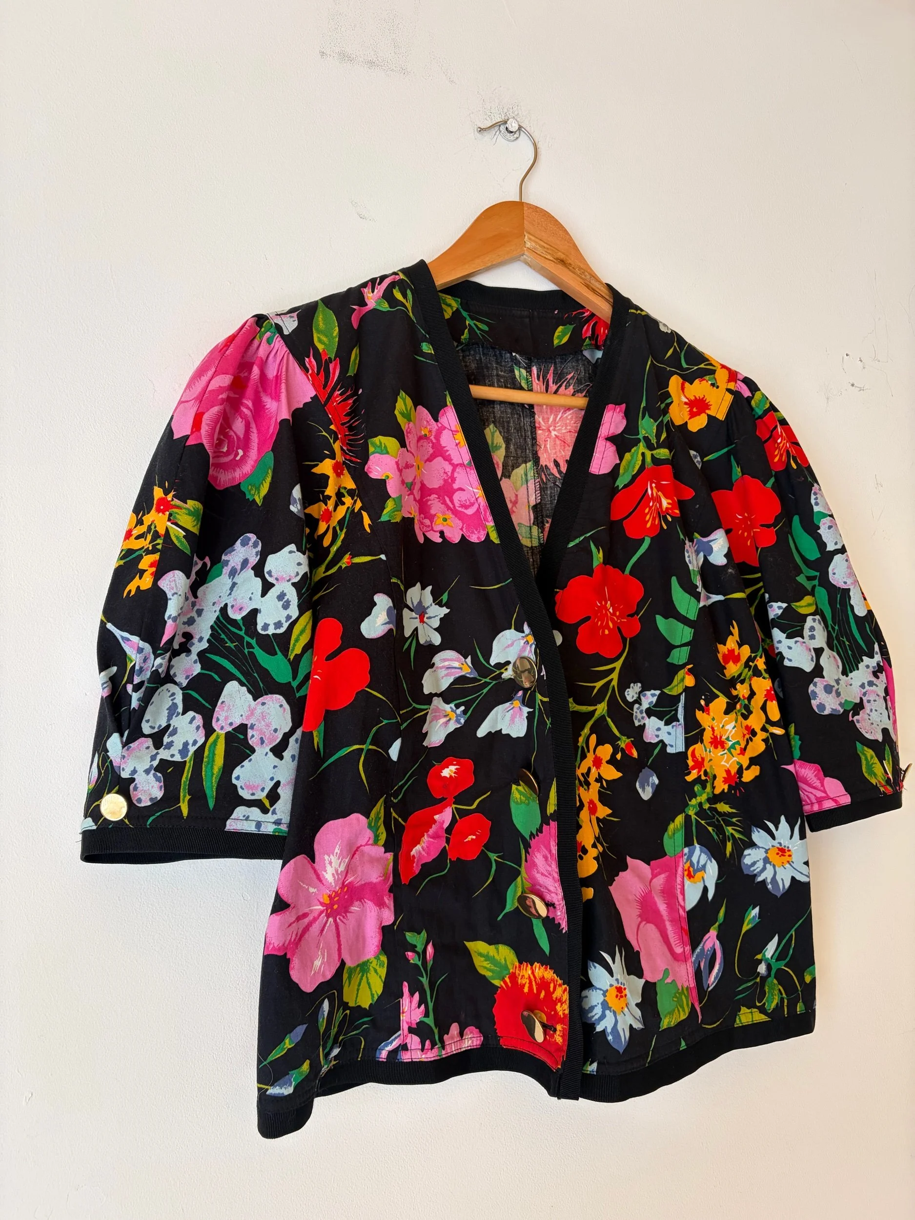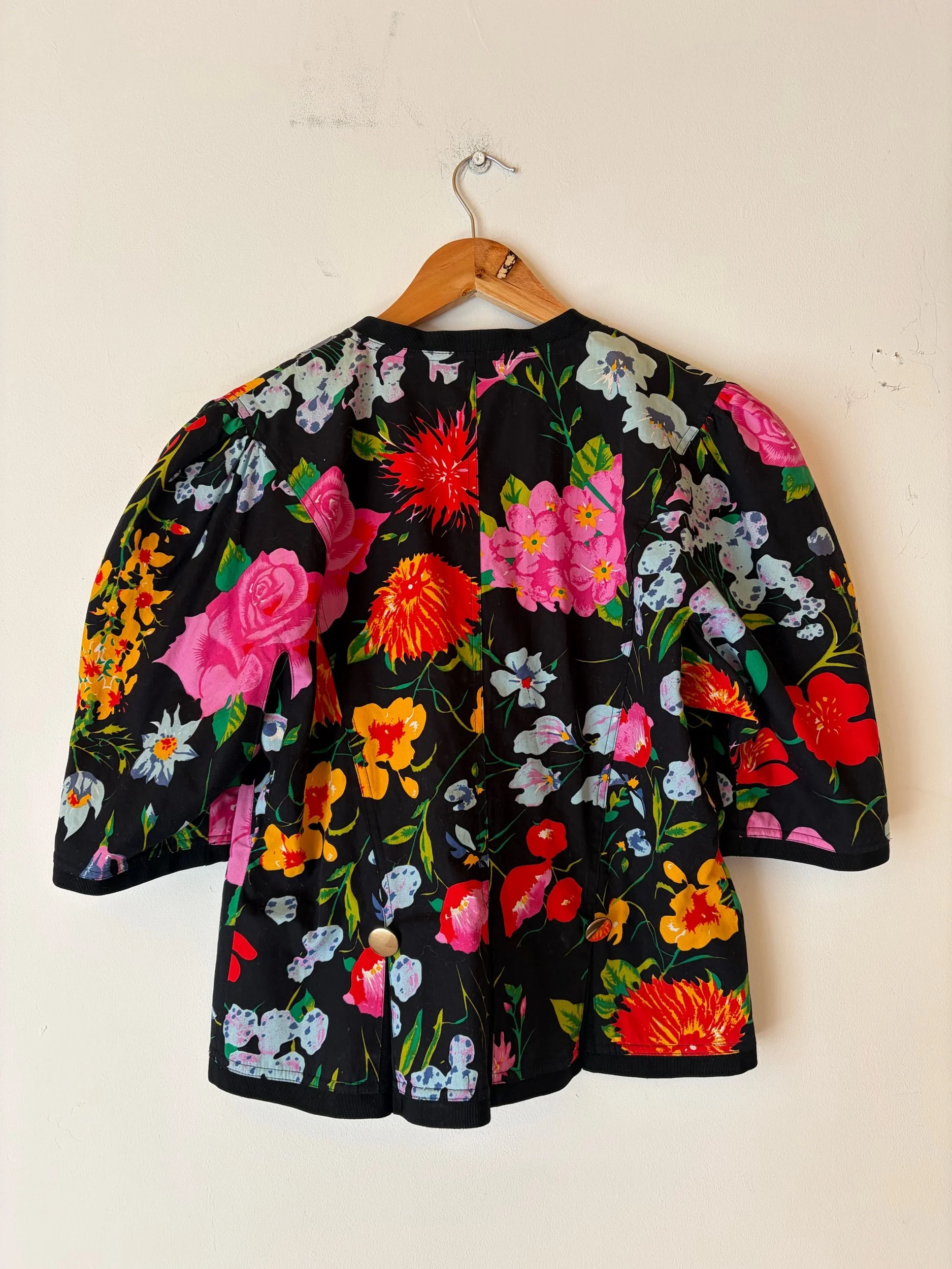 Stunning balloon sleeve blouse with such an epic wild floral print. Love the colour palette and boldness against the black. Large silver button detailing.