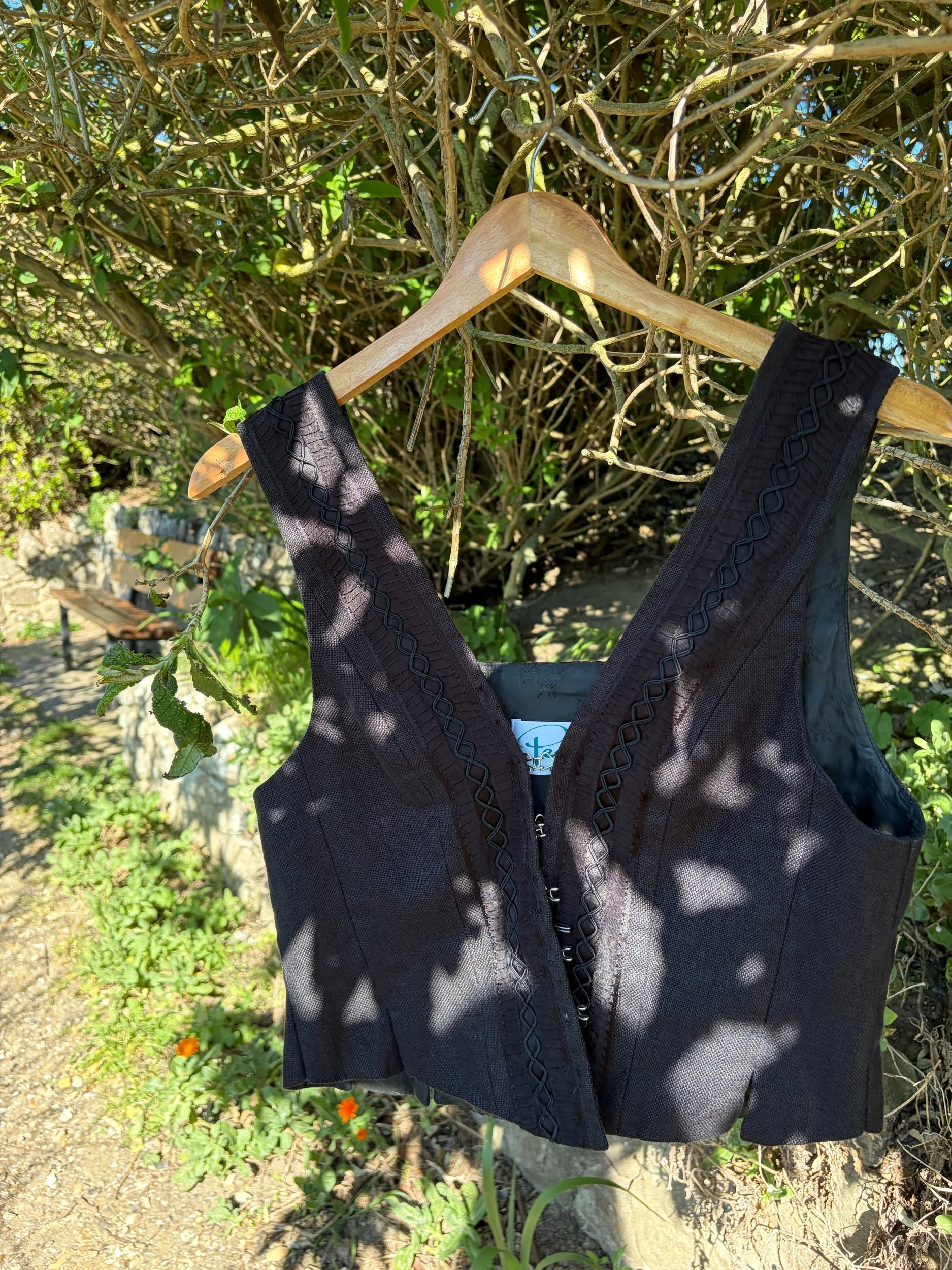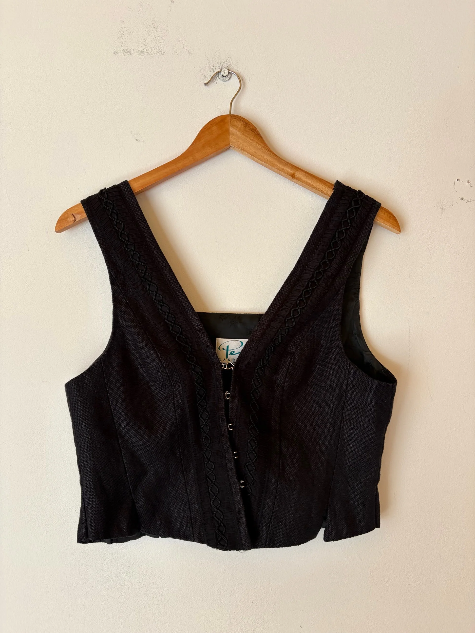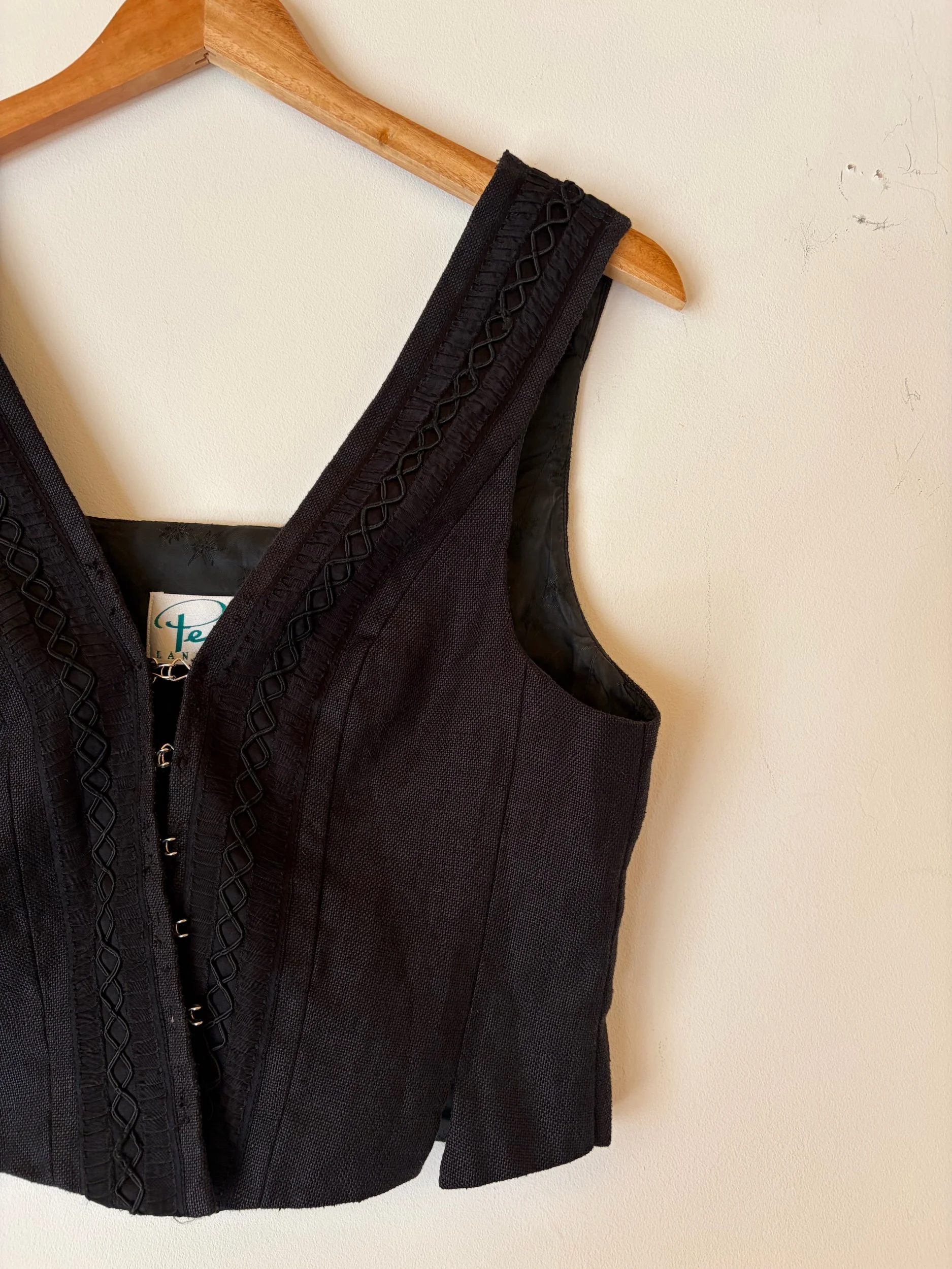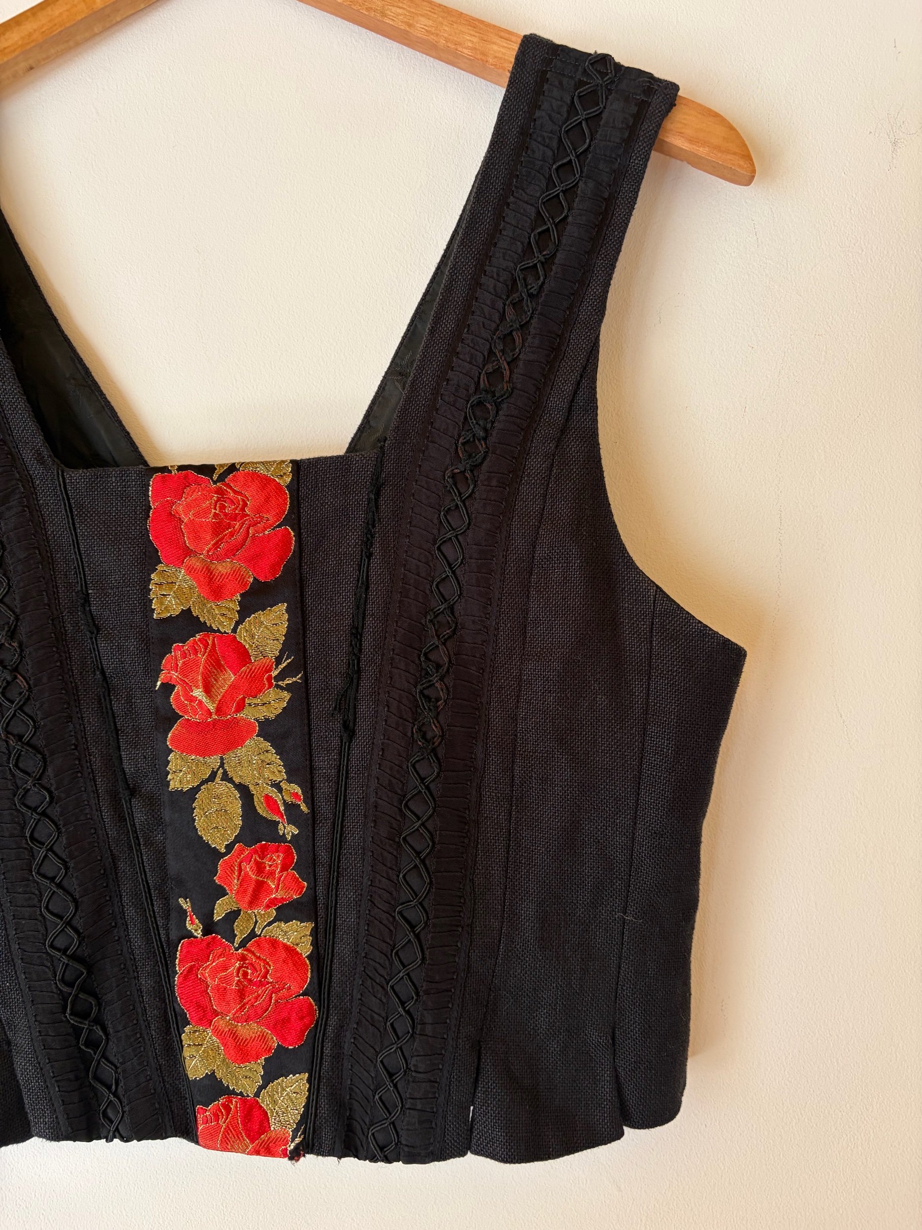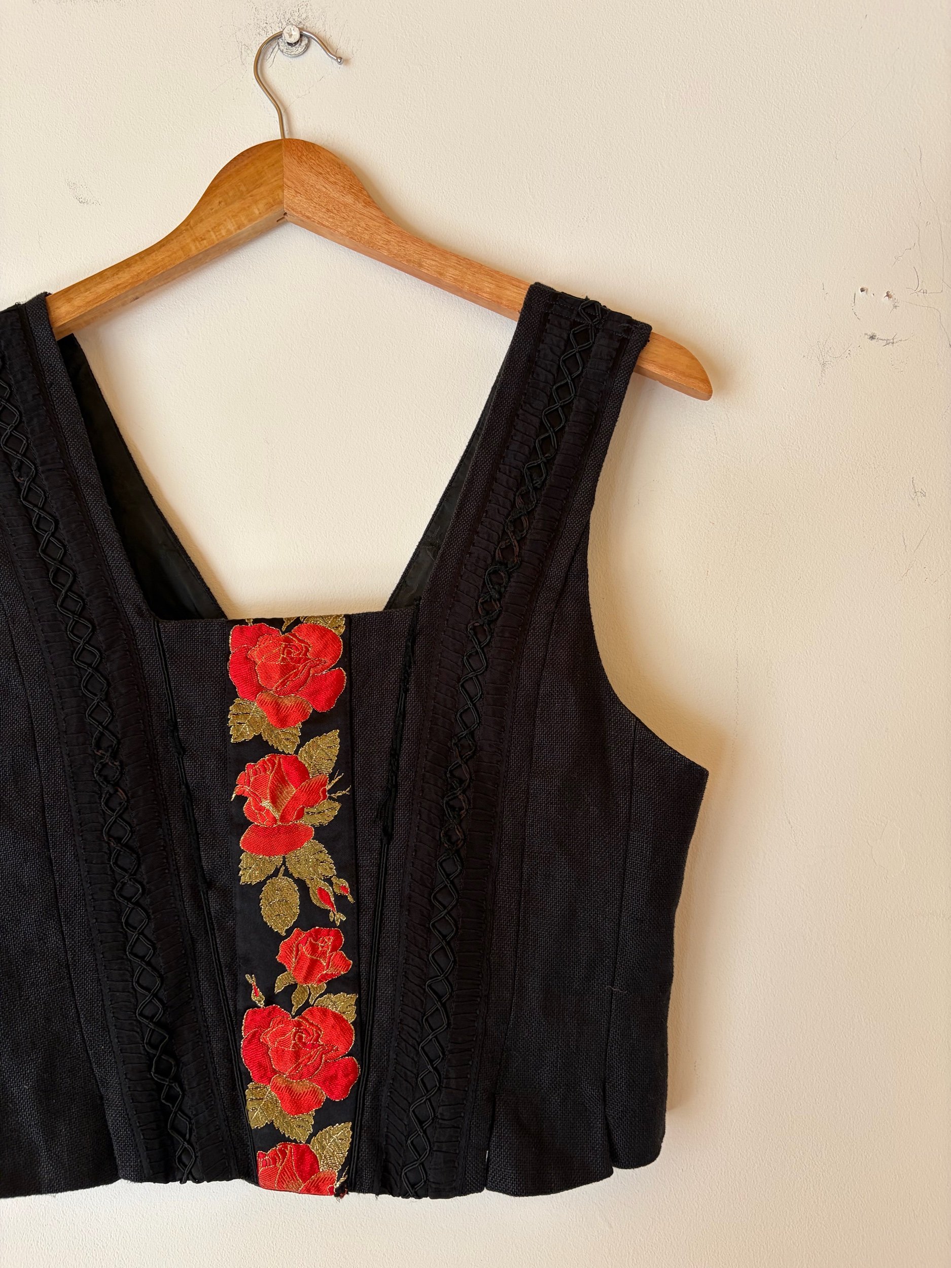 Late 70s corset top, with hook and eye fastening. Cropped length which is super cool. Love the pink floral motif at the back. Can be worn both ways :)