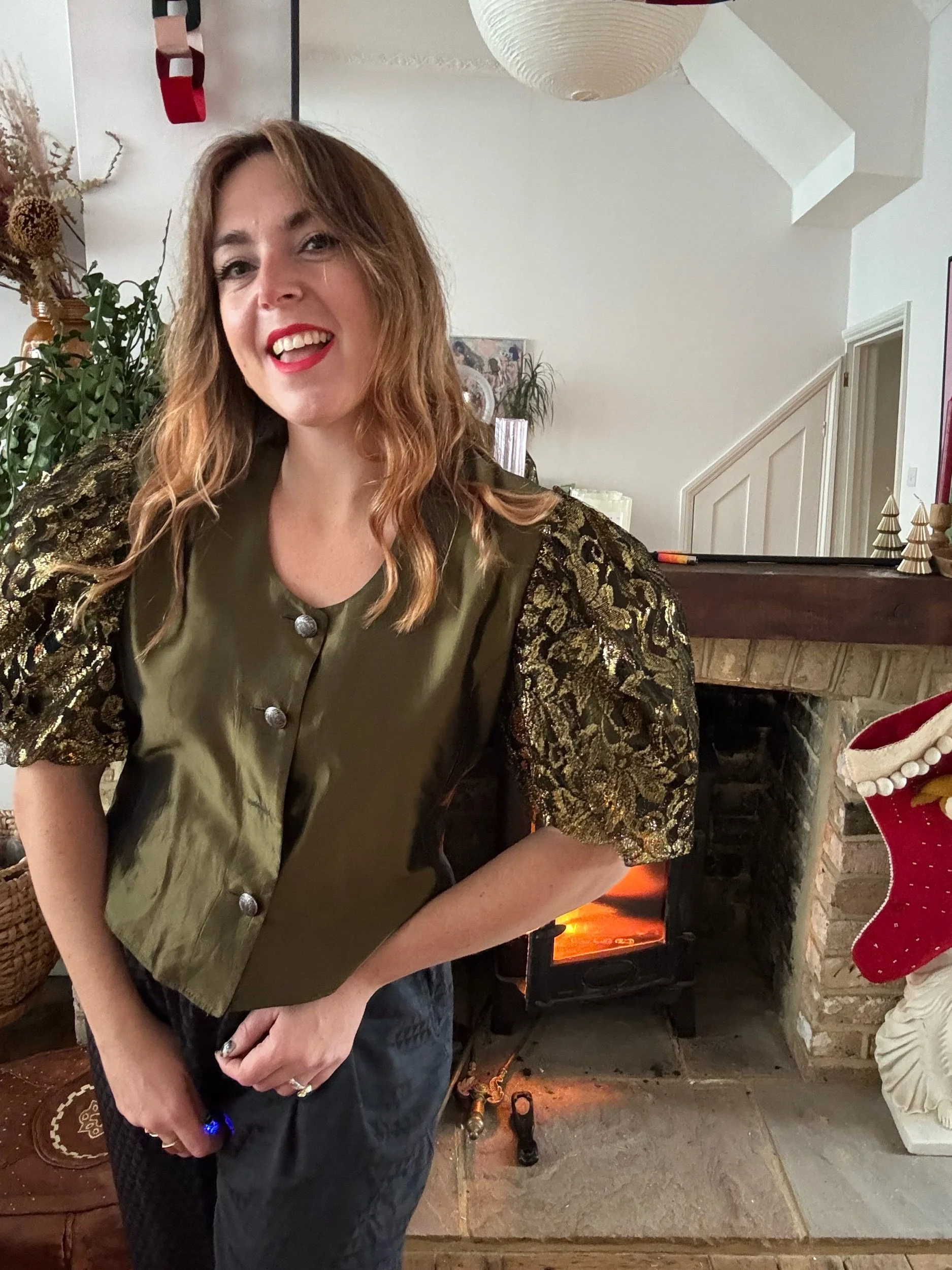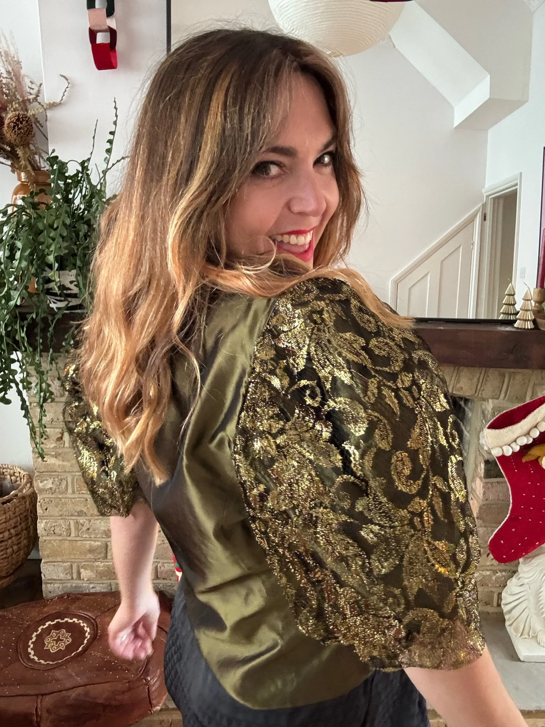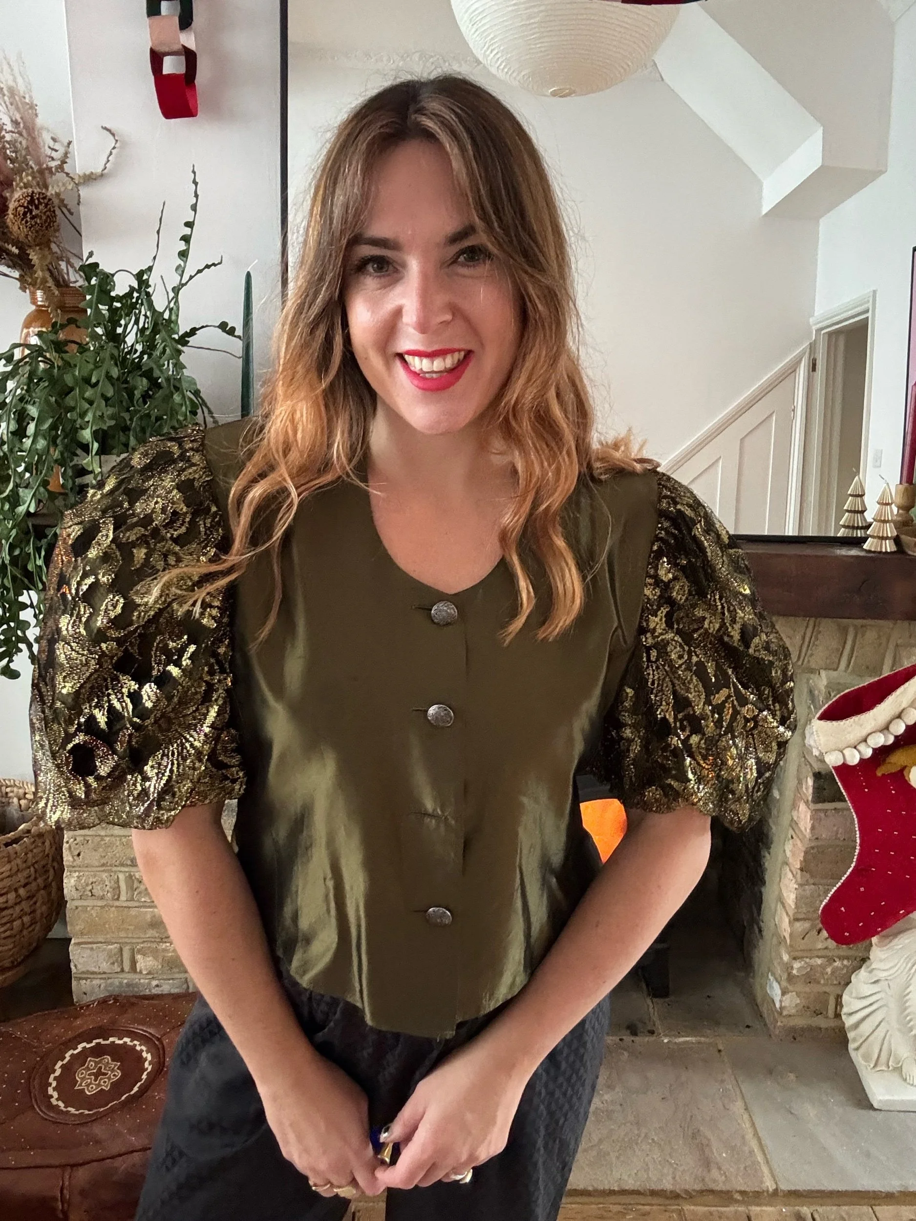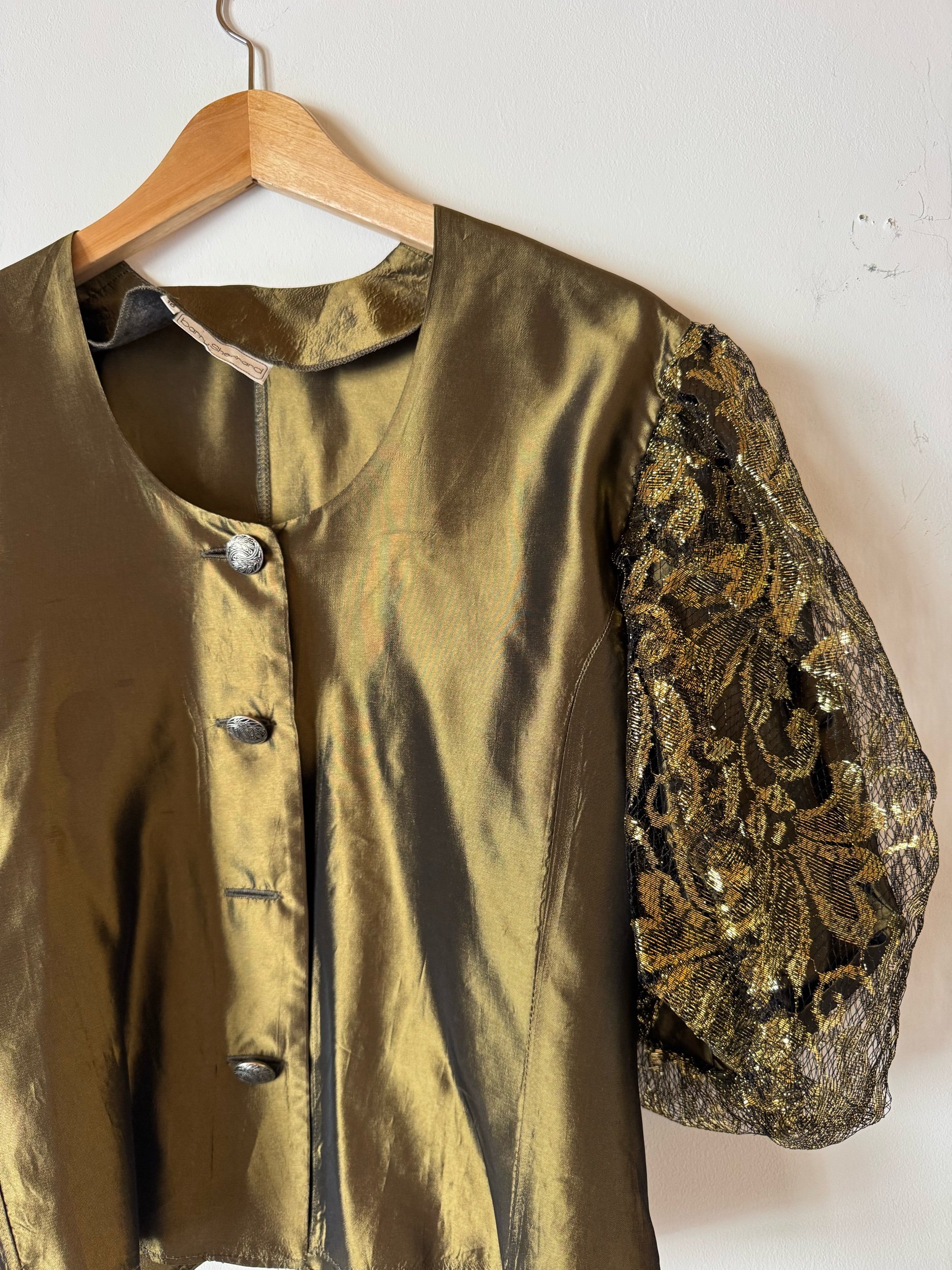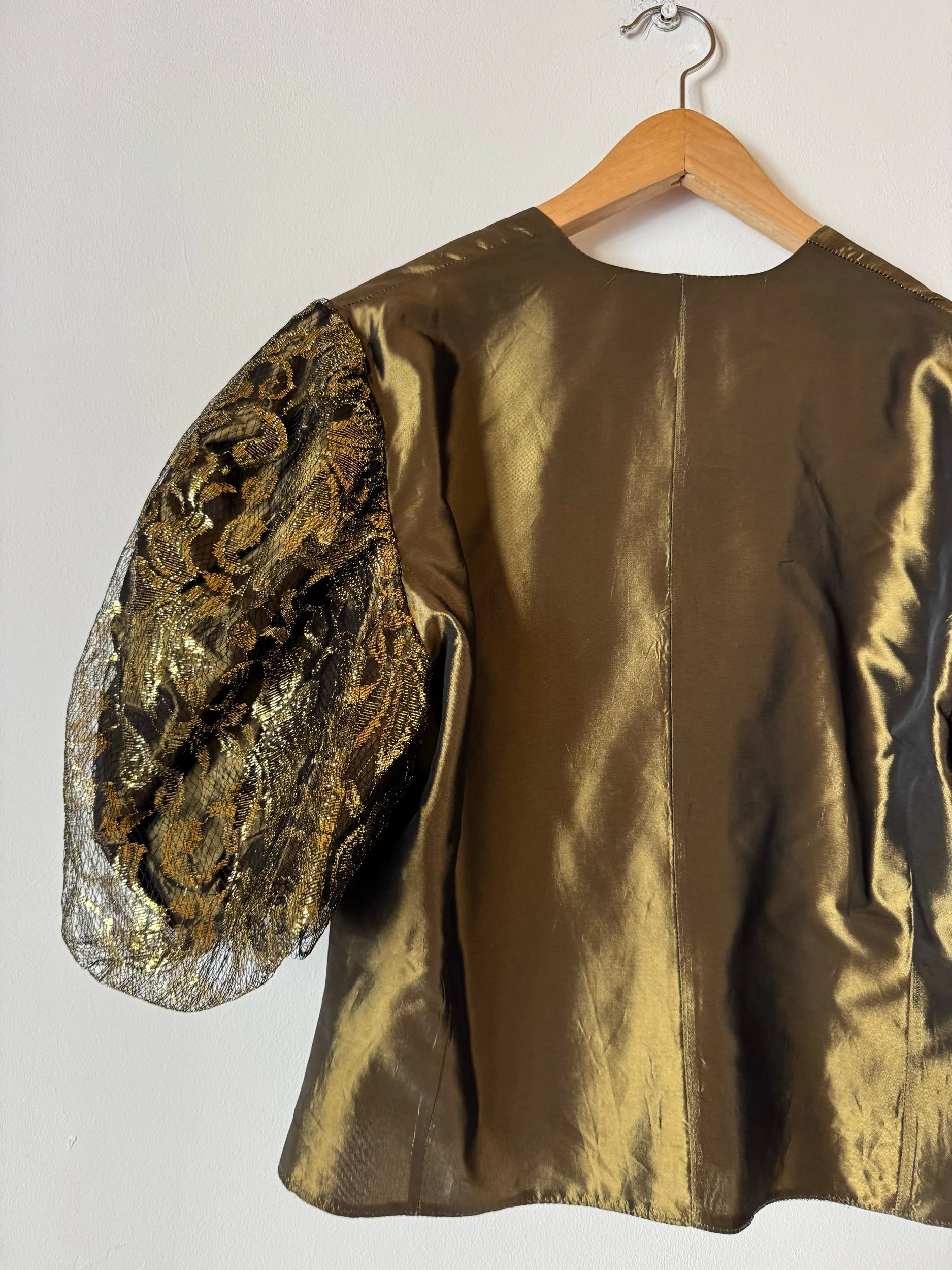 80s gold balloon sleeve blouse, stunning voil material with a metallic gold lace sleeves. Gold buttons. Such a fab structure and looks amazing with black.