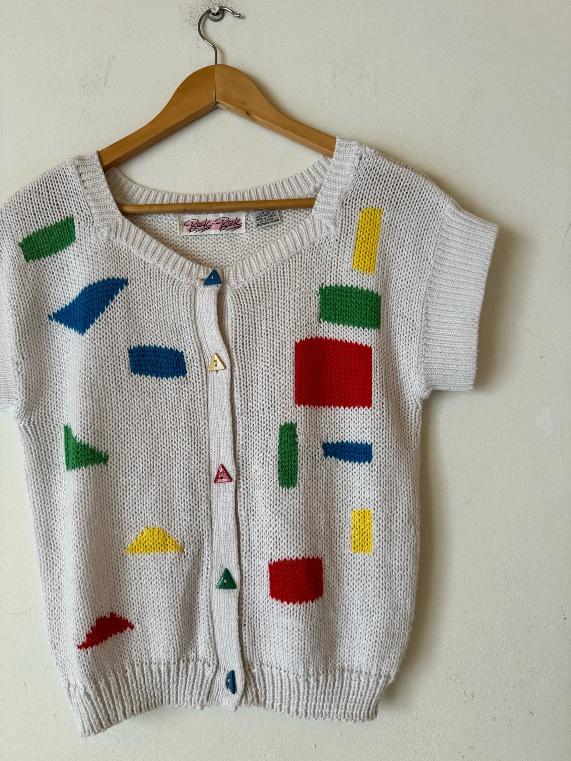 lovely little short sleeved jumper. White base with primary colour abstract shapes.. cute button detailing. Approx 80s era.