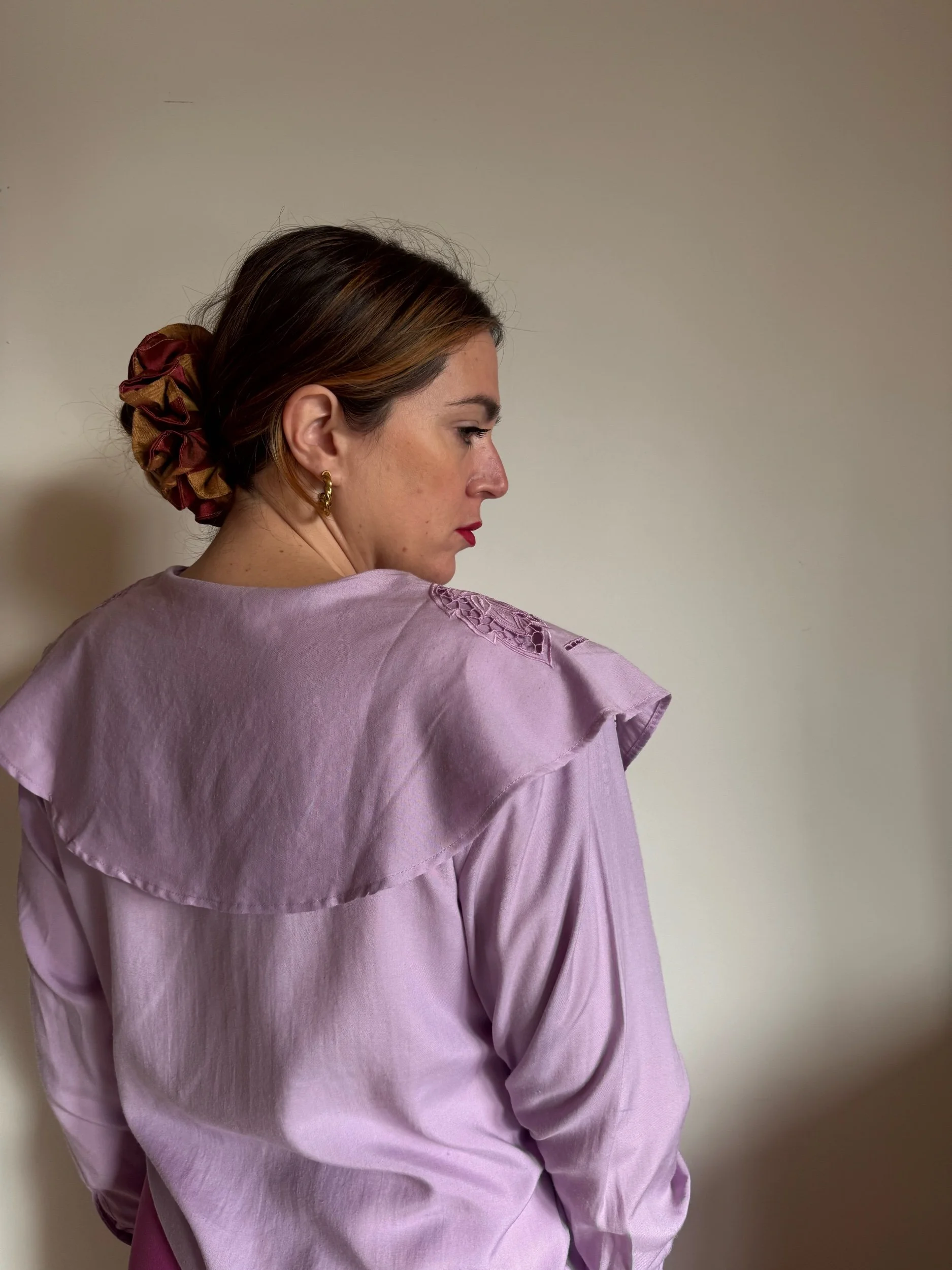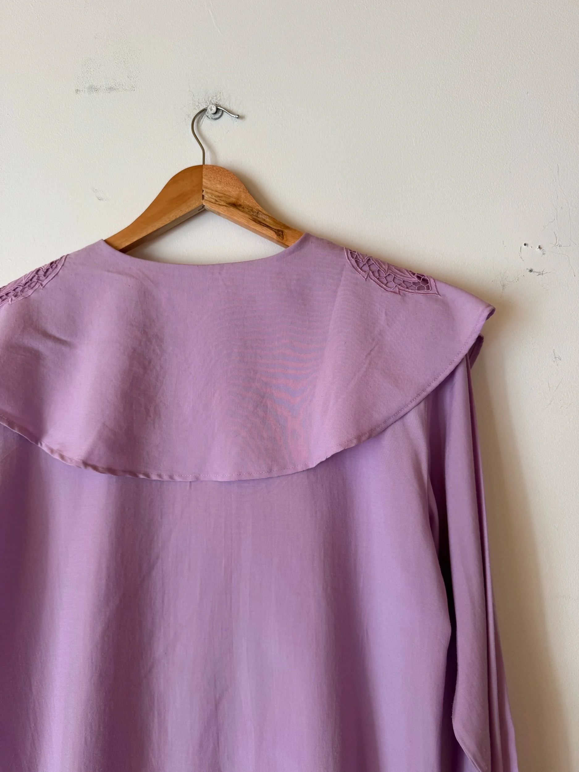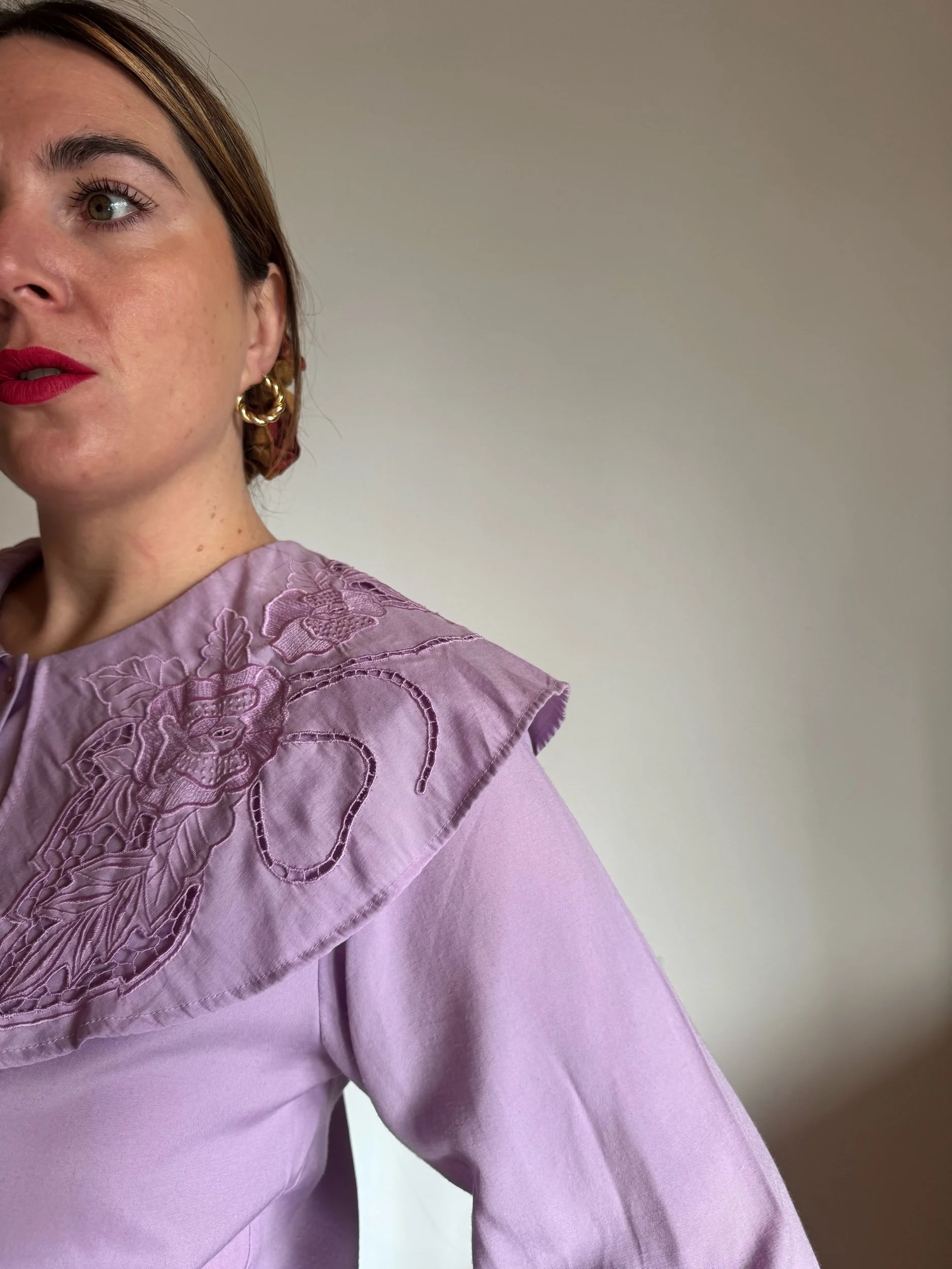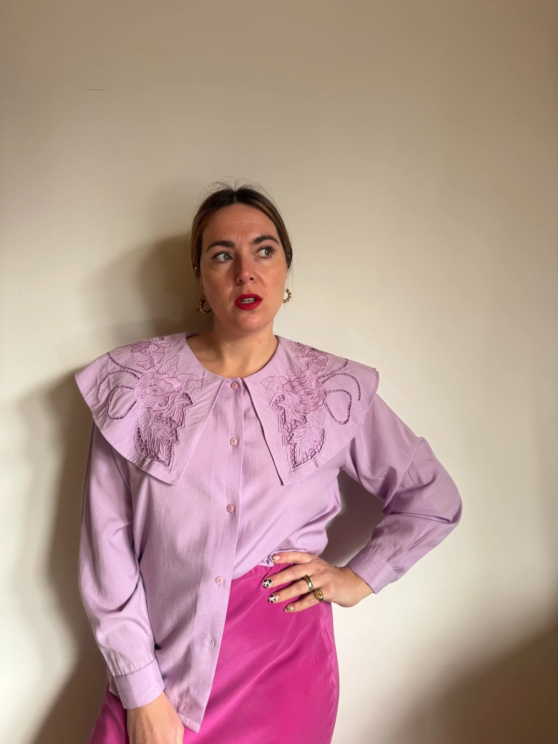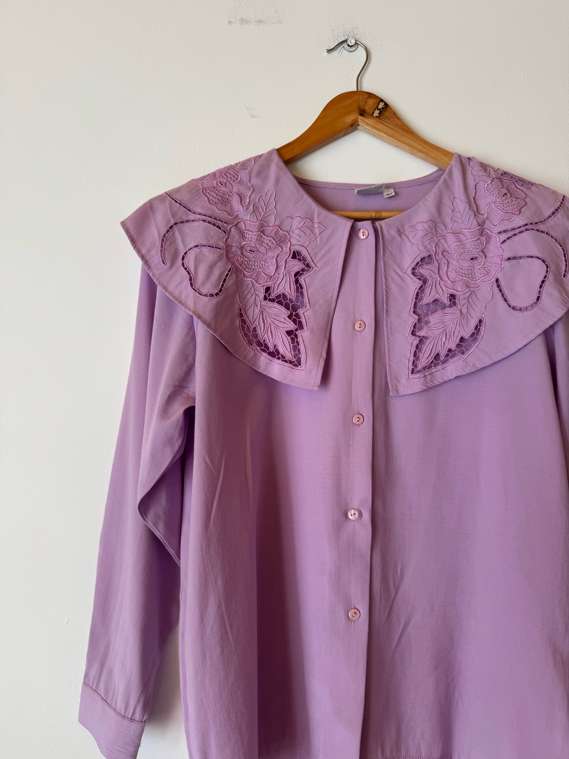 Amazing 80s statement blouse! Loving the full Collar with die cut detailing. Very pretty collar and works super well with denim or dungarees. Perfect spring blouse!