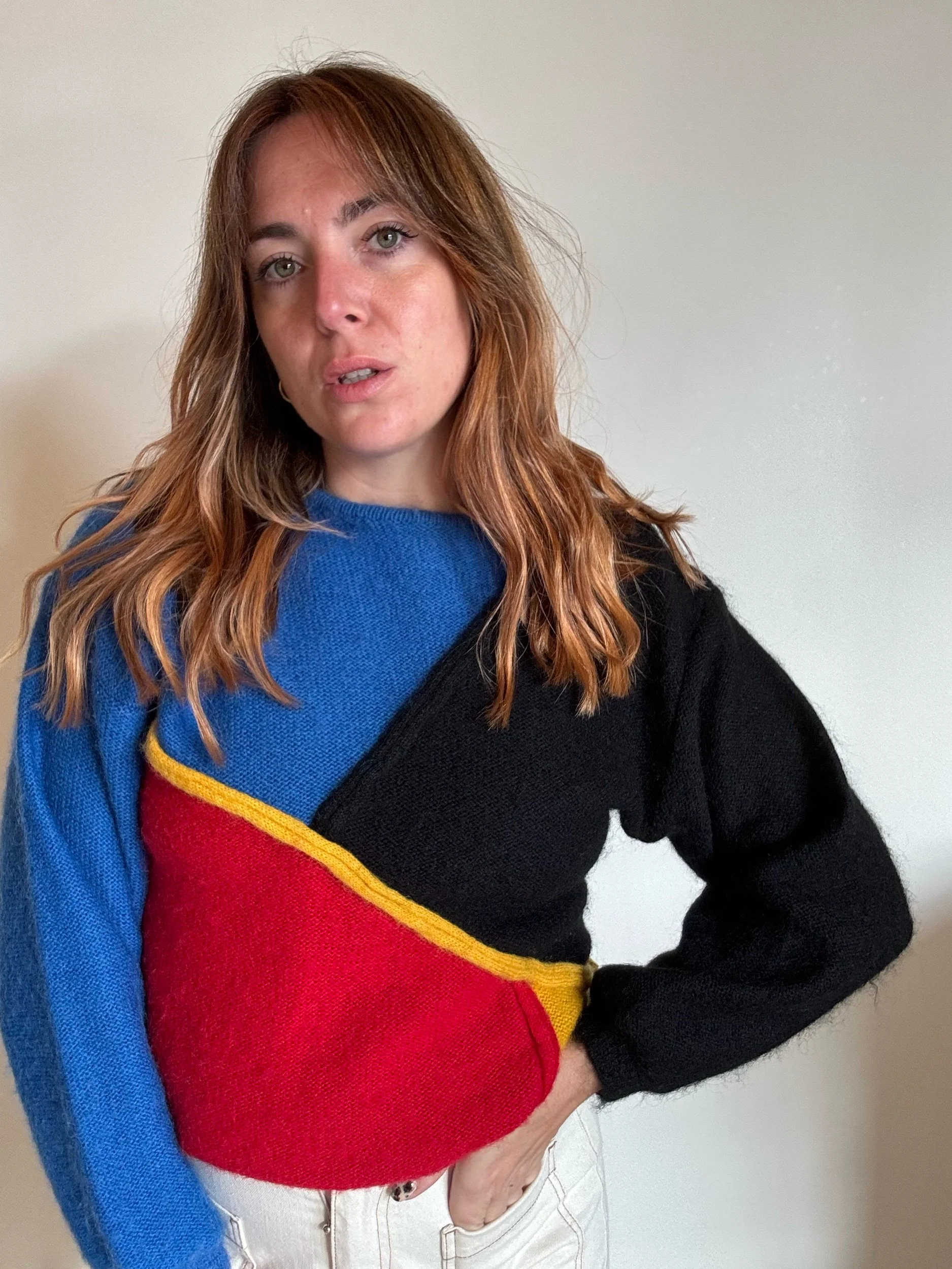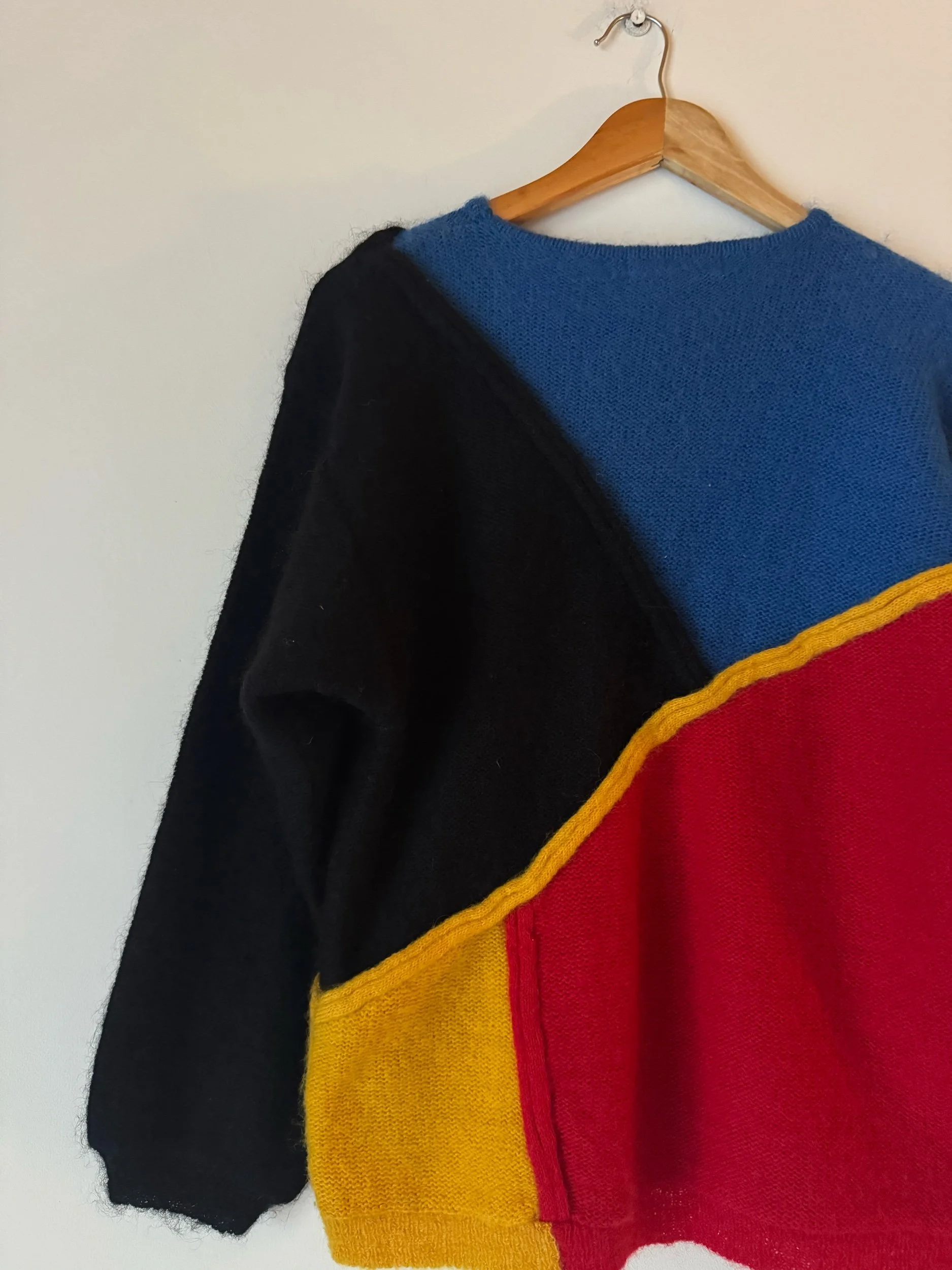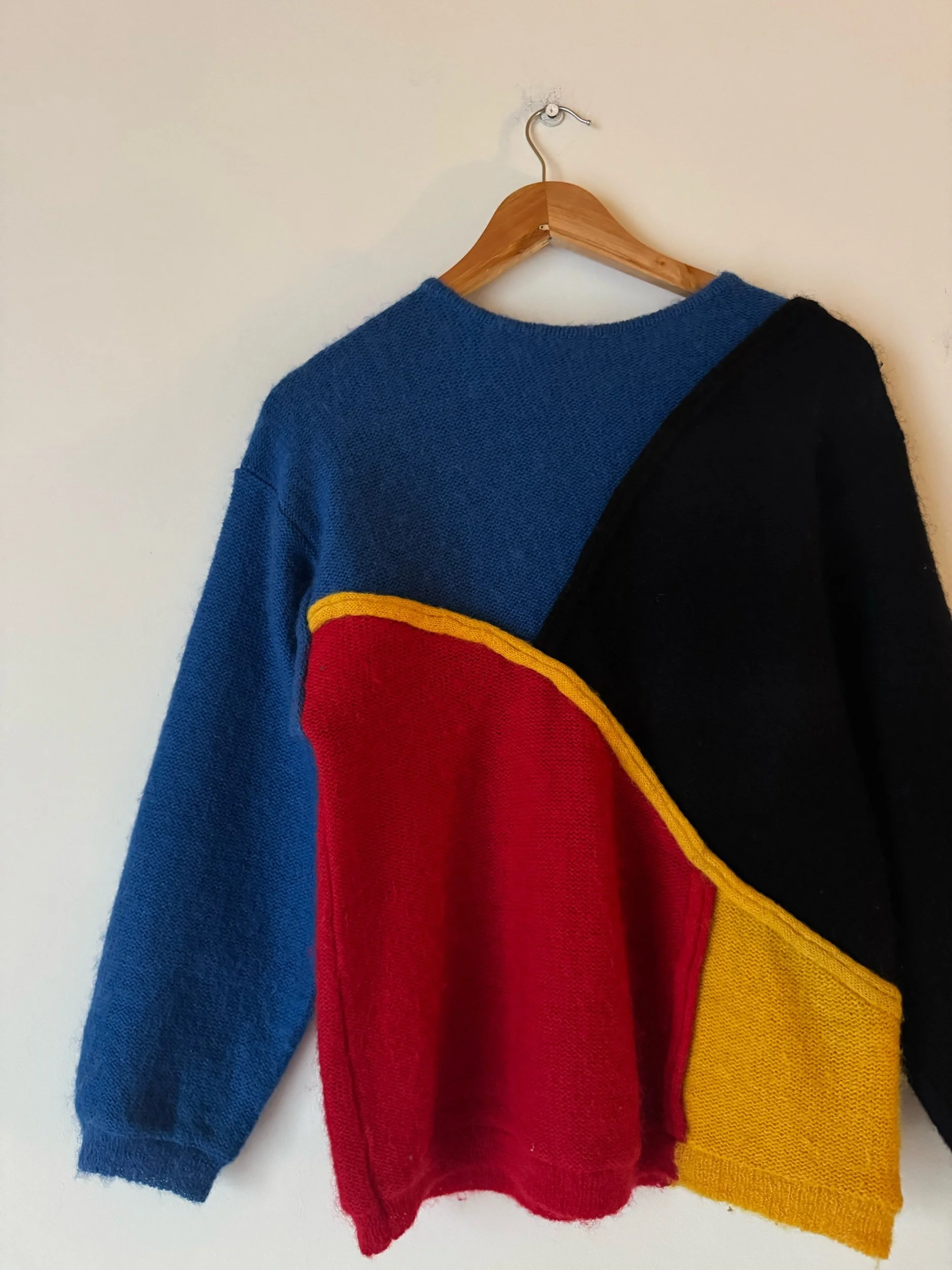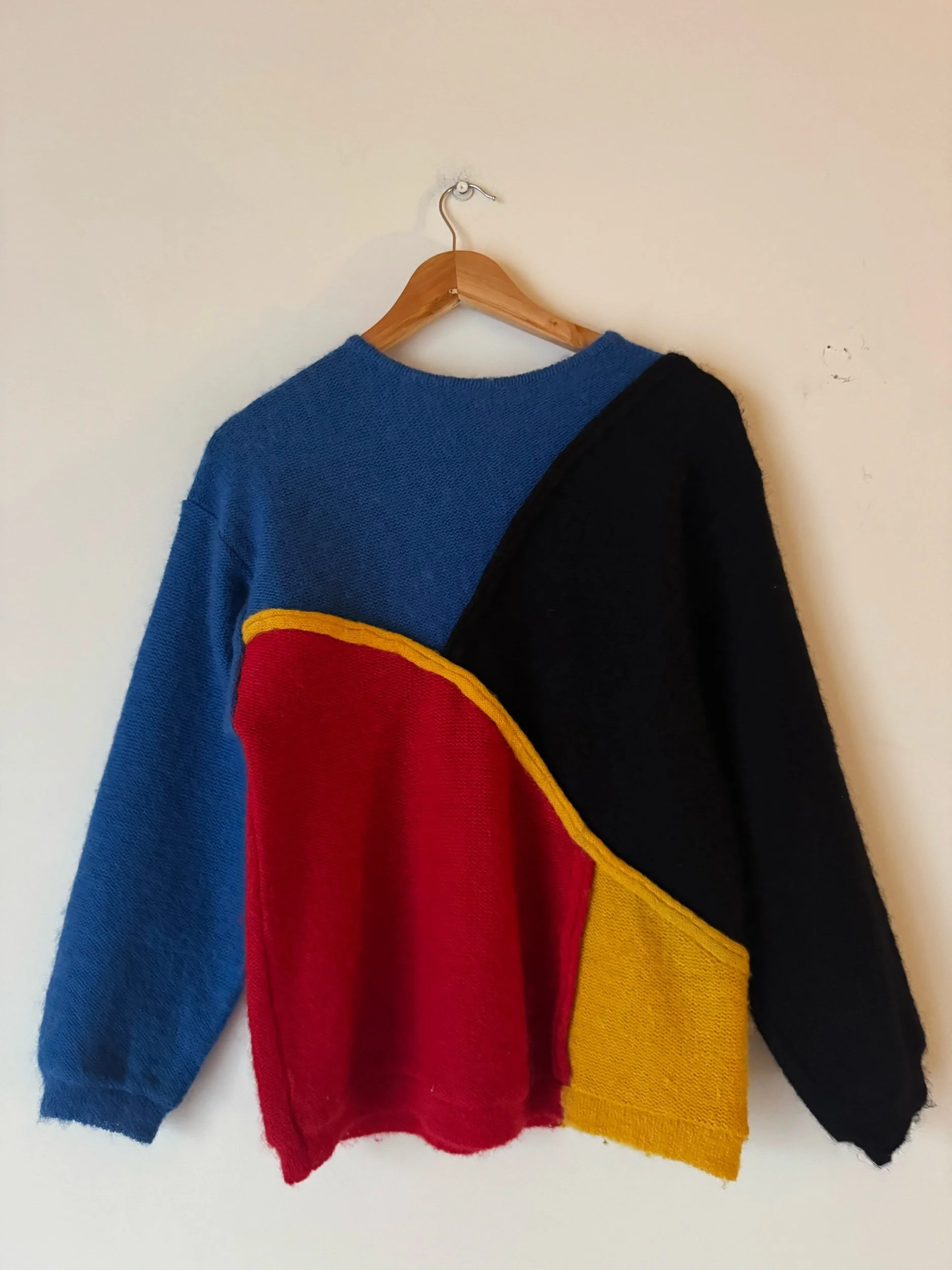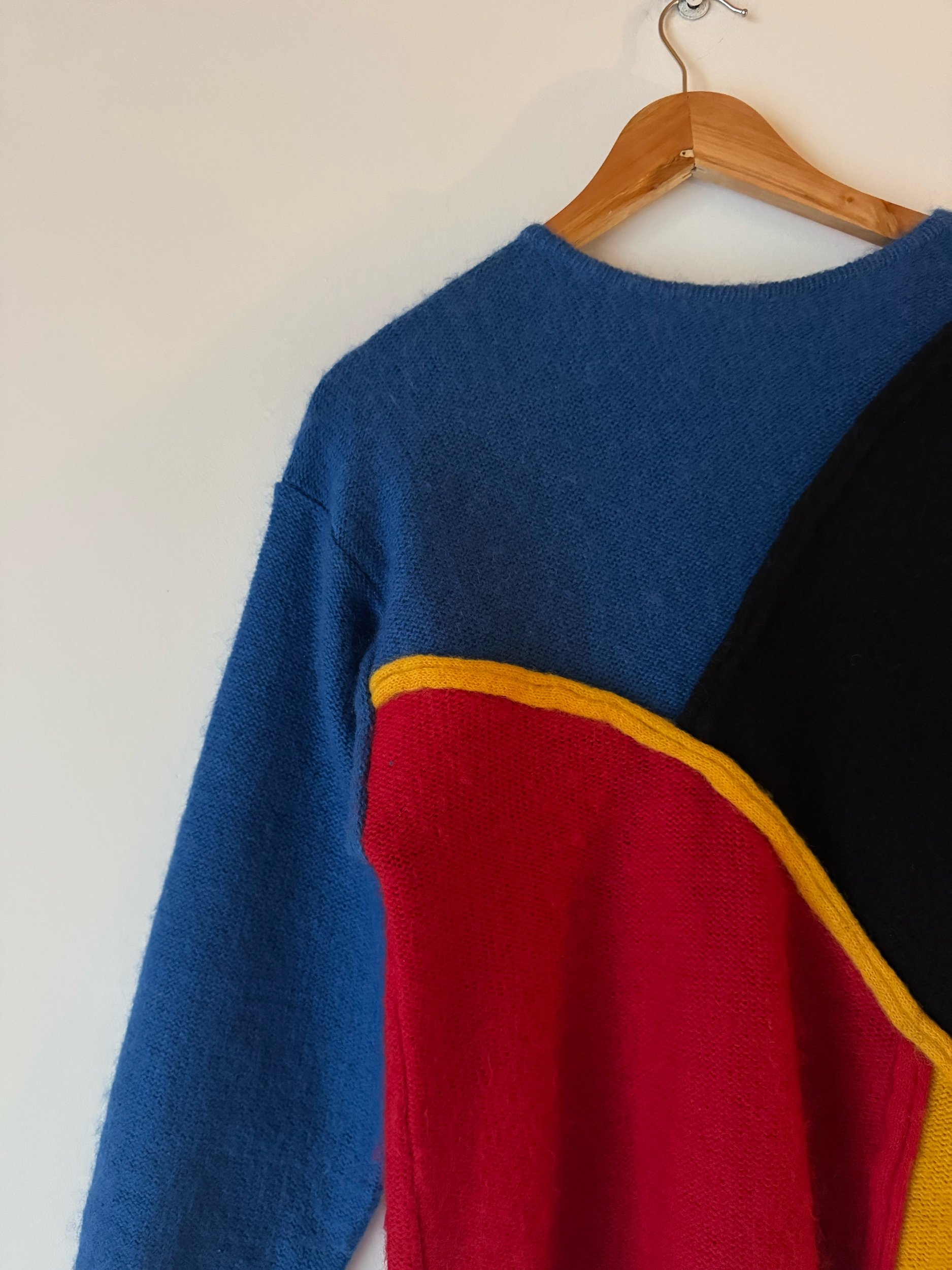 Such a cool jumper! Block primary colours, and pattern on both sides. 80s era. Looks fab with indigo jeans!