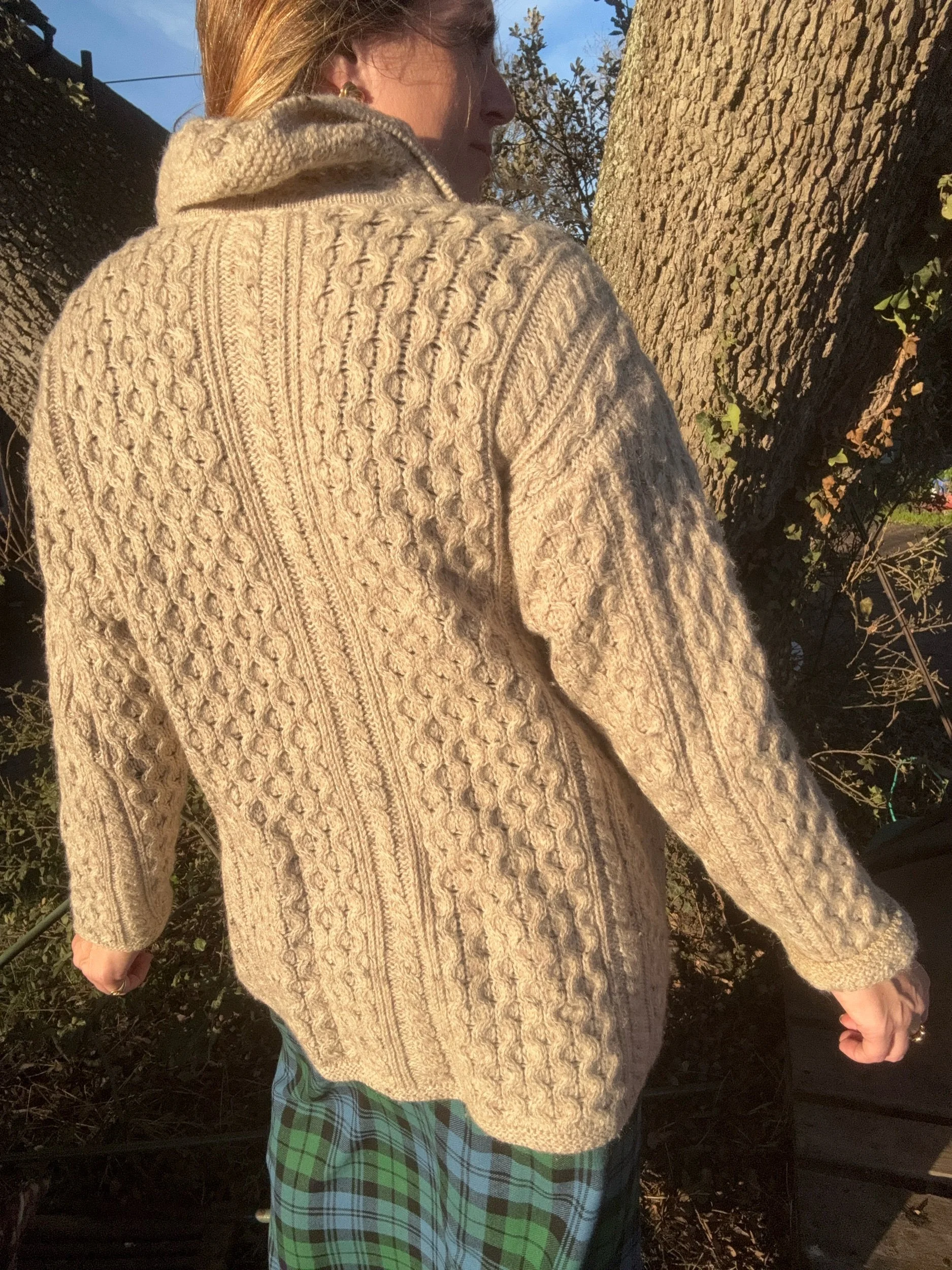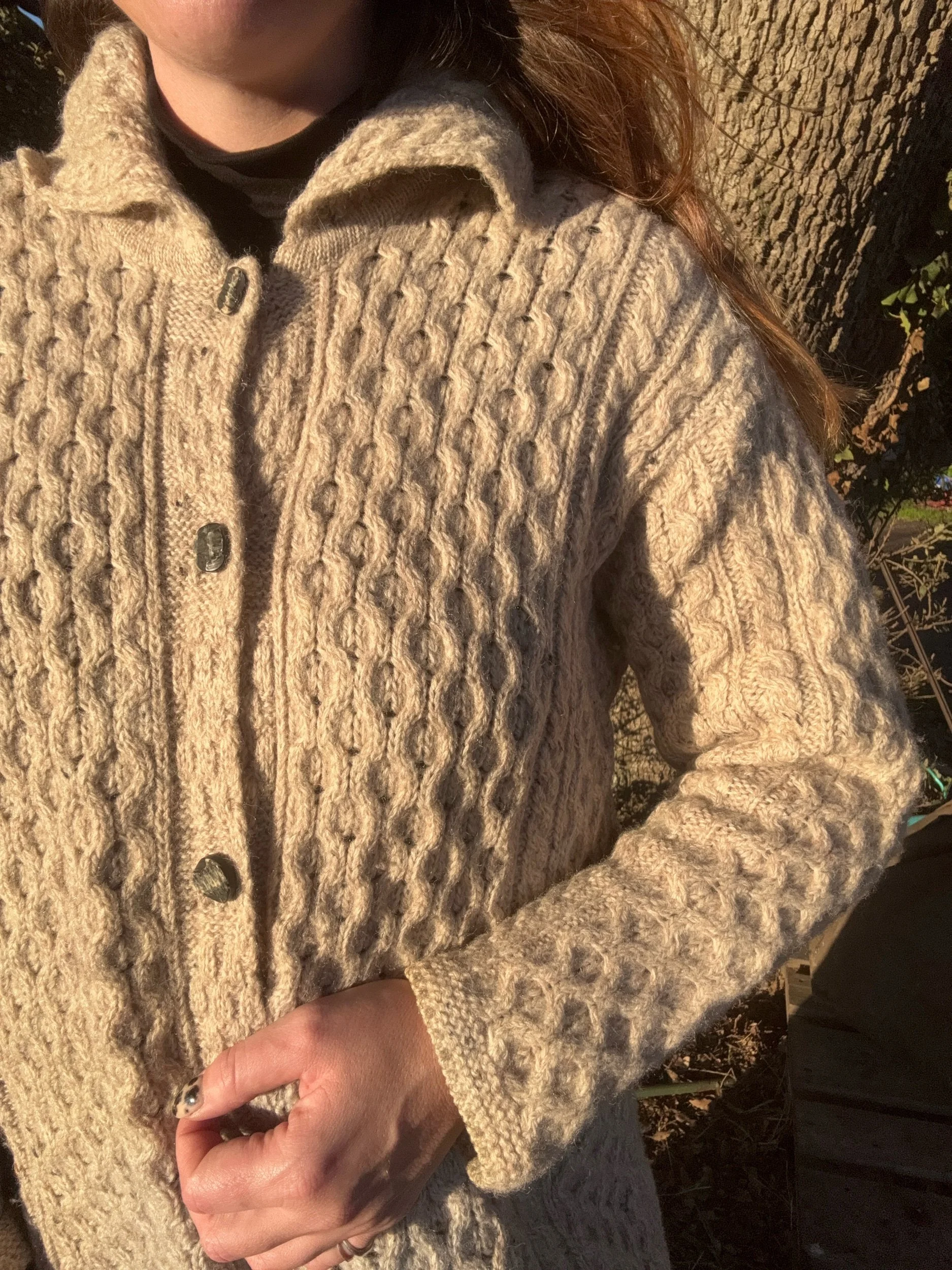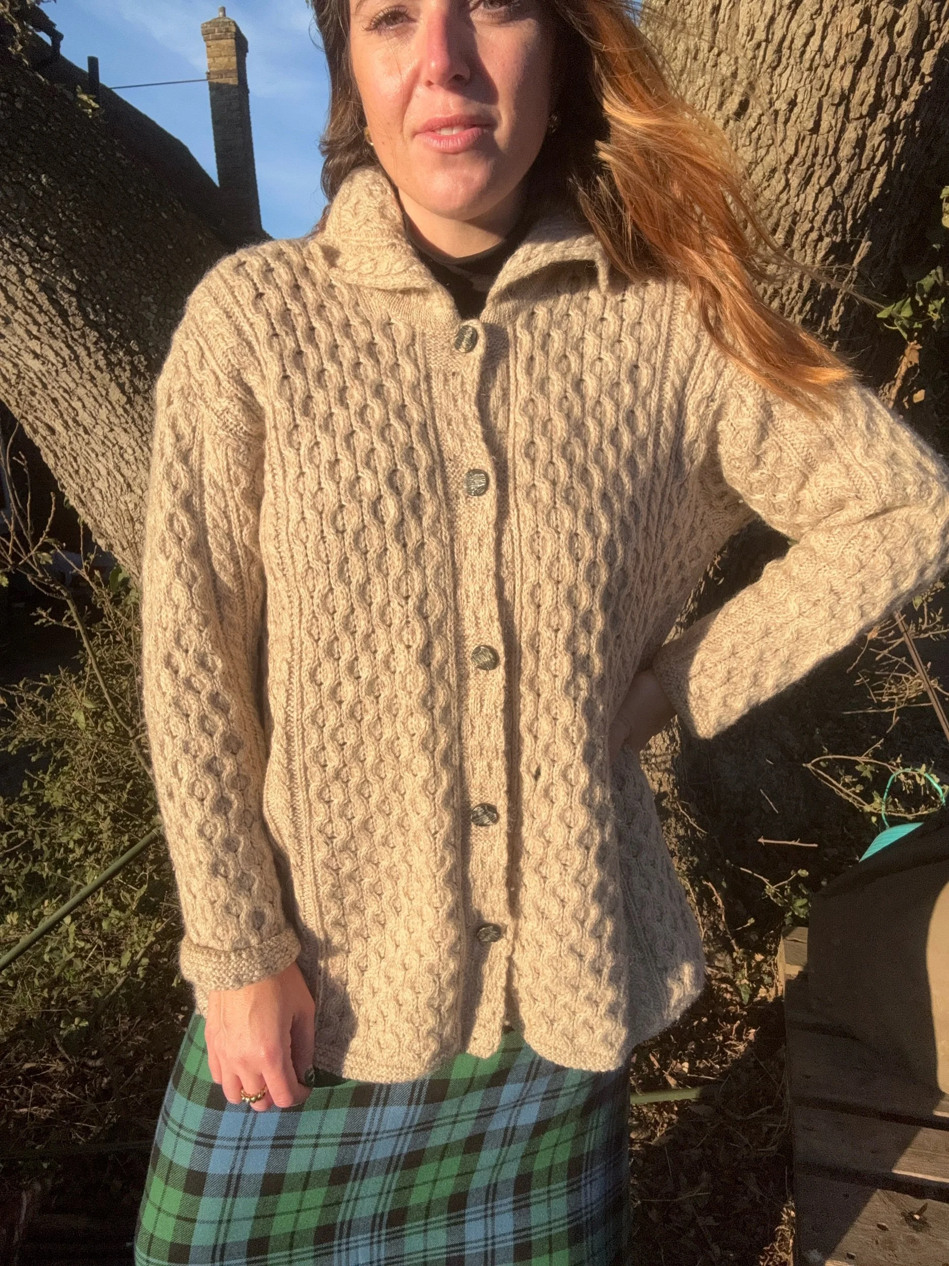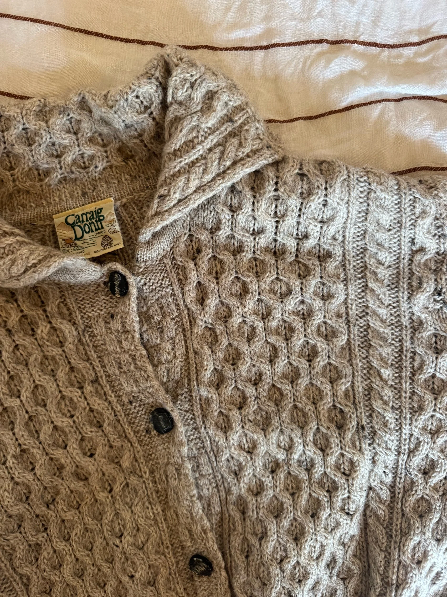 An original Aran cardigan made with beautiful quality wool. Flecks of grey and dark grey with wooden buttons. Collared and ever so slightly longline