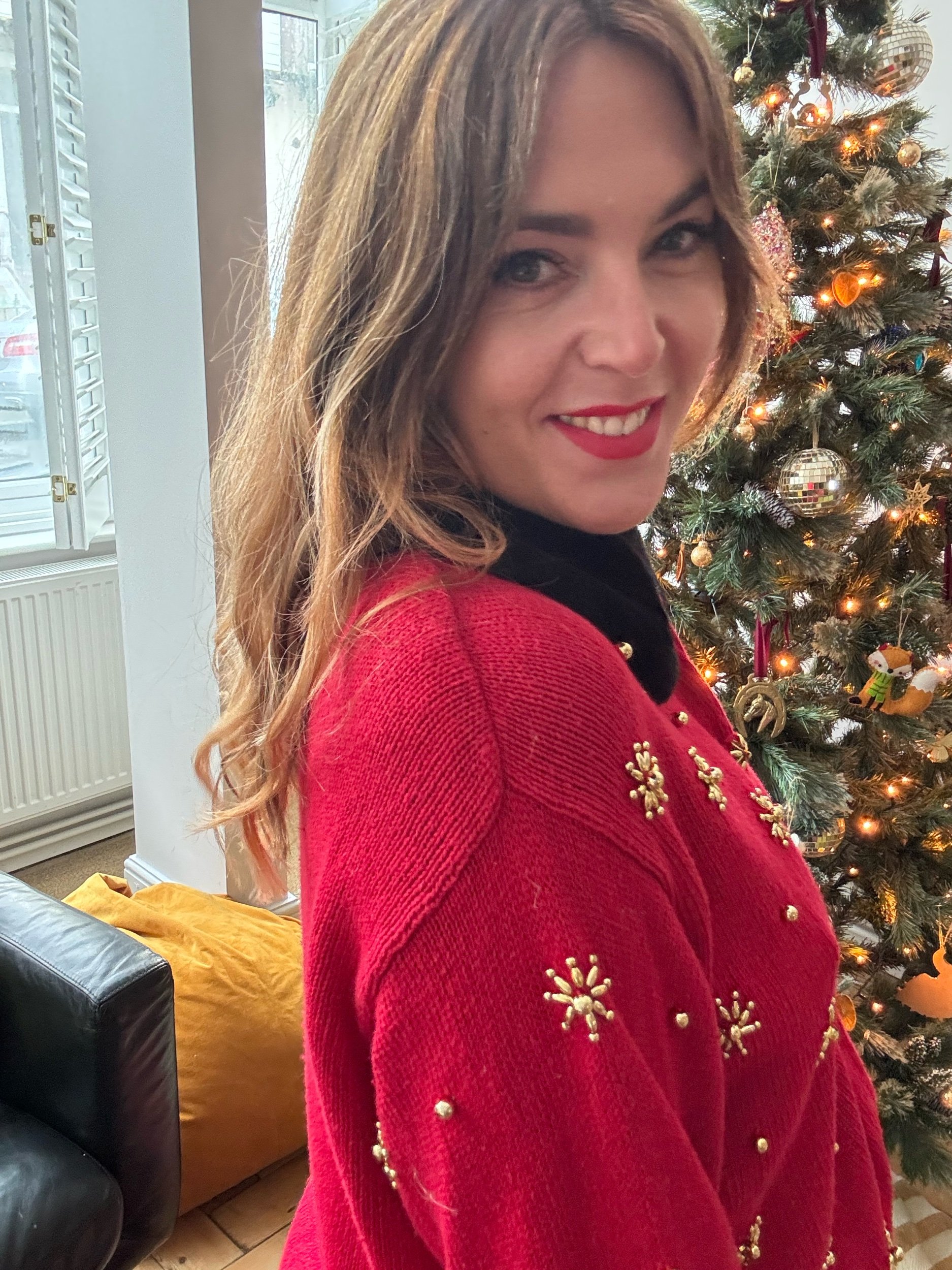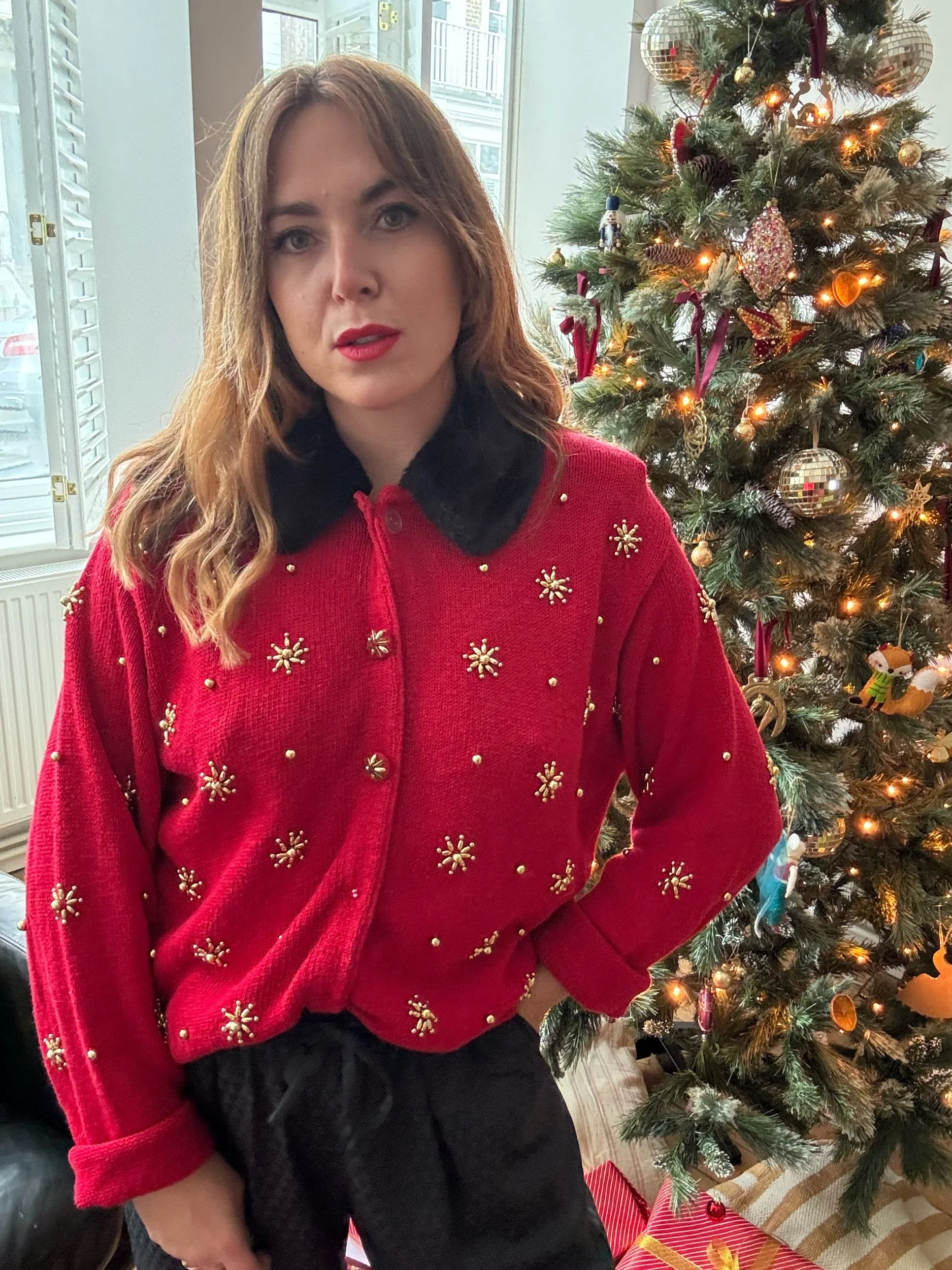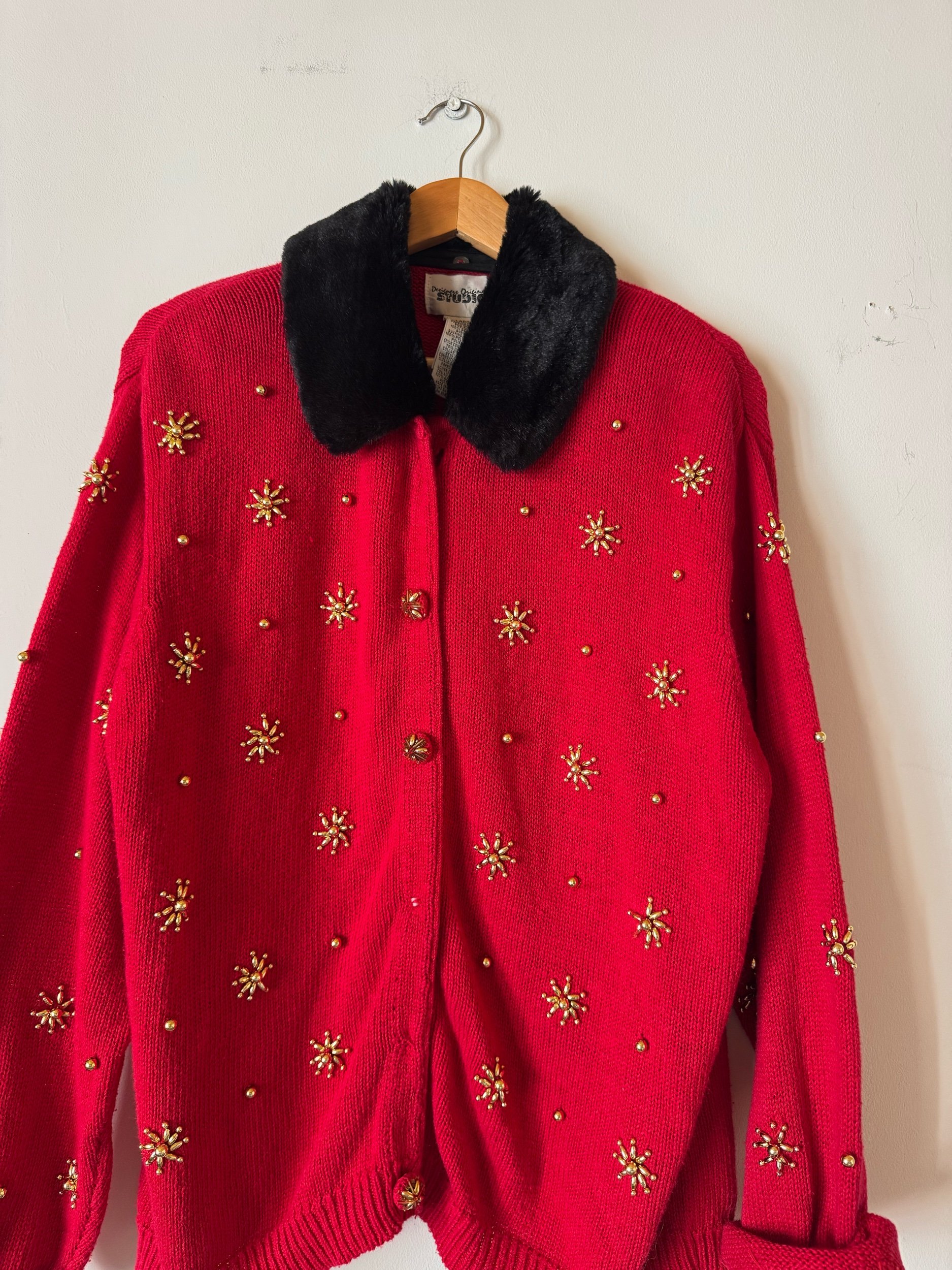Cute 90s embellished cardie with a faux fur collar. Hand sewn gold, festive embellishment in the form of stars and mini wreaths.