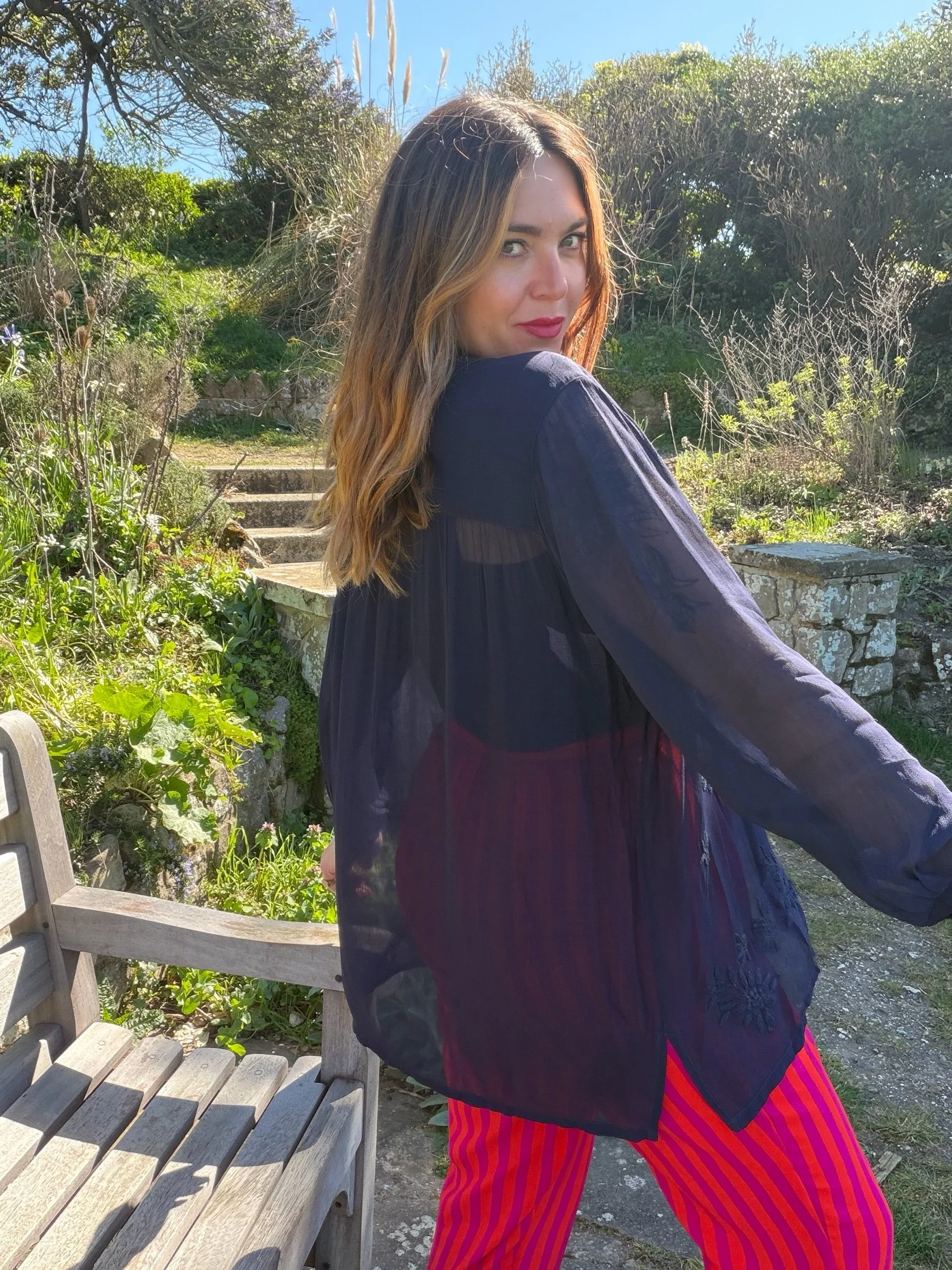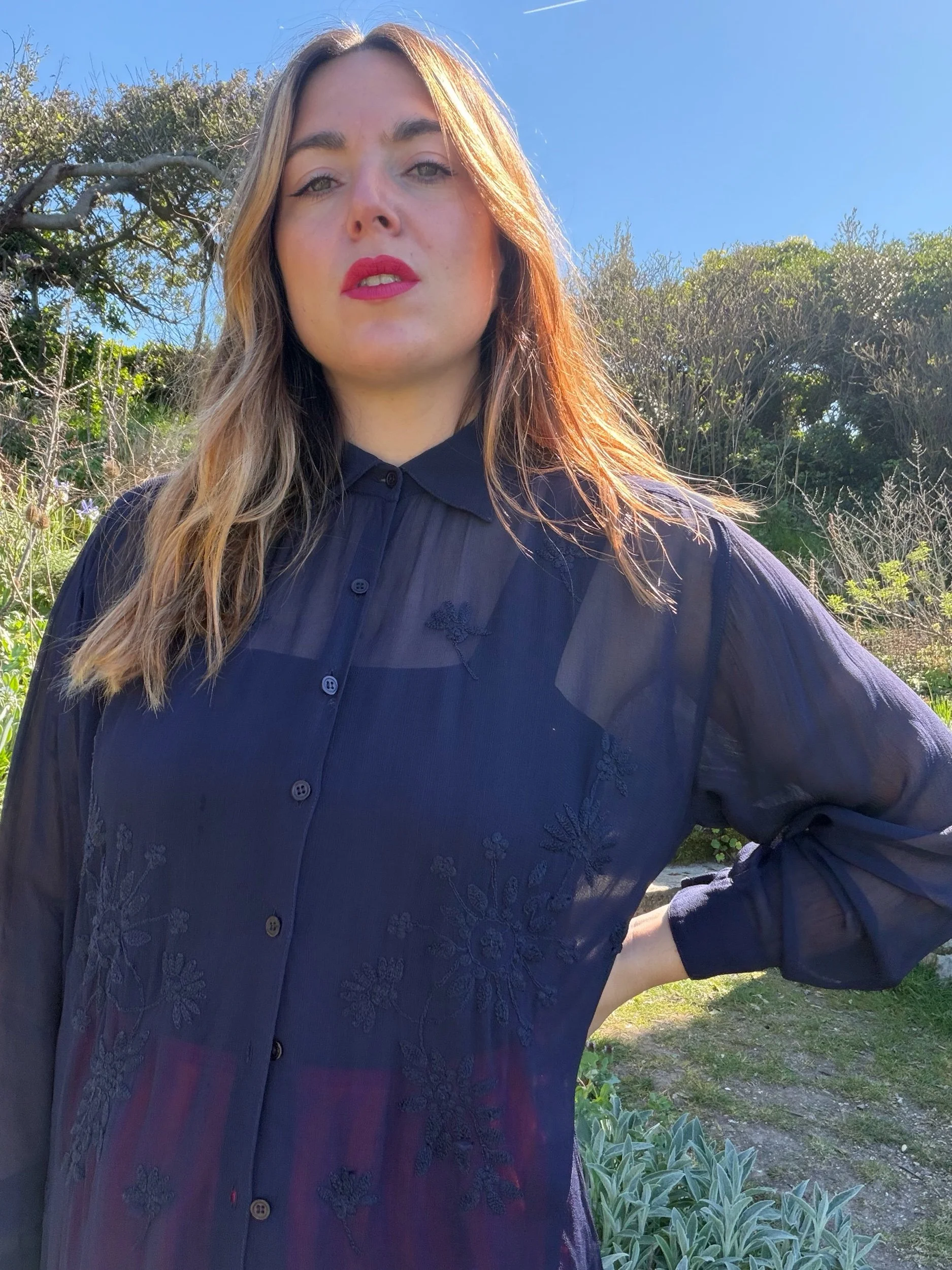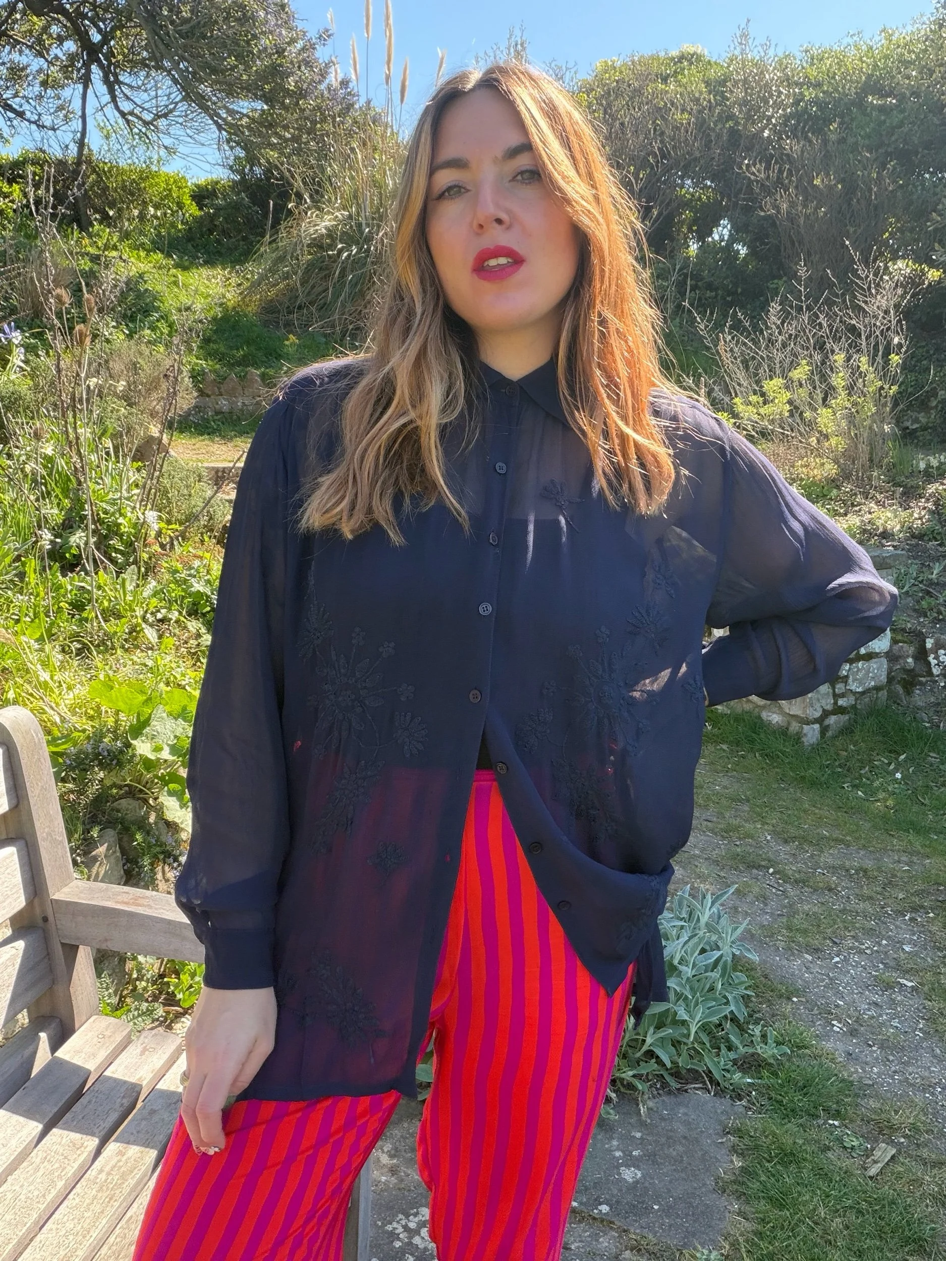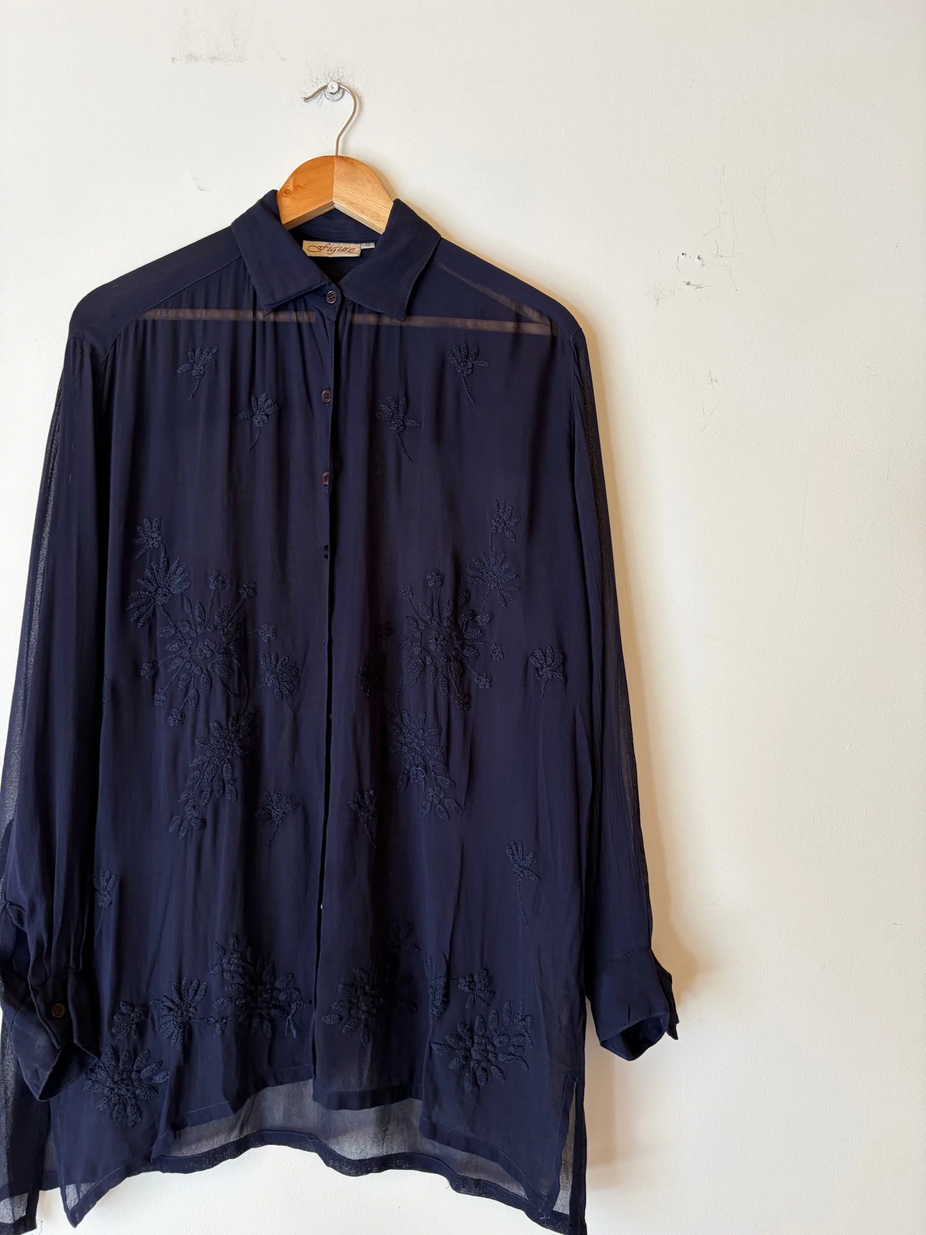 Beautiful sheer blouse with embellished details at the front. Deep navy colourway. Looks cool worn oversized with a slip underneath. 90s era. Really lovely quality
