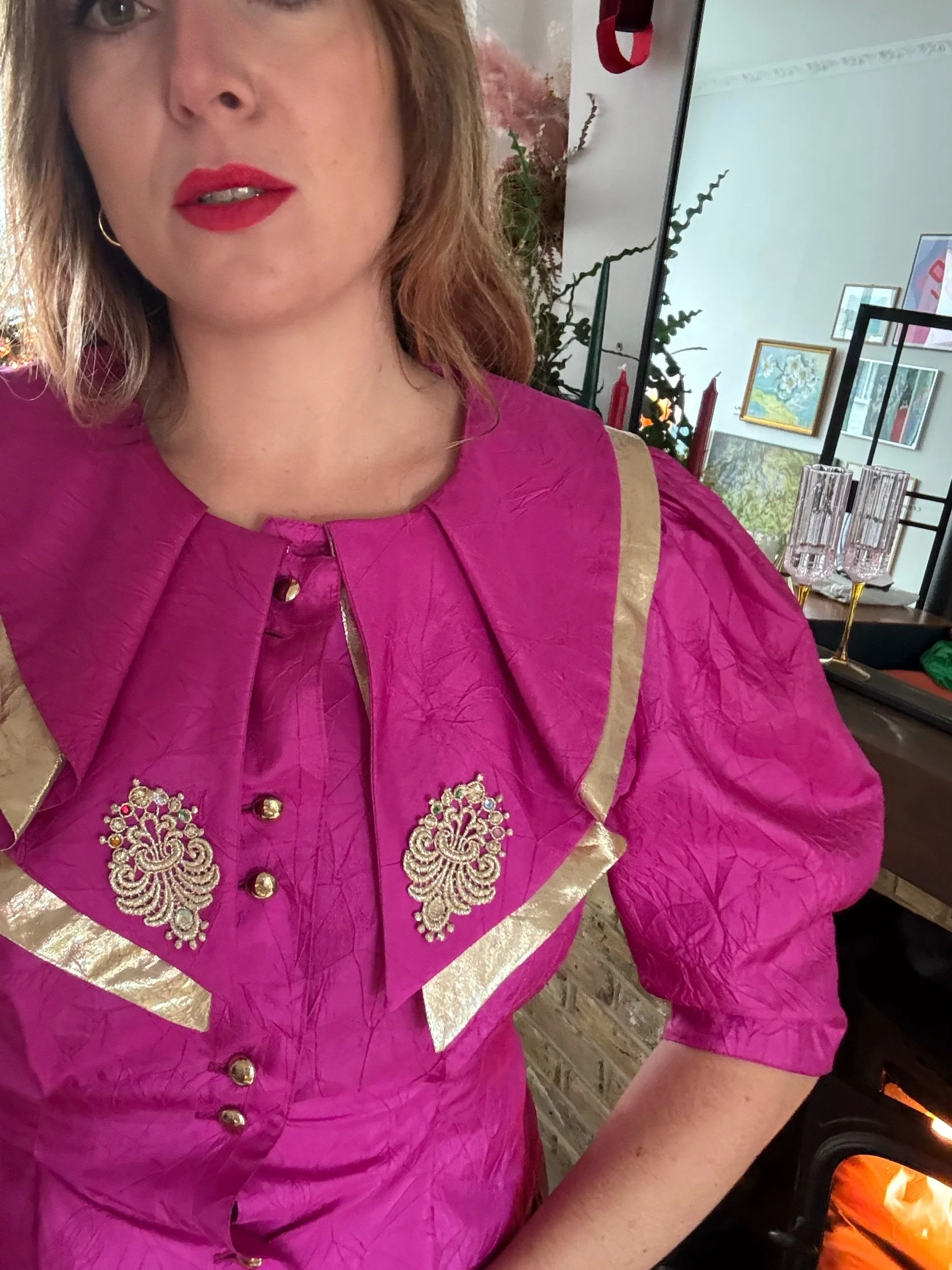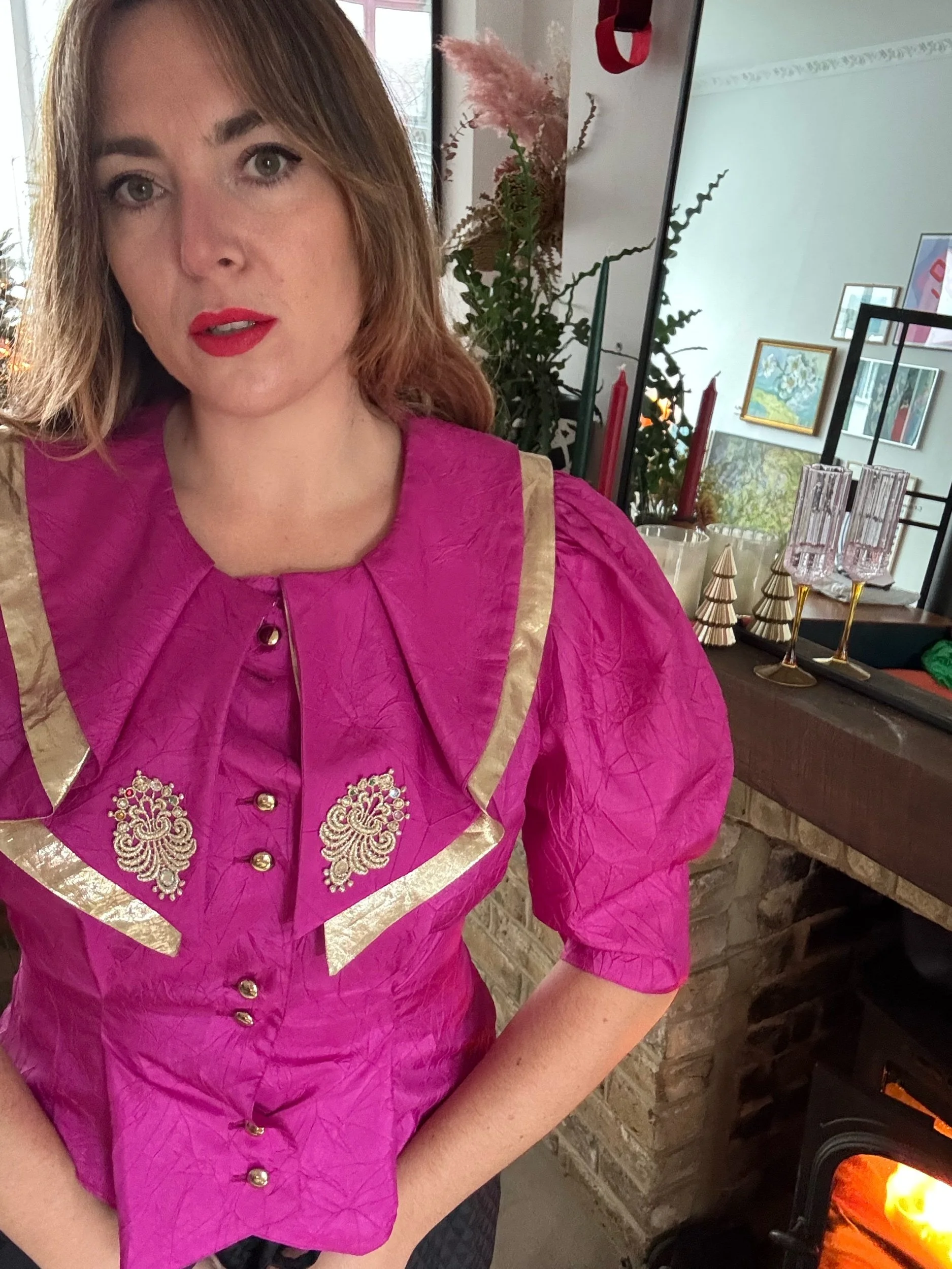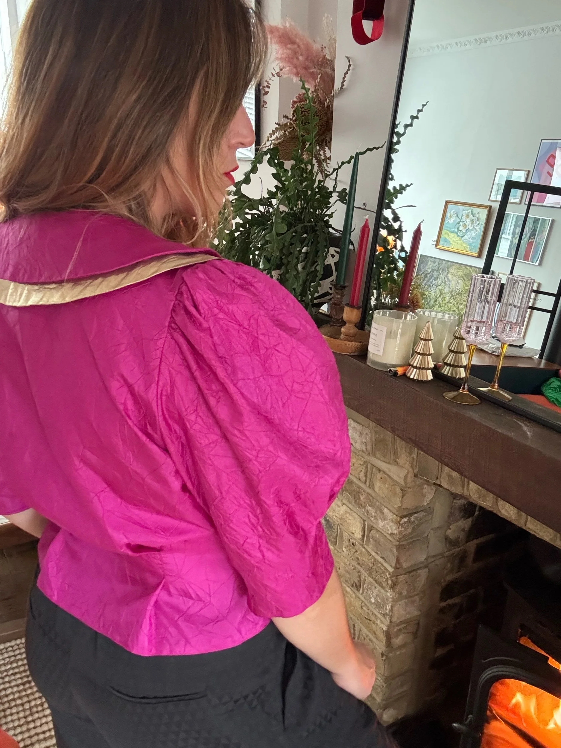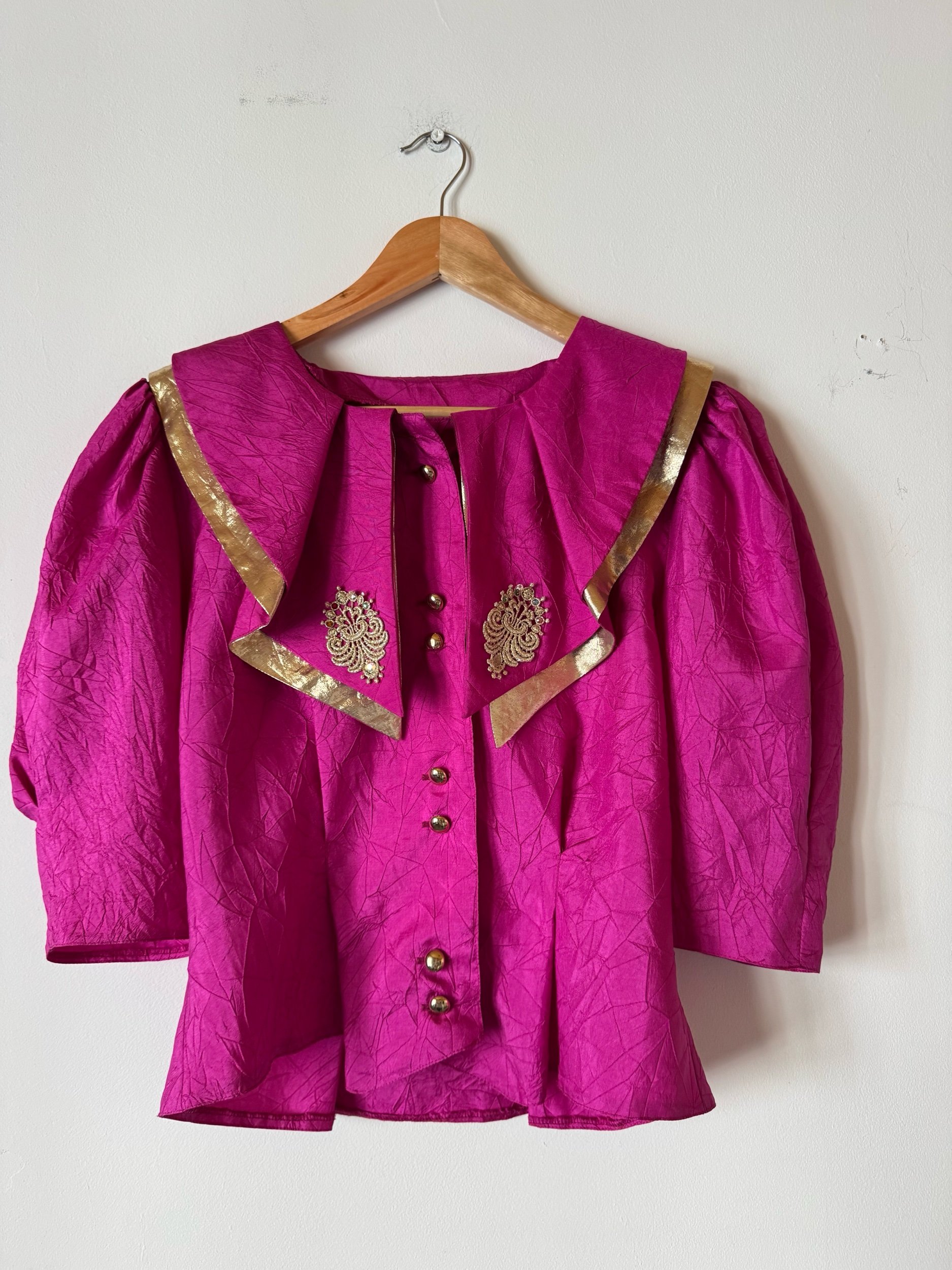 Absolutely adore this blouse, it’s giving such regal vibes. The cerise pink and gold is such a vibe together. I love the detailing and puff sleeves. A very luxurious feeling piece