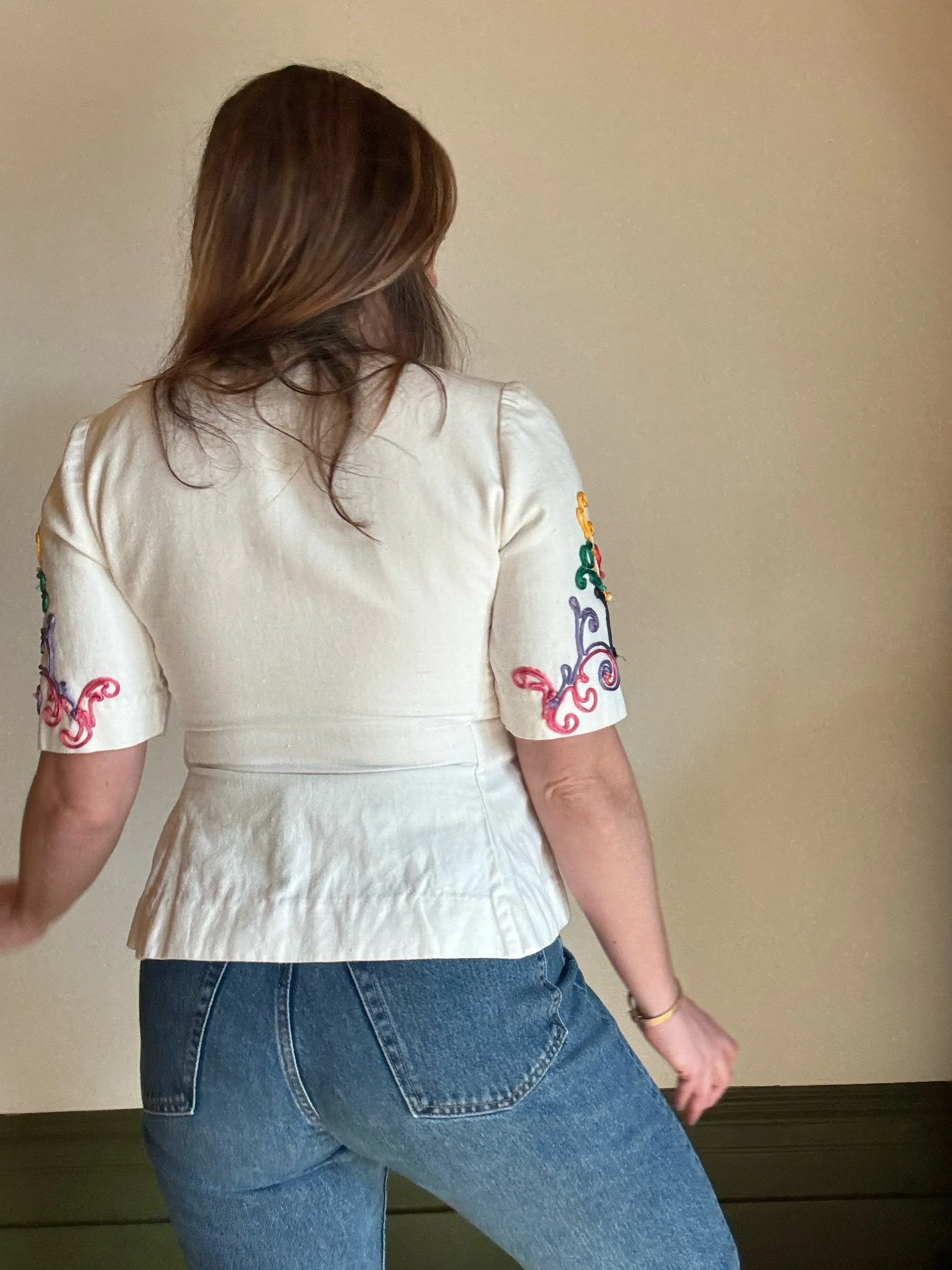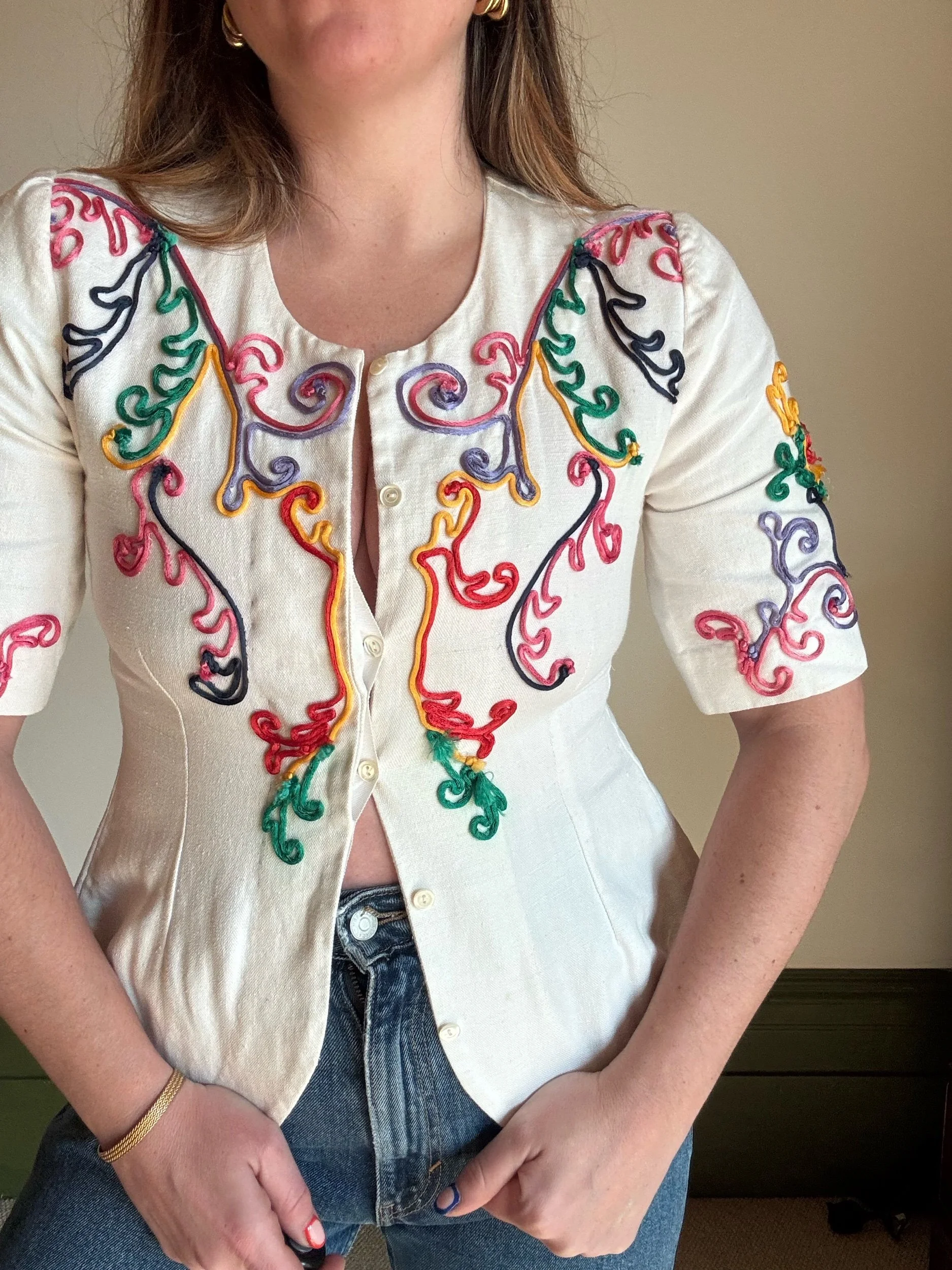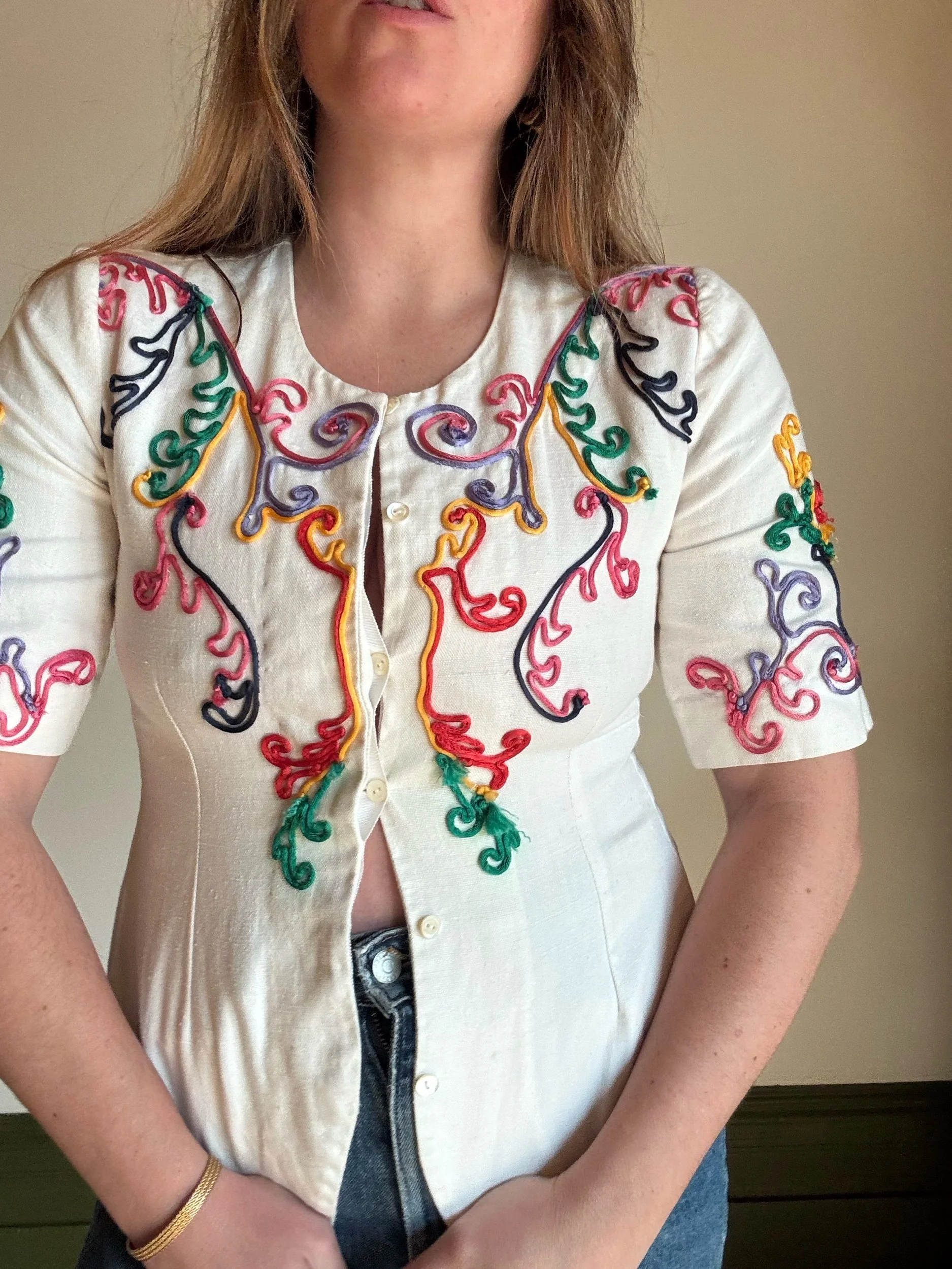 Sensational 80s blouse/ jacket. Gorgeous structure and weight to the fabric . Adore the colourful appliqué work that looks like 3D embroidery