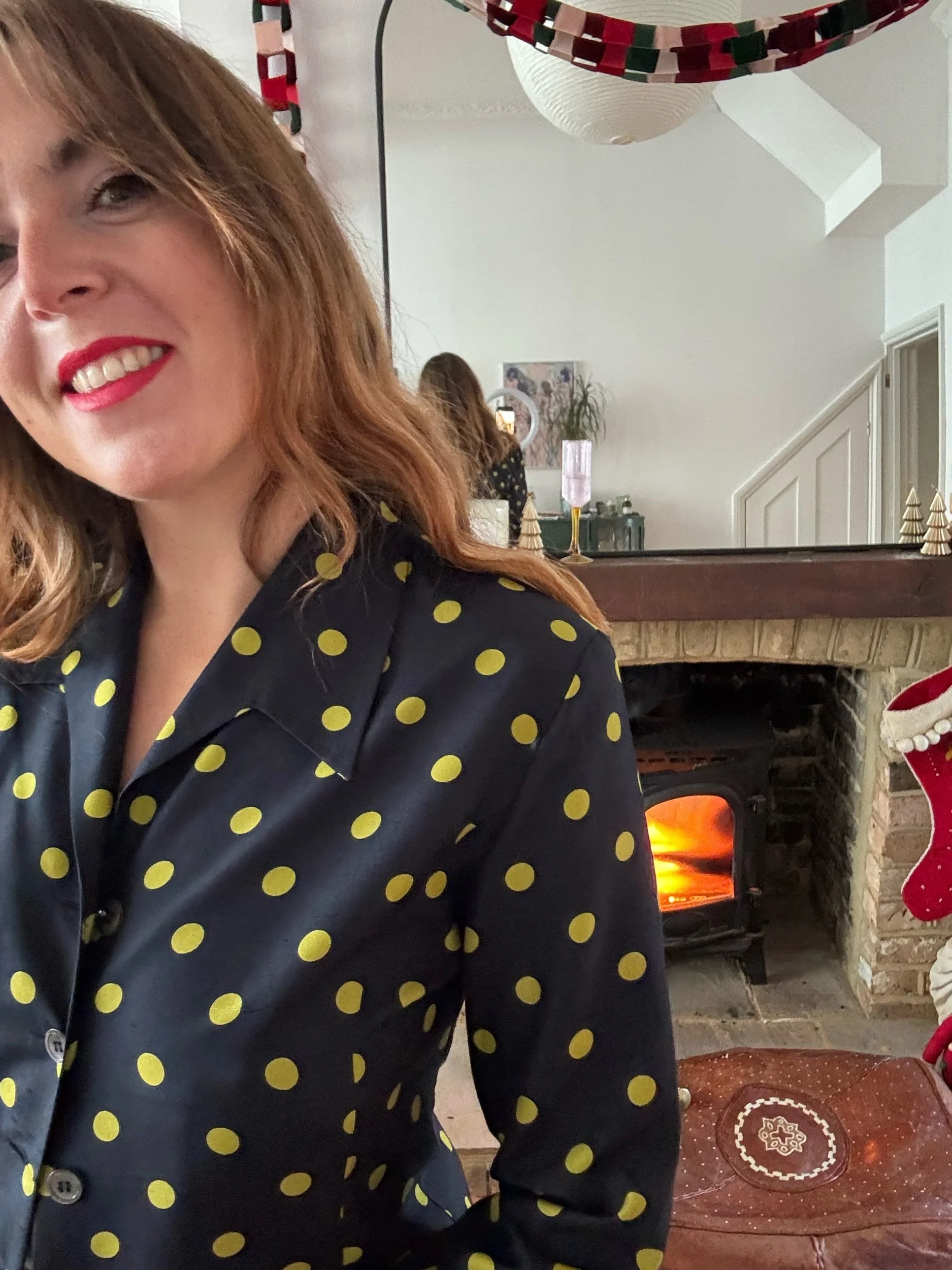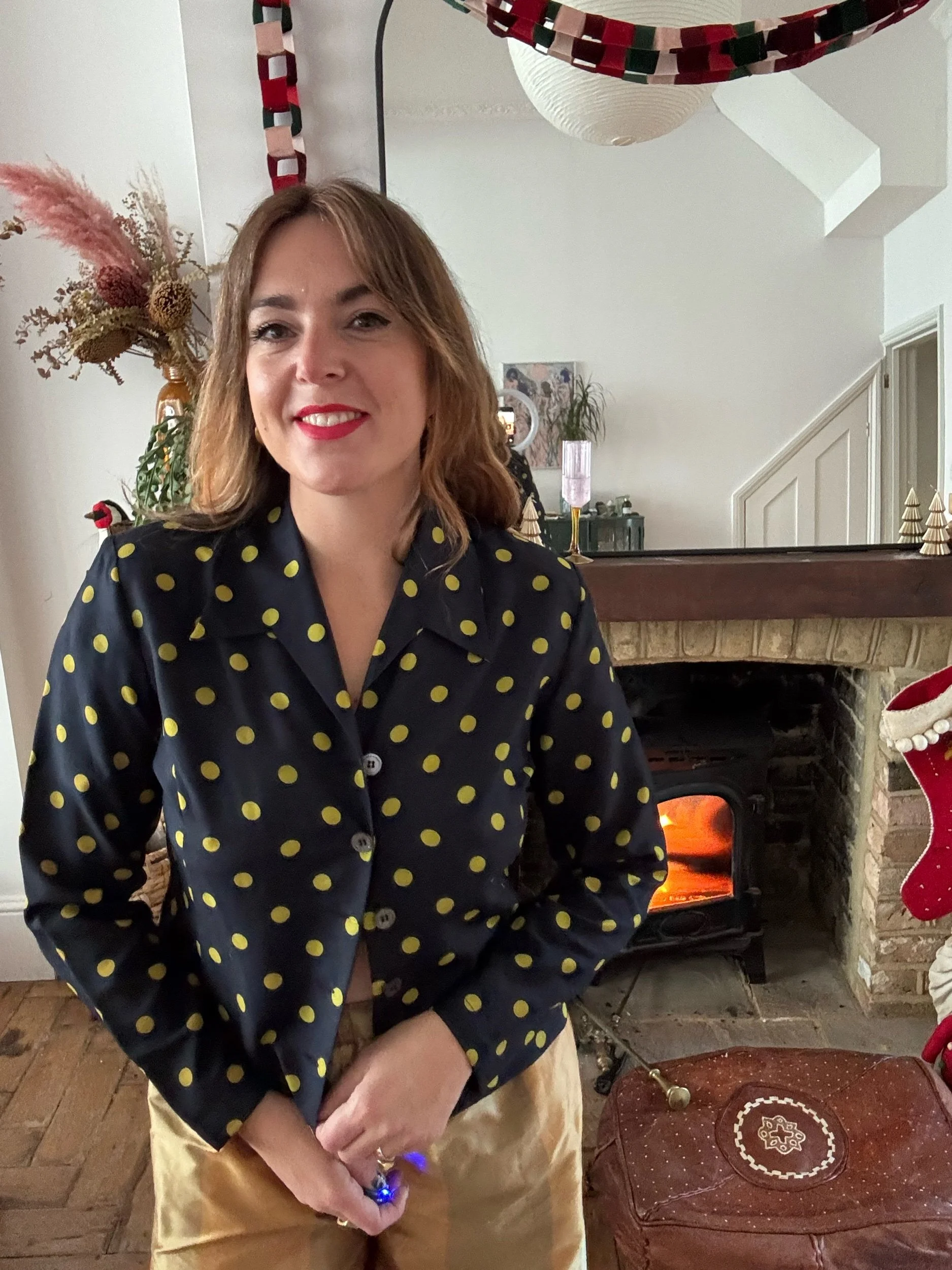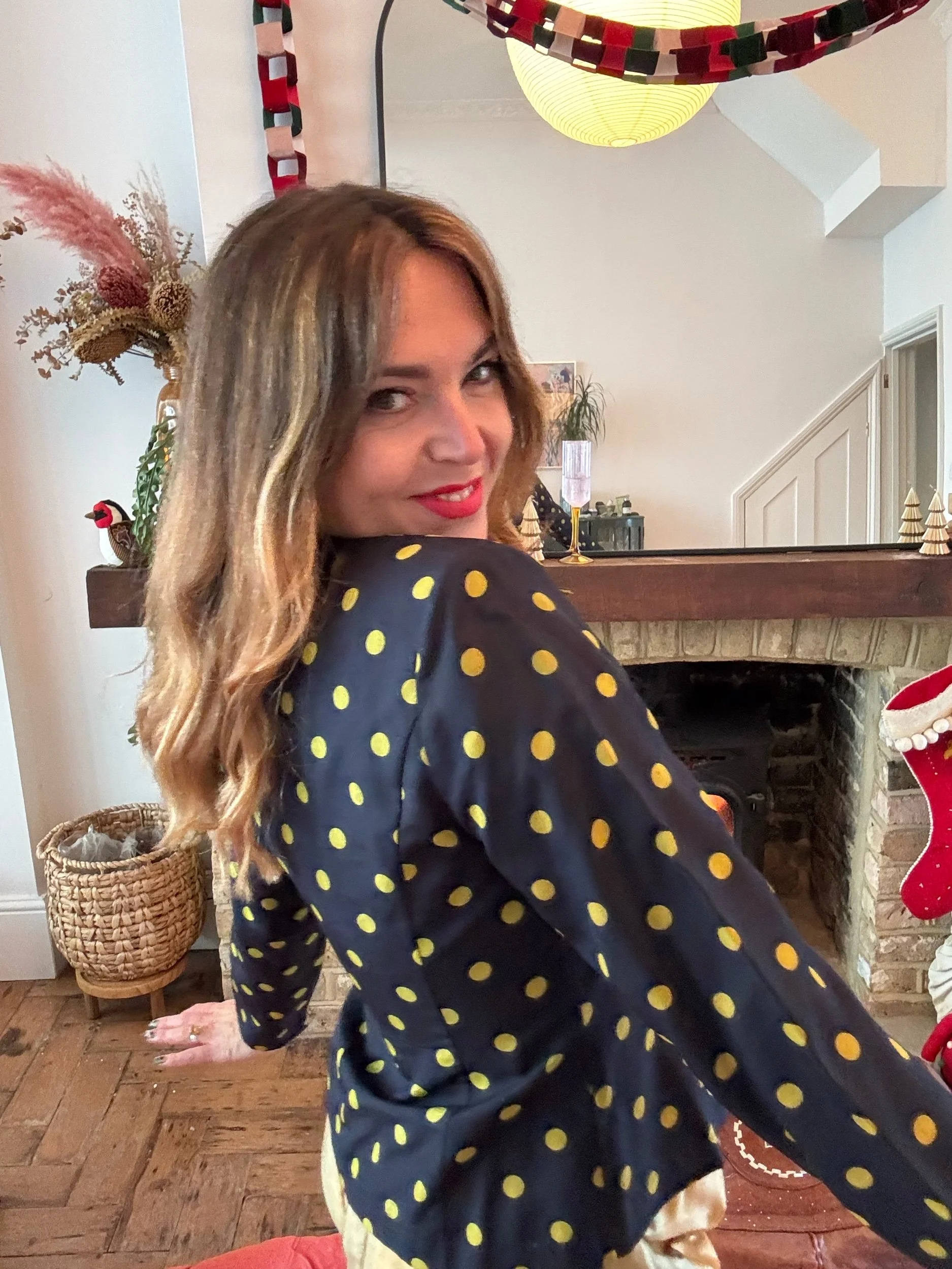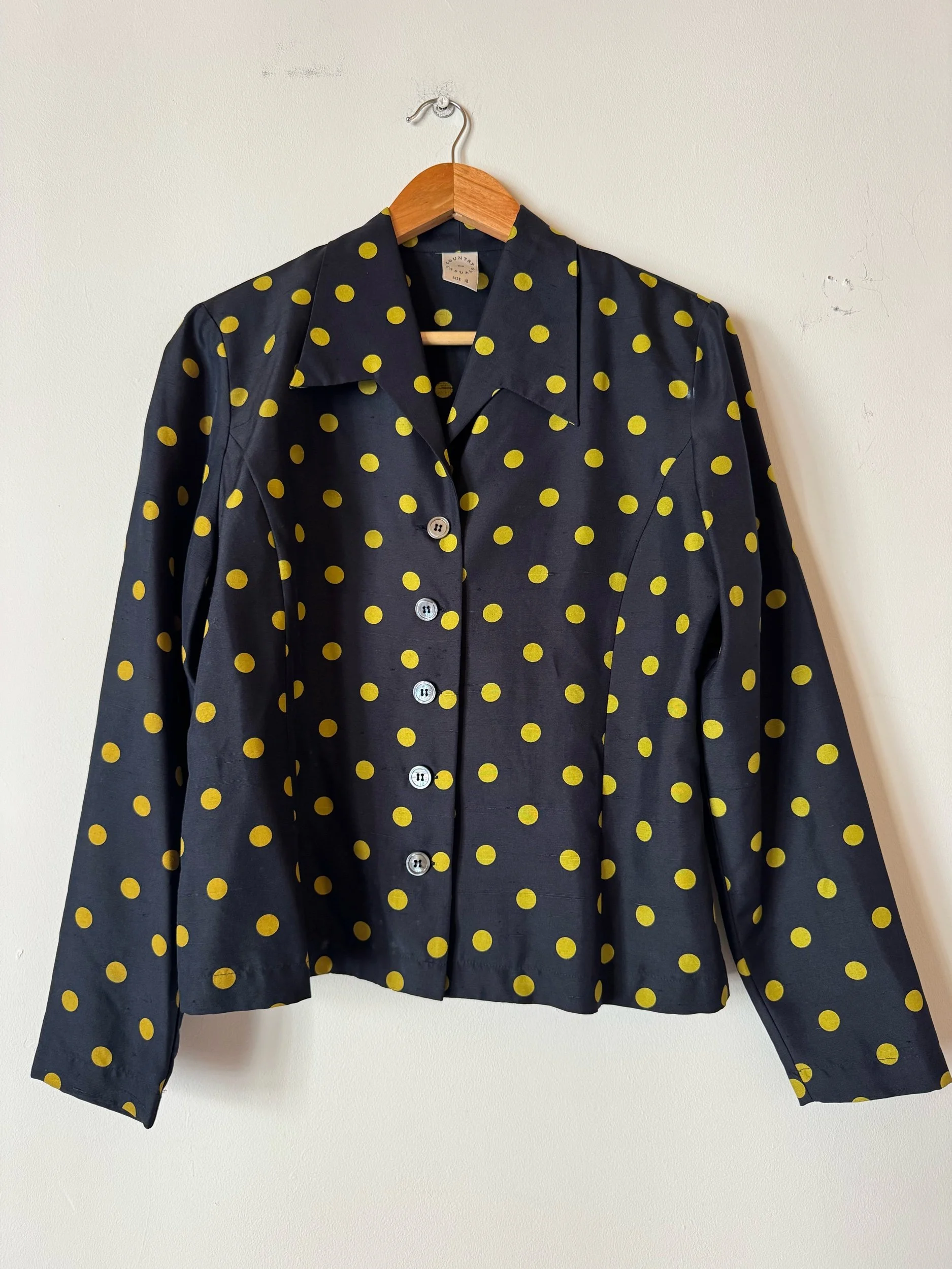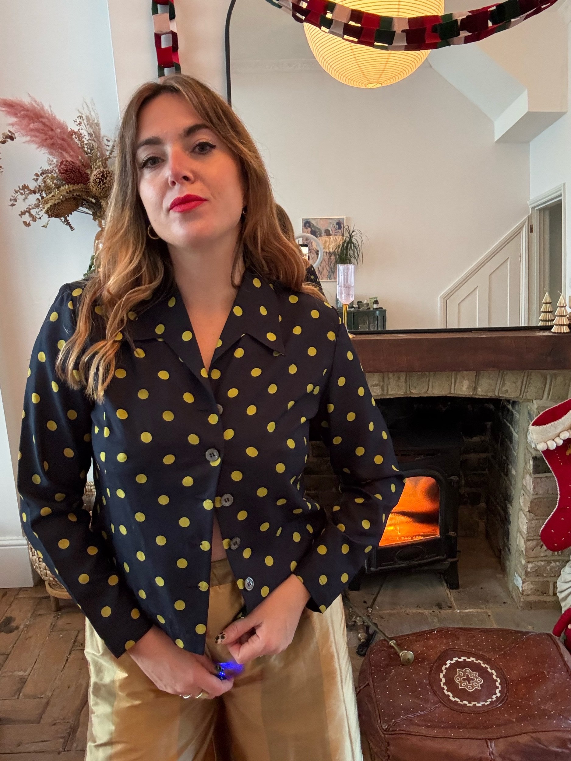 90s blouse in navy blue with gold polkadots. Pure sulk material, vey luxurious feeling. Really lovely structure.