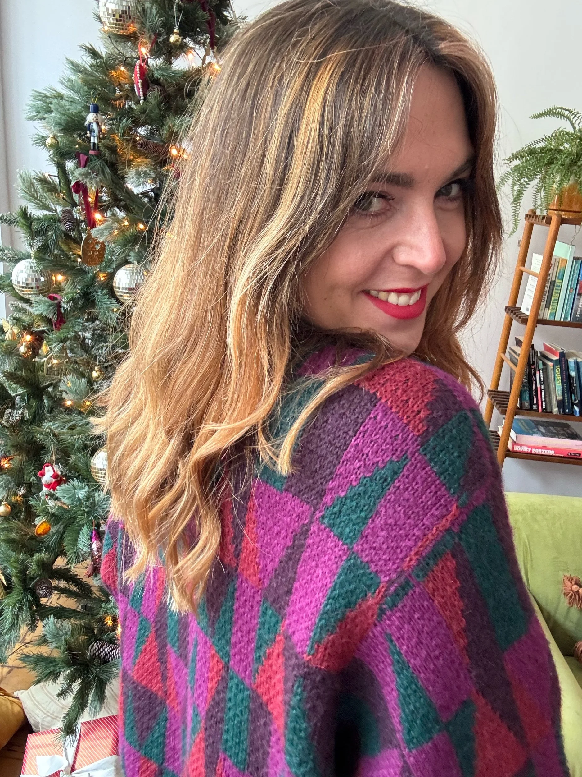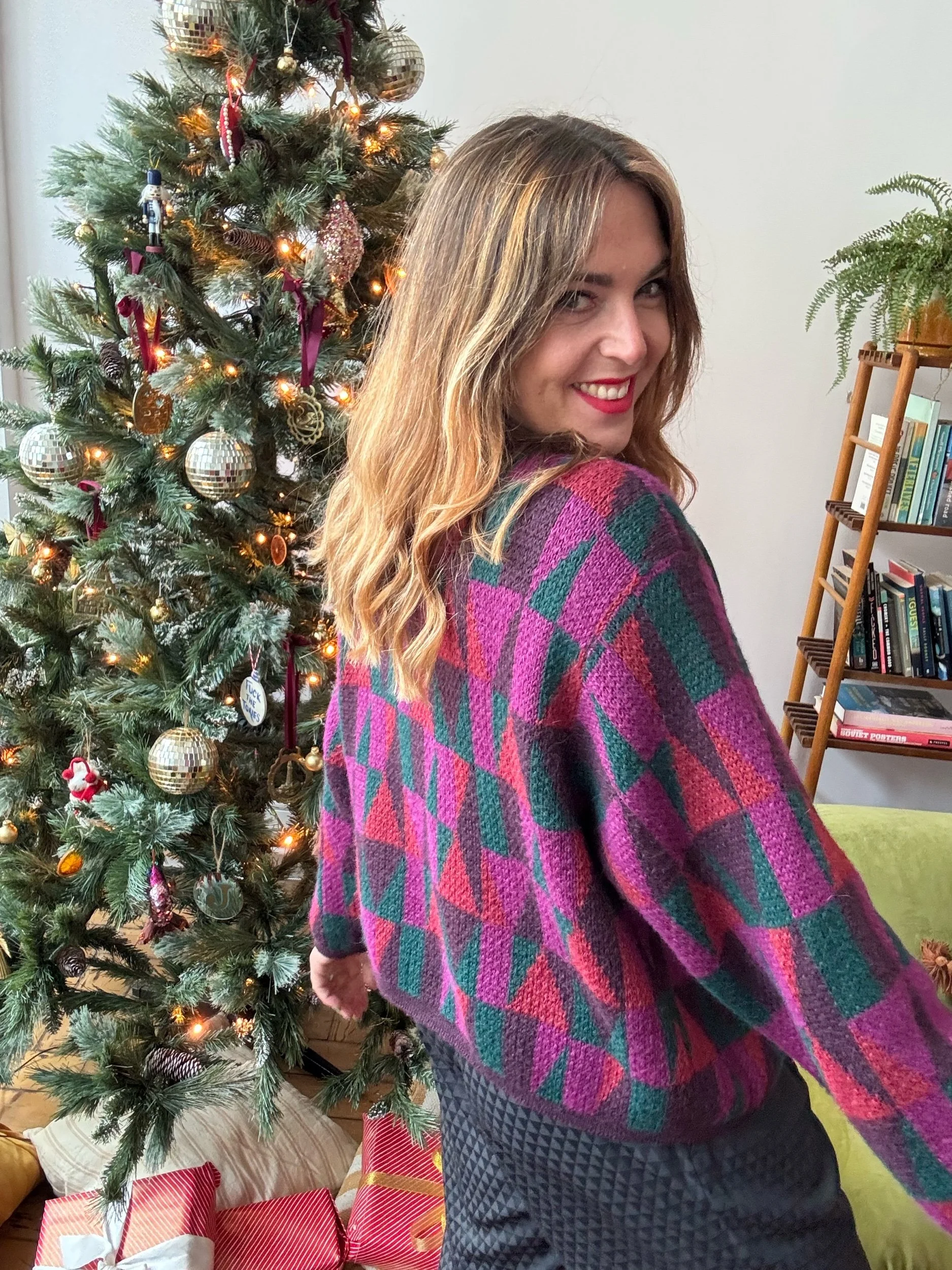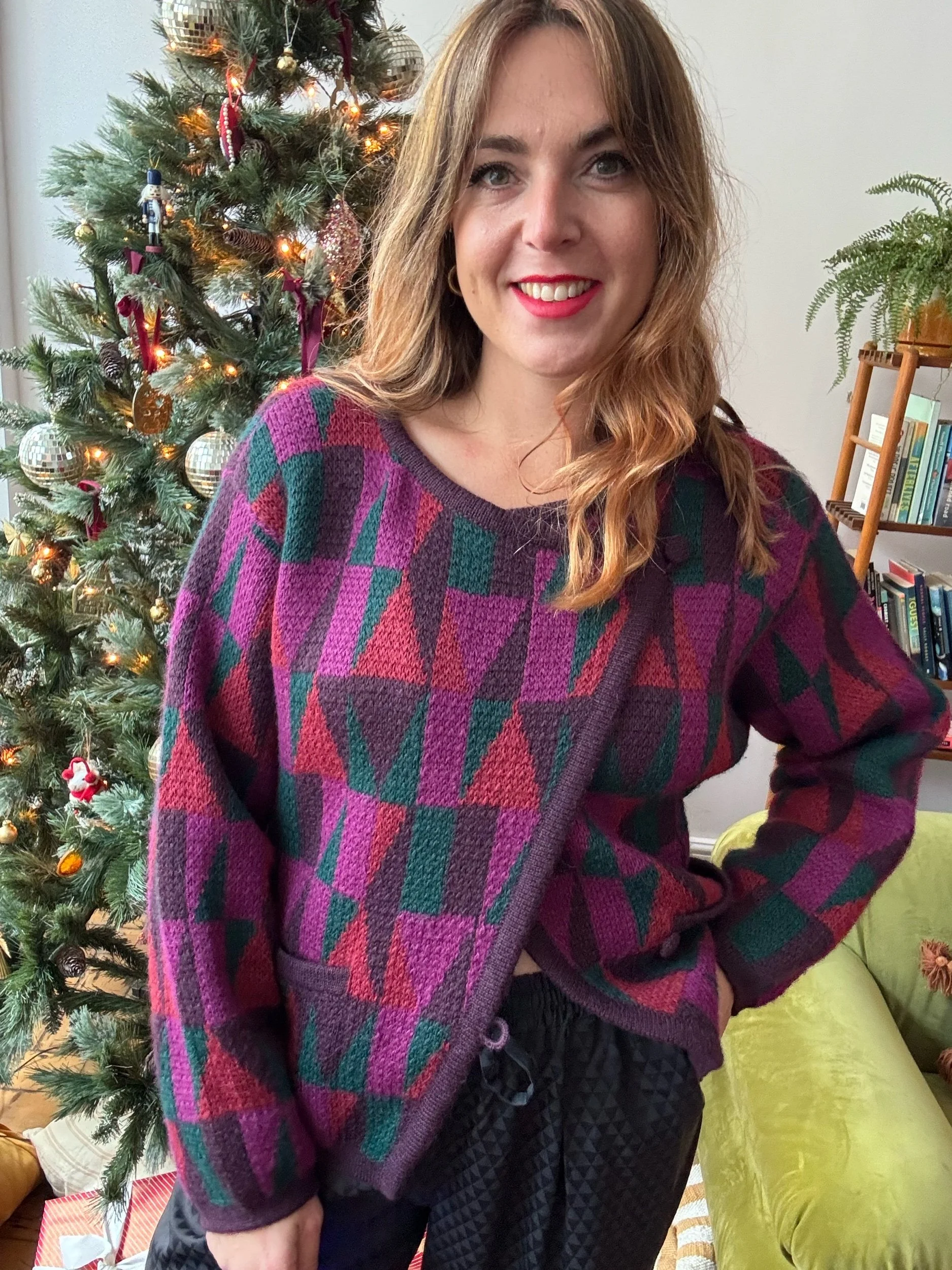 Love the colours and geometric patterns. Festive but also has longevity after Christmas! Has a lovely wrap shape at the front, super flattering and contemporary