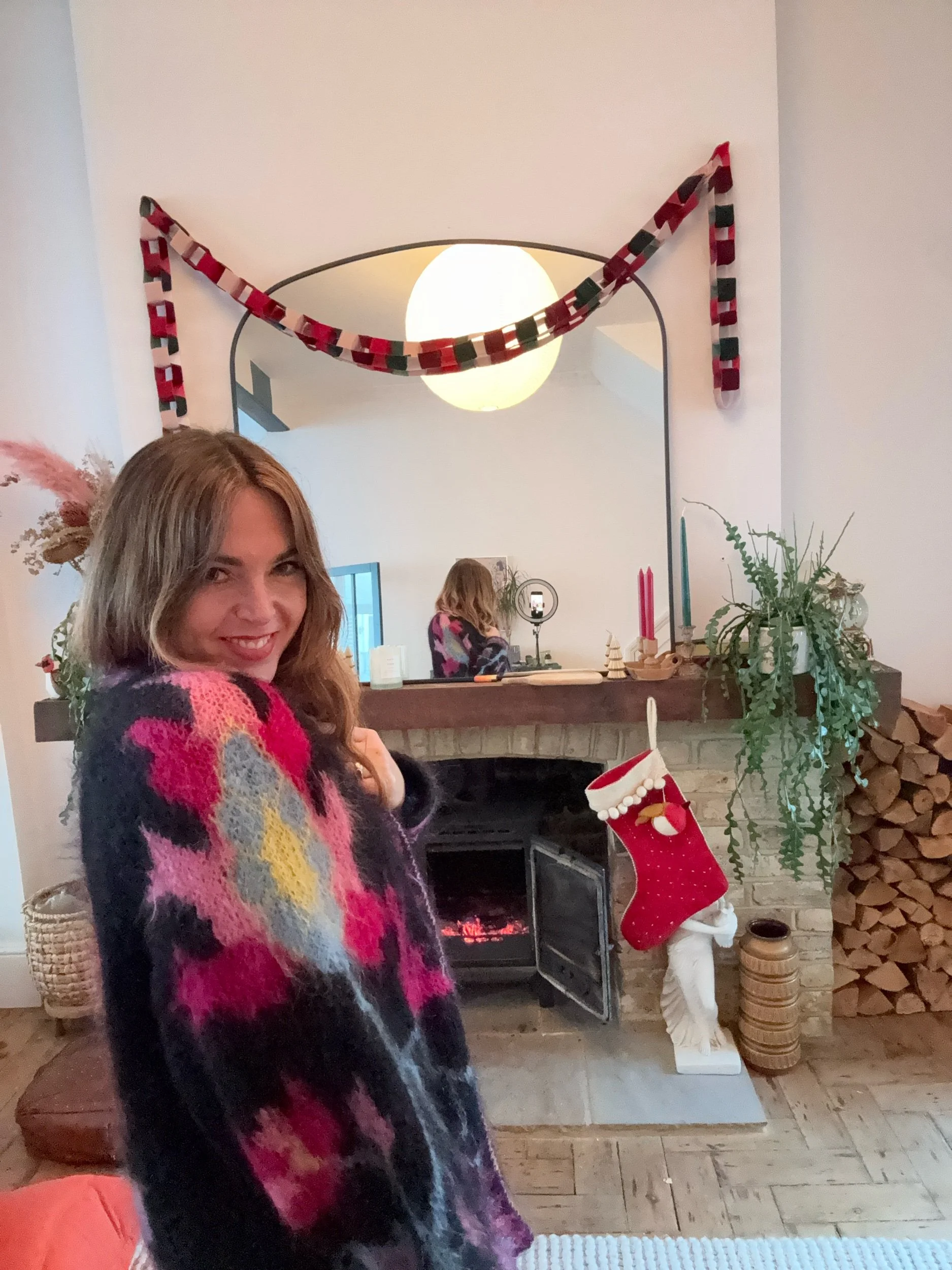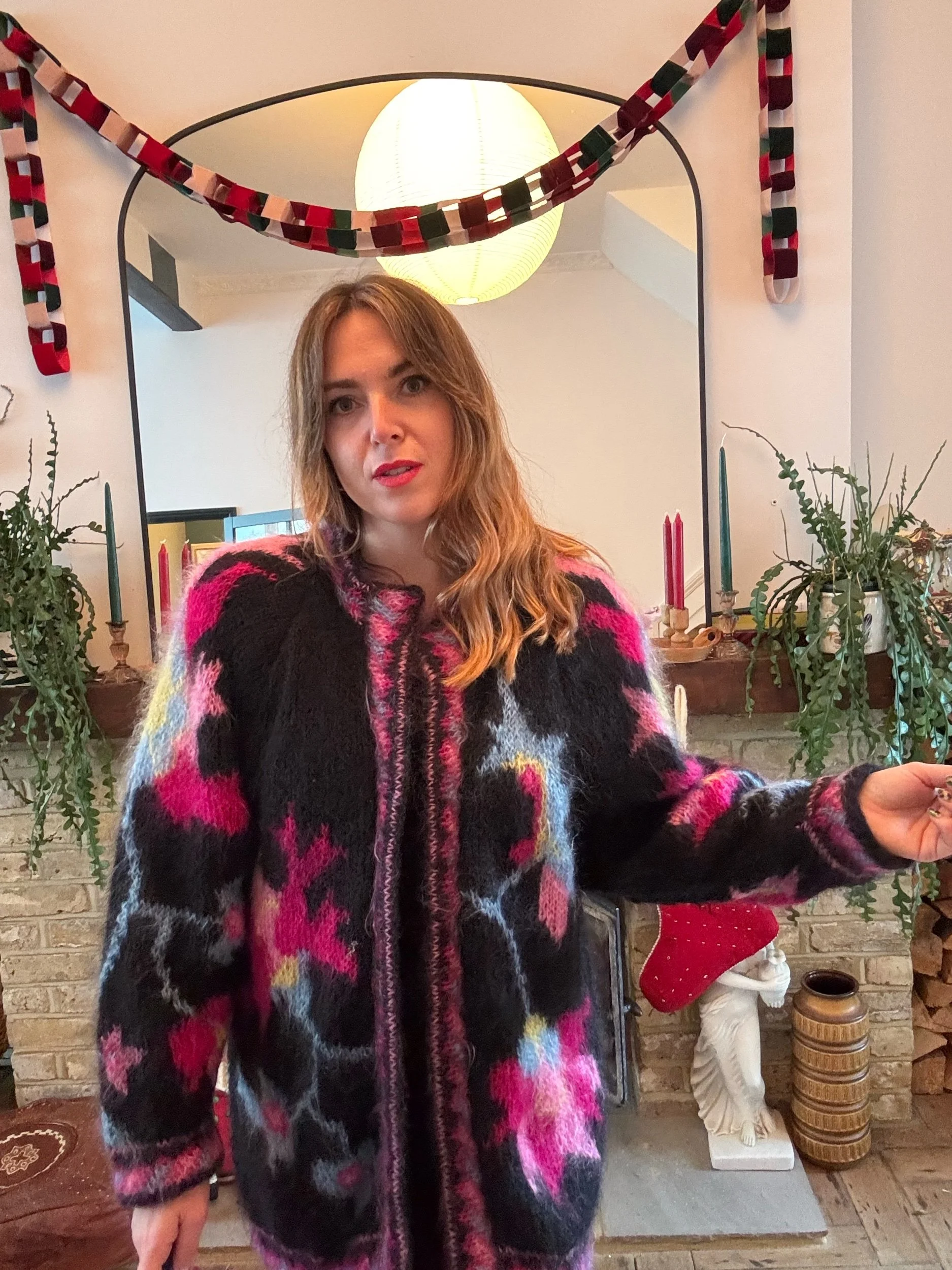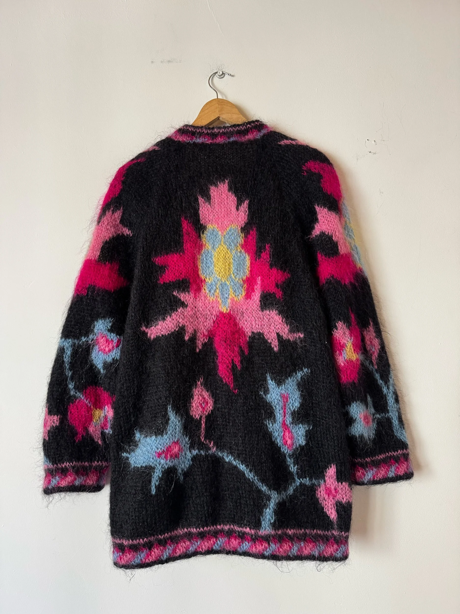 Divine mohair cardie with a super beautiful motif design on the back and sleeves. Beautiful jewel colours and oversized feel. I added a few hook and eyes so it can fasten. Looks fab worn open too’