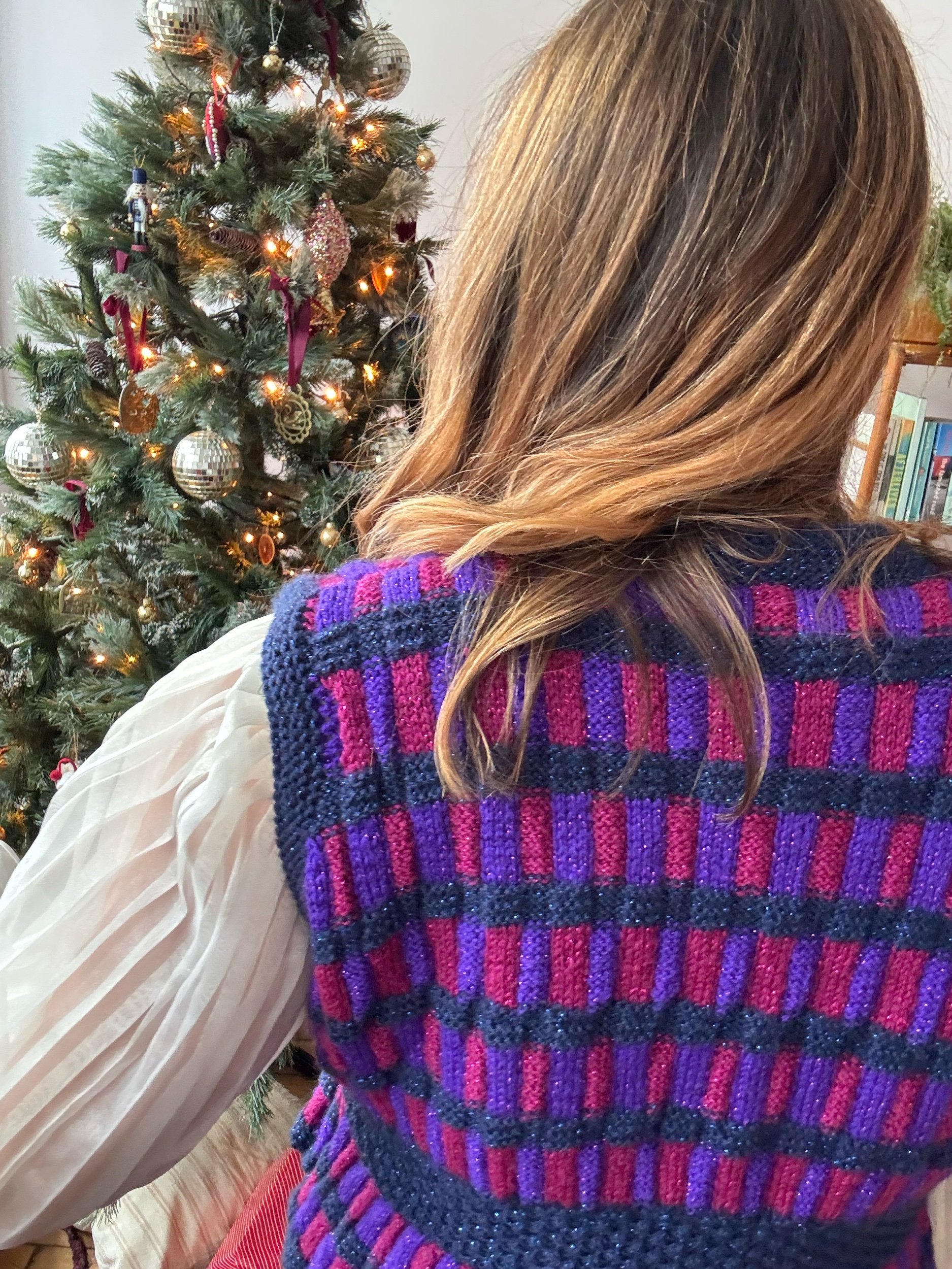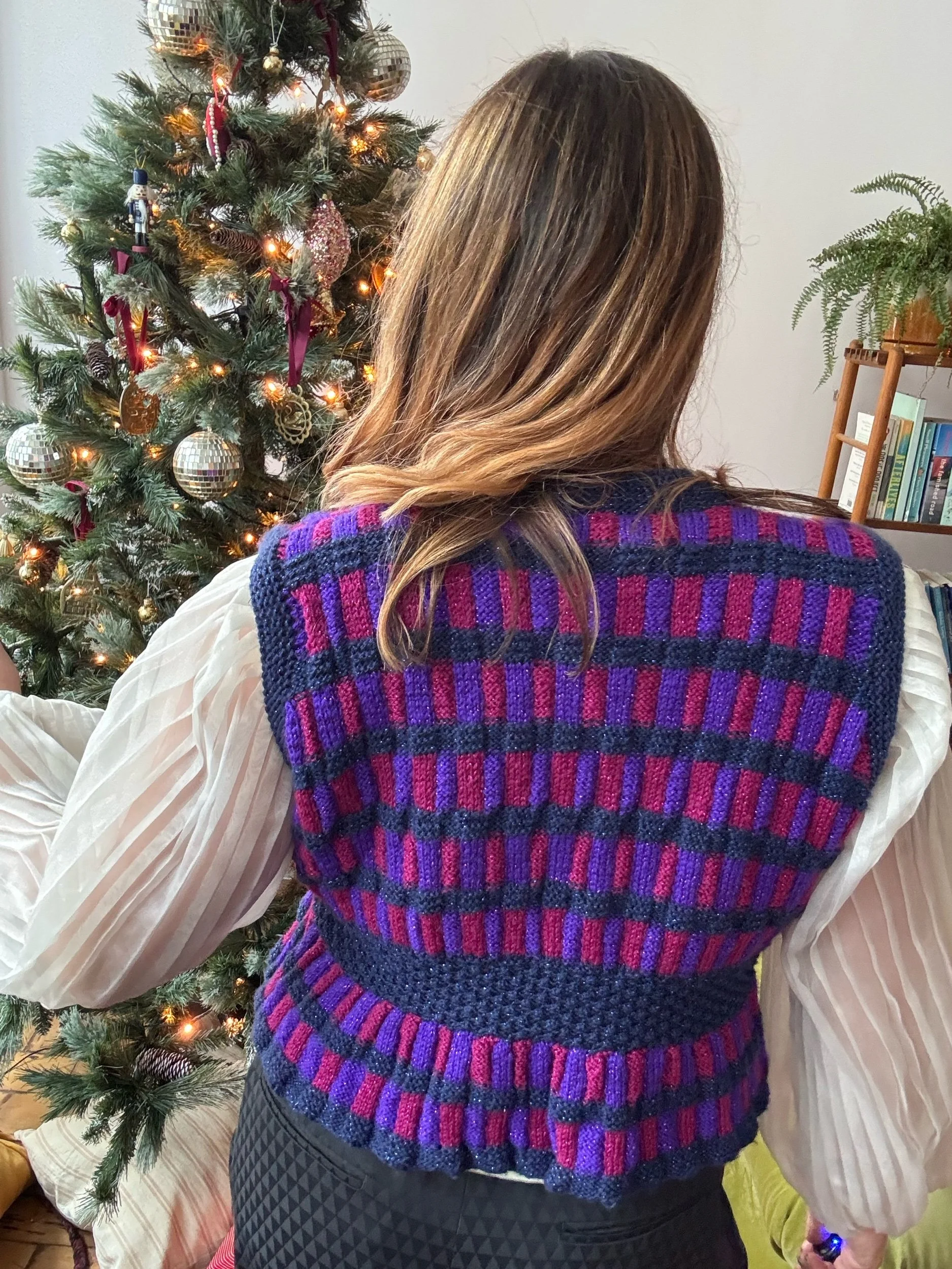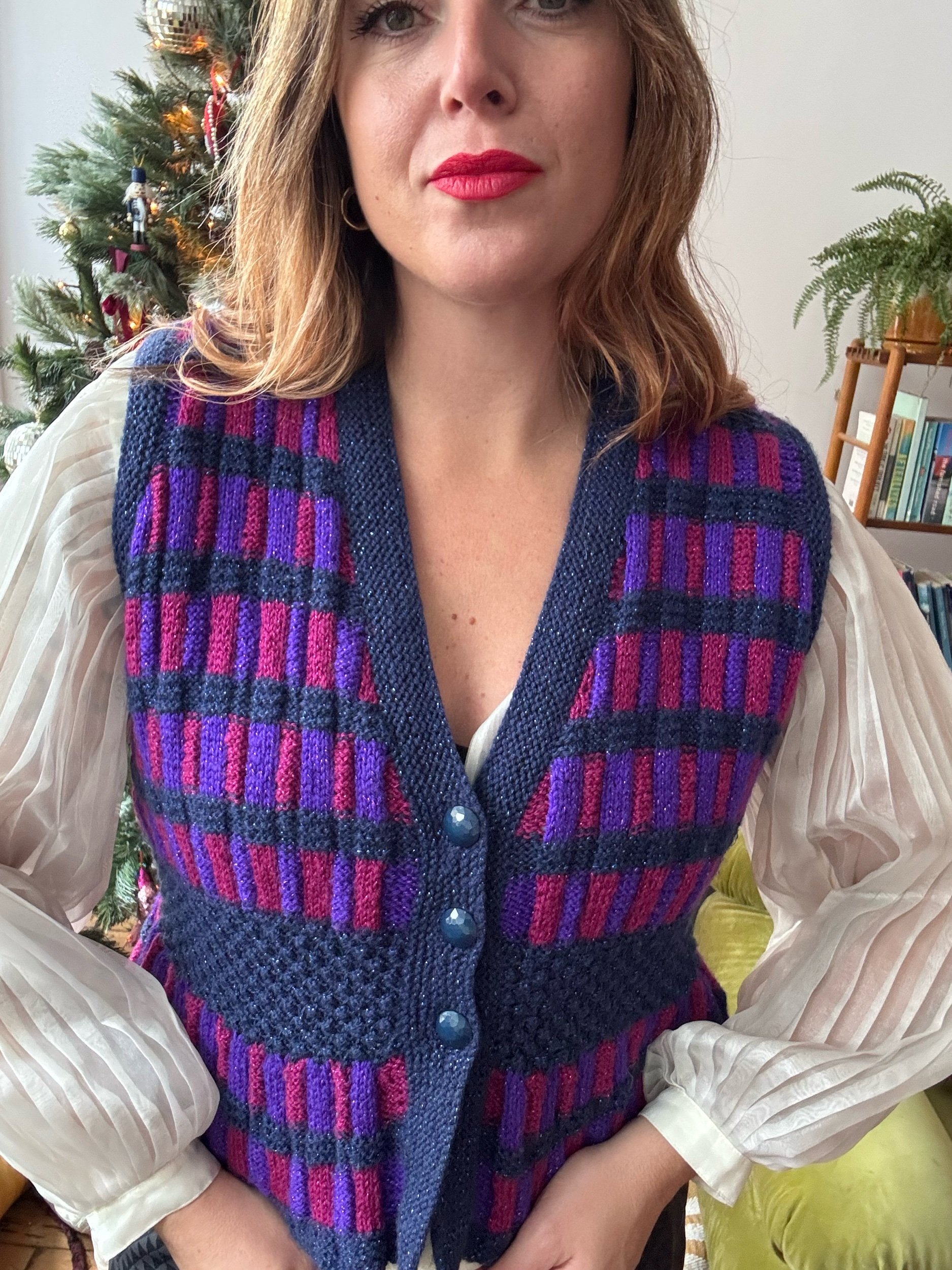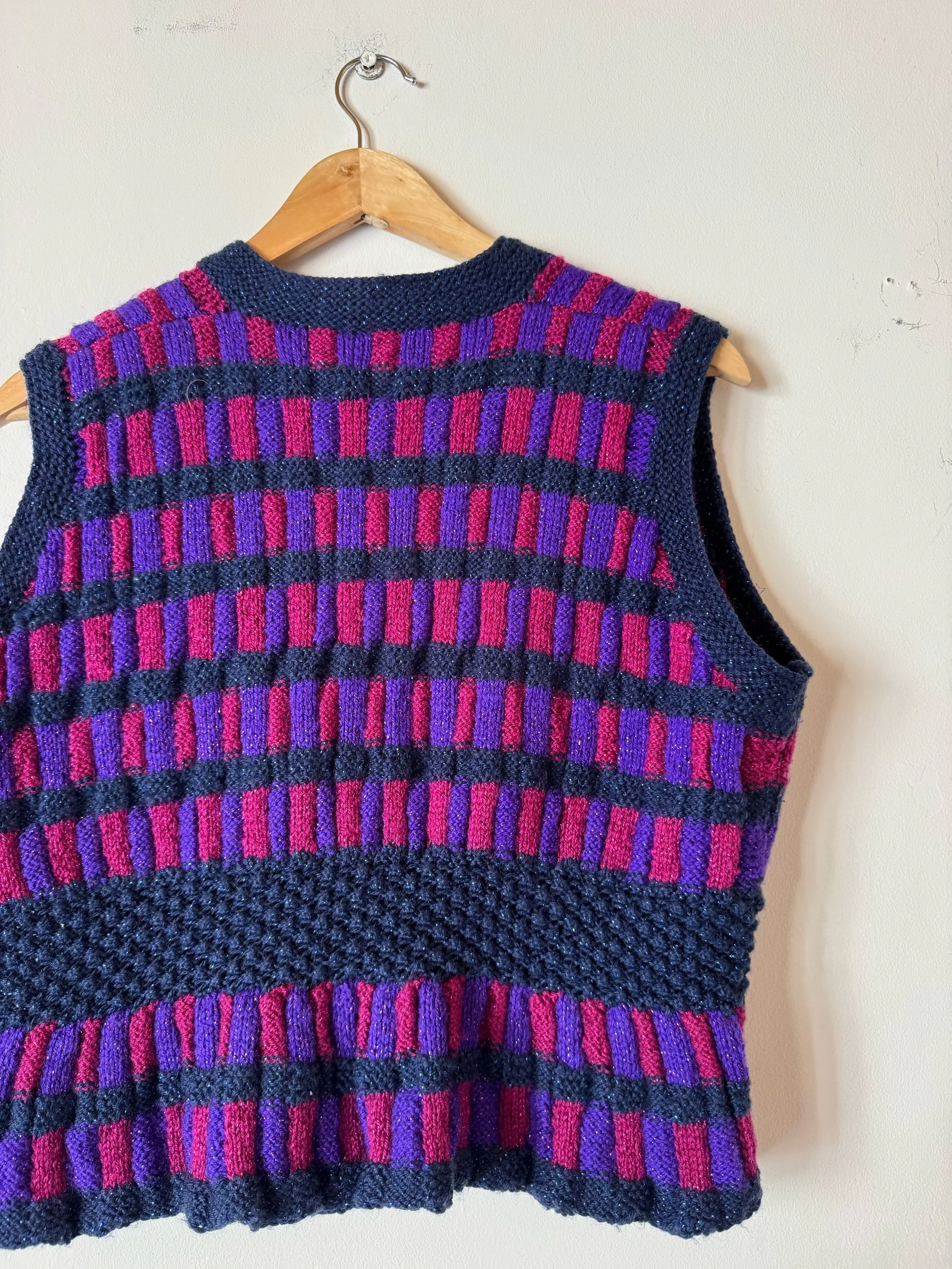 Such a cool hand knitted vest. Love the glittery yarn and jewl purple and pink palette. Nips in at the waist and looks ace paired with a white blouse underneath