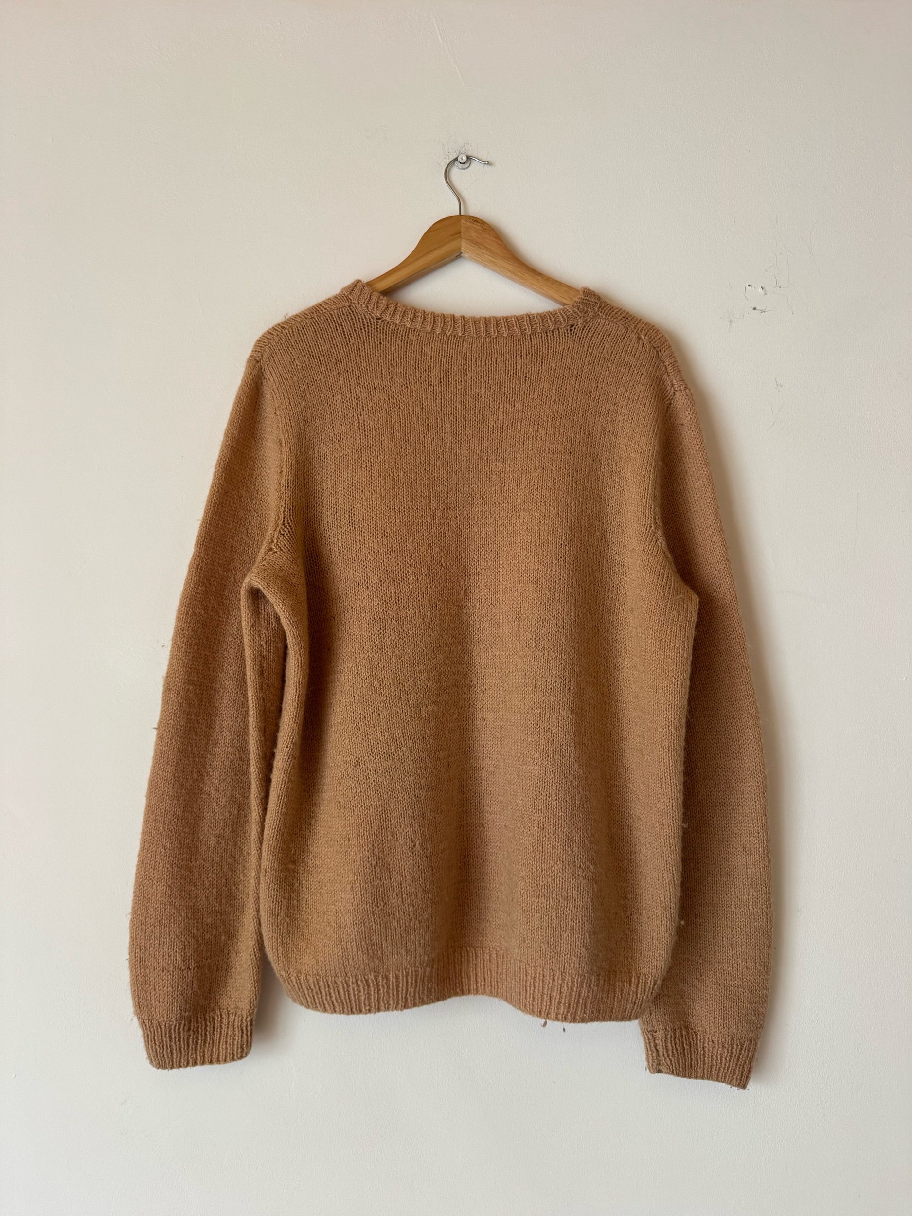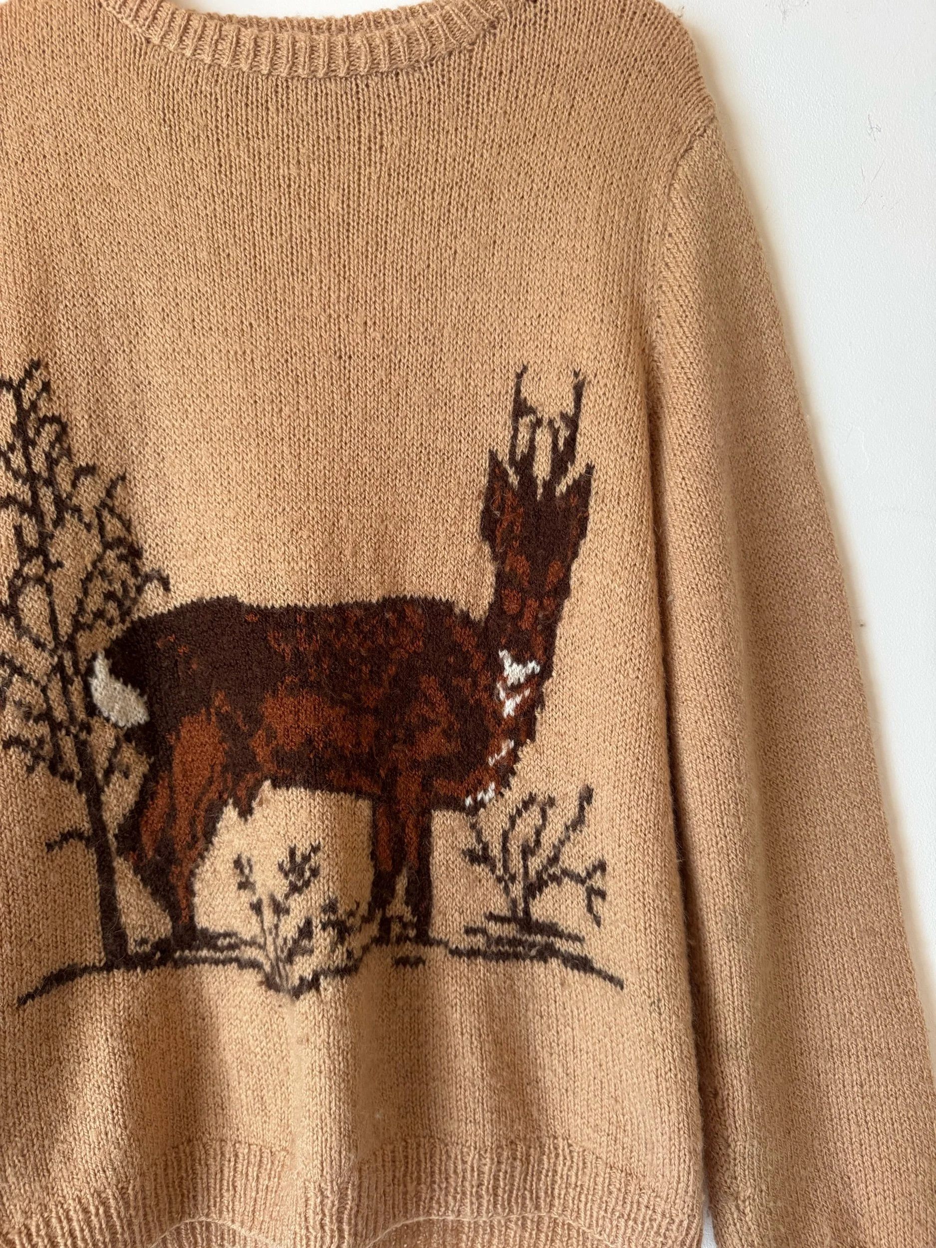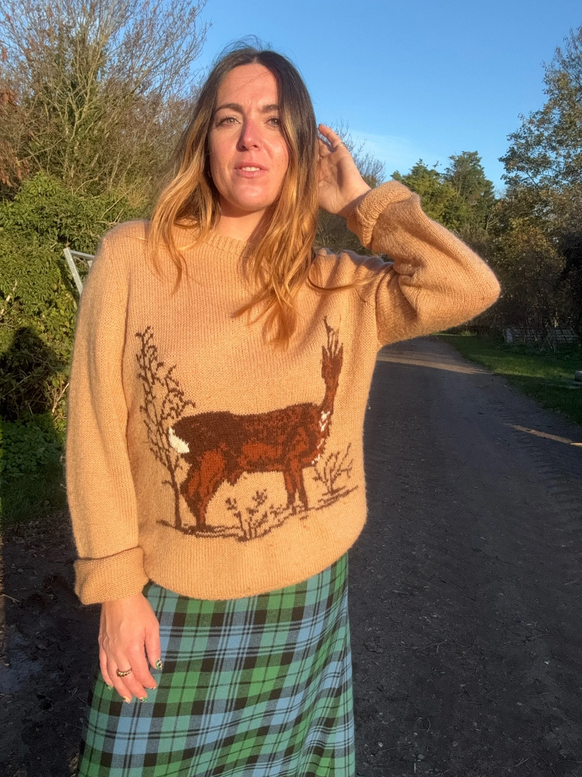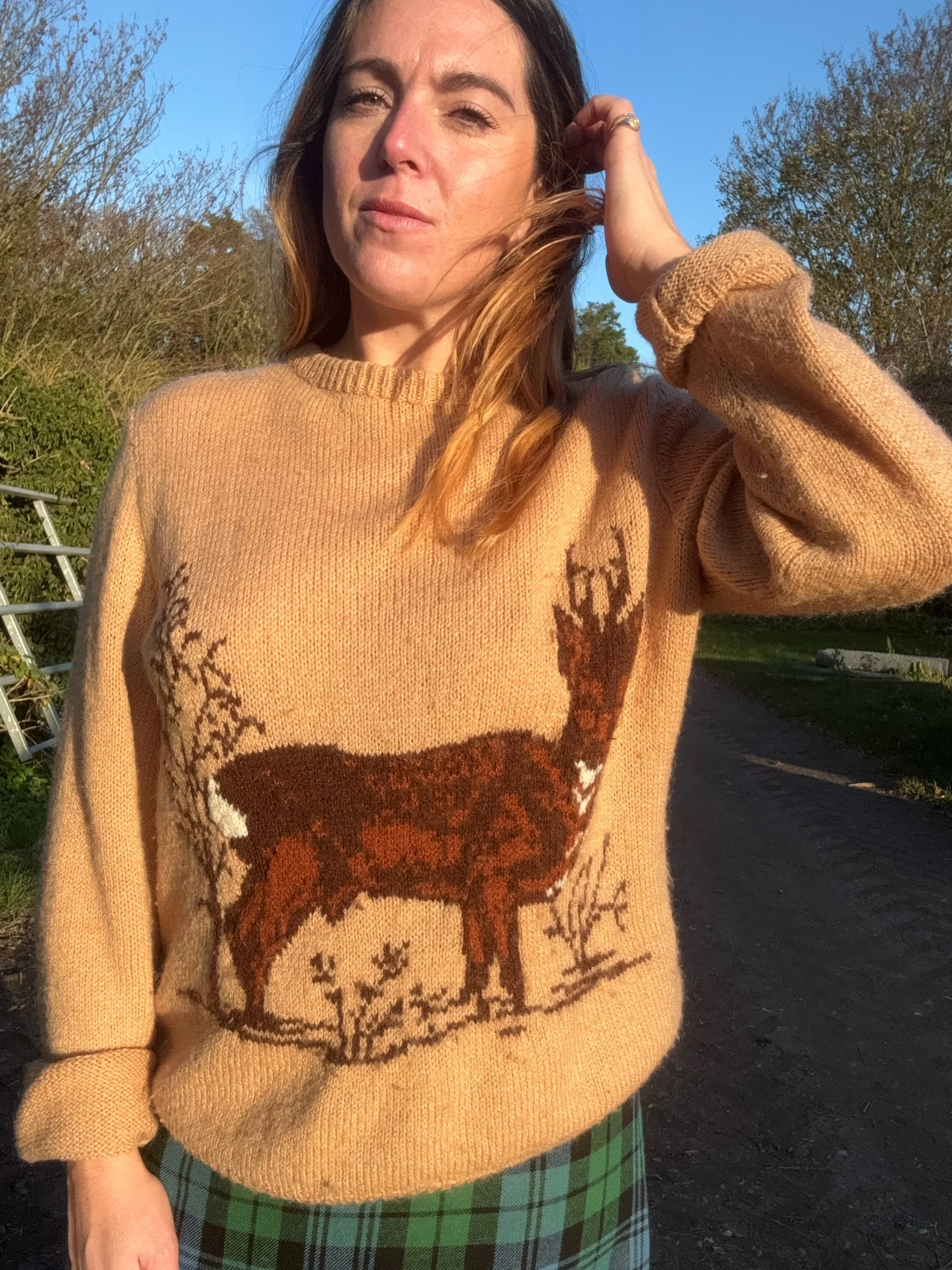 Gorgeous hand knitted deer jumper , such a great fit and drape to the yarn. Soft caramel base colour and chestnut brown deer motif on the front. Looks great paired with anything tartan!