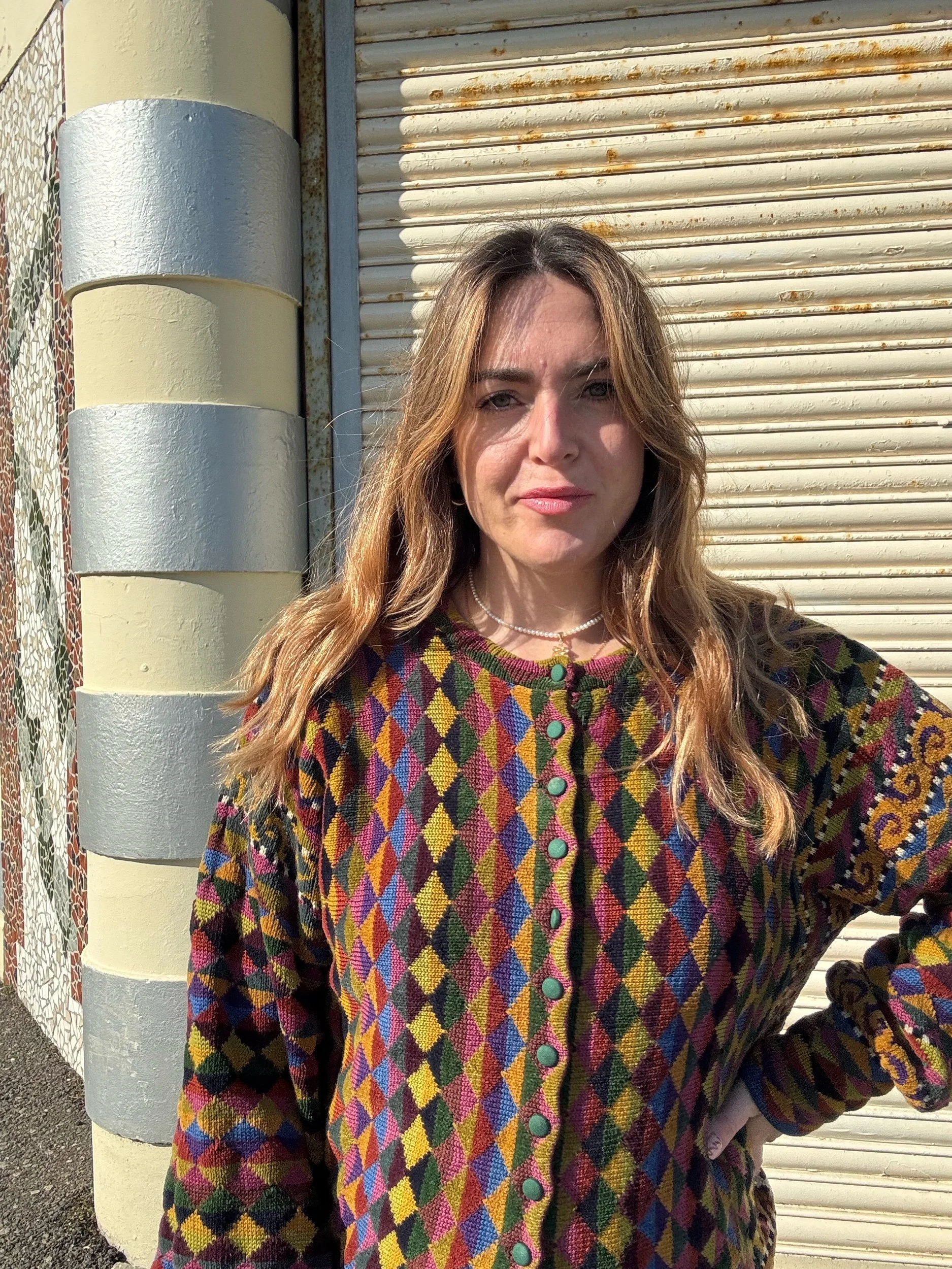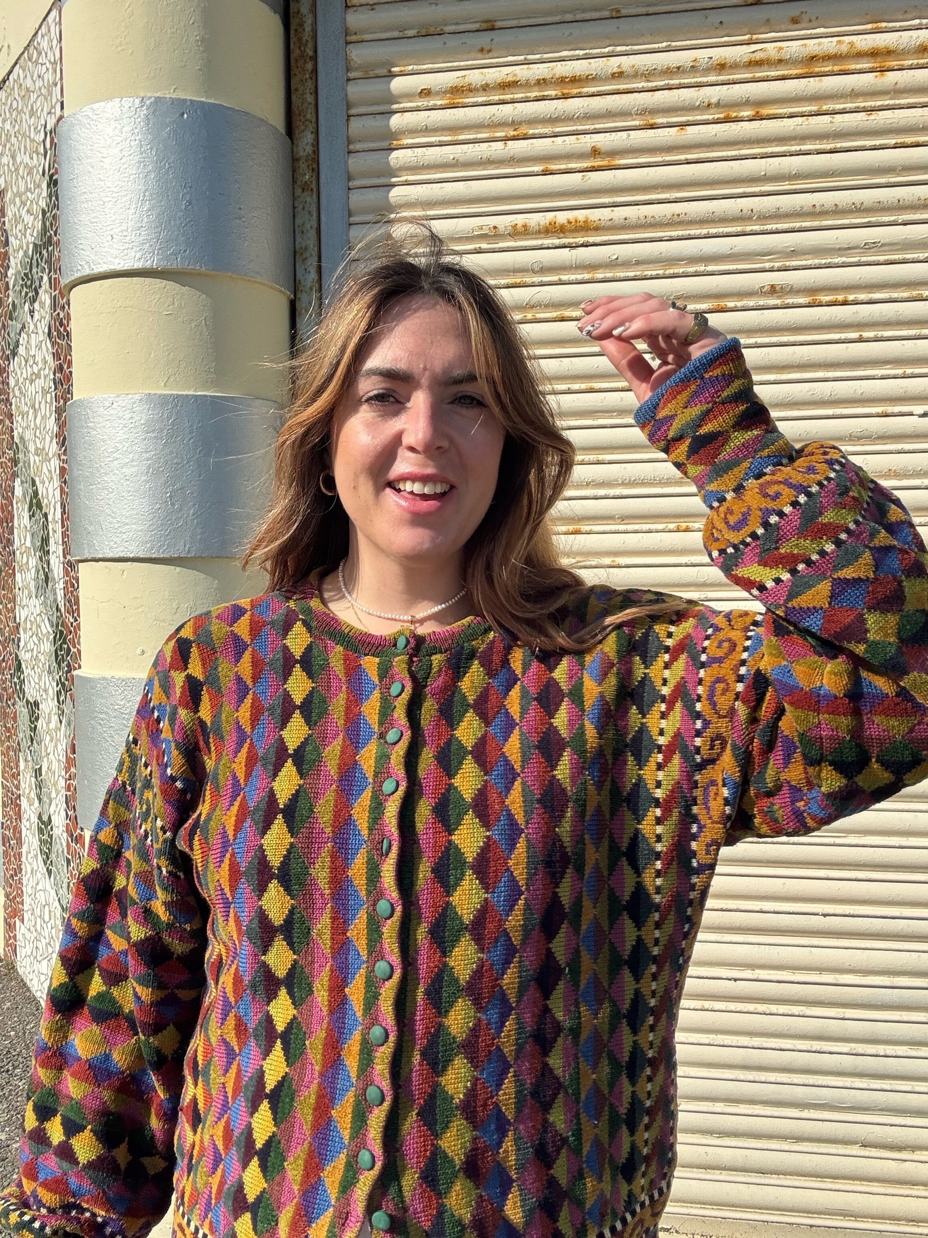 Super rare Maggie White original. Absolutely epic colour palette and argyle pattern. The stitching has all been done by hand. Gorgeous capped cuffs to really excentuate the balloon sleeves. Such a beautiful piece, this is a reluctant sell.